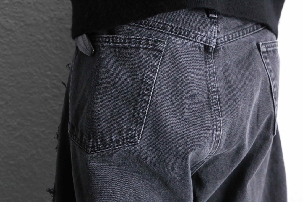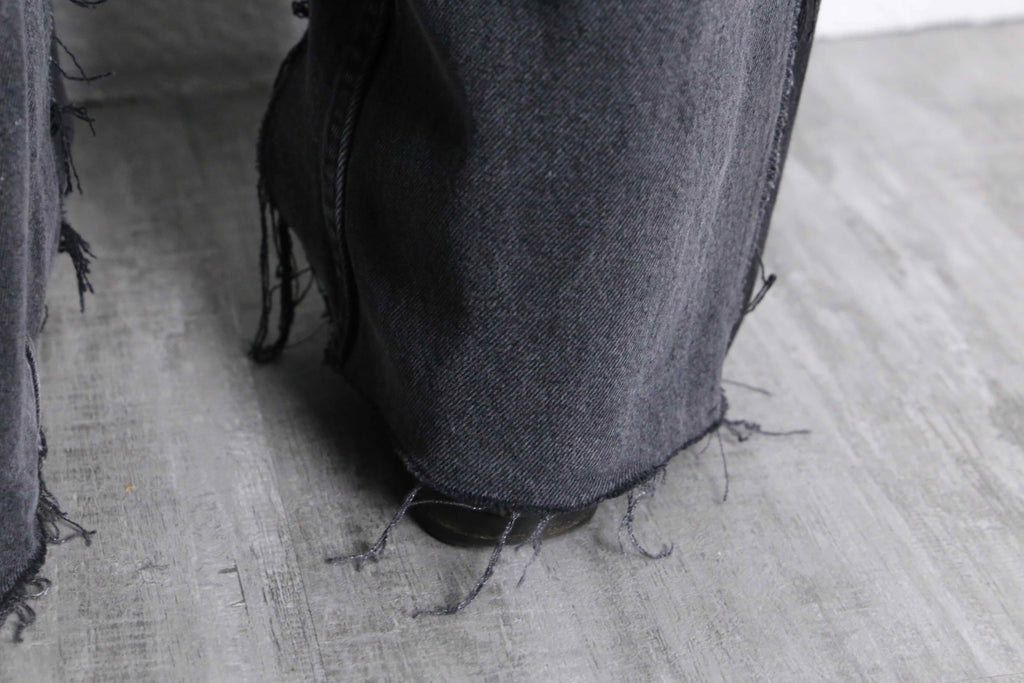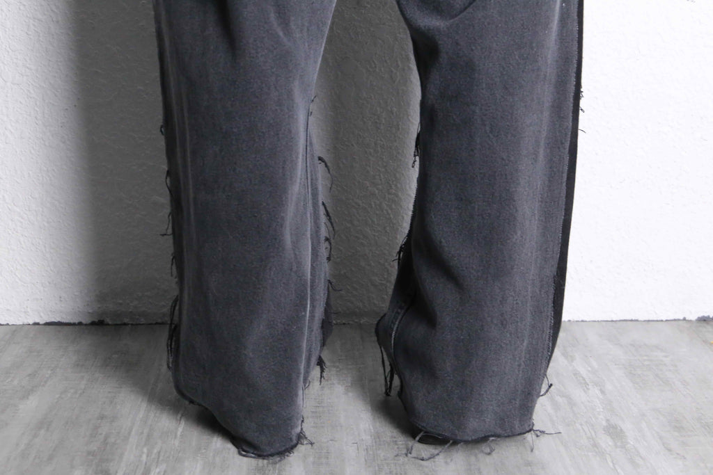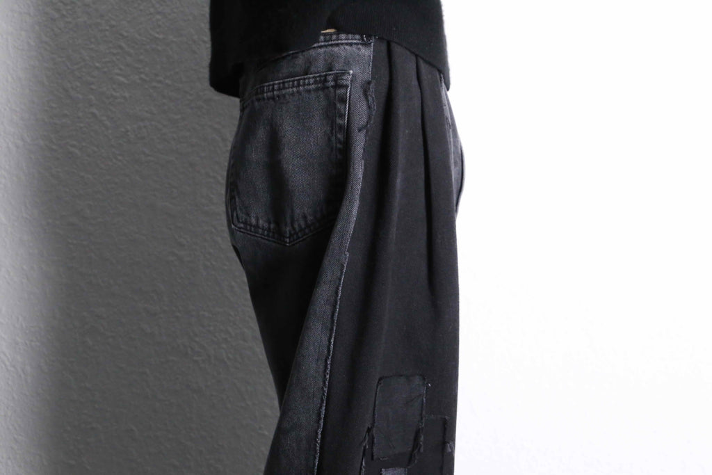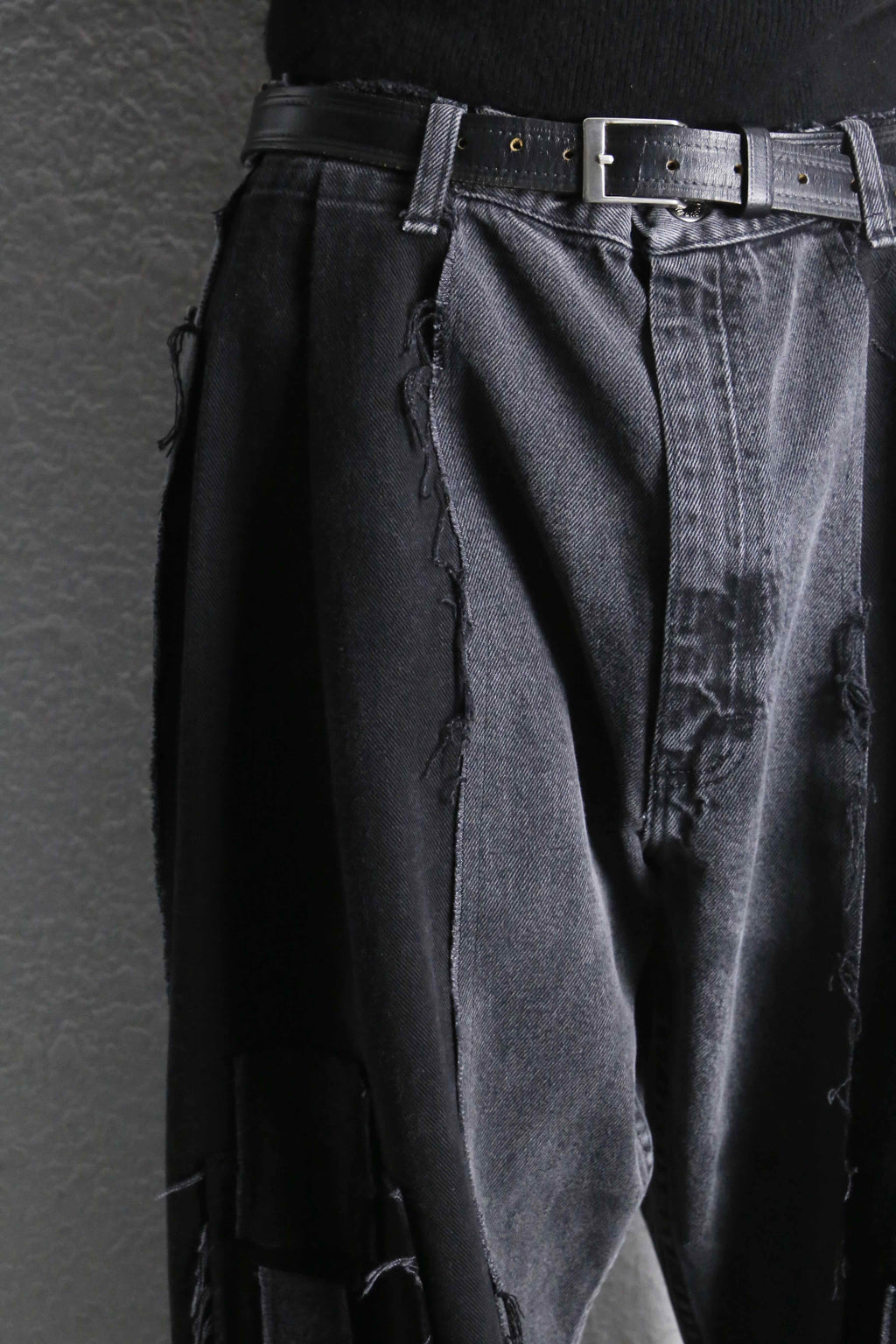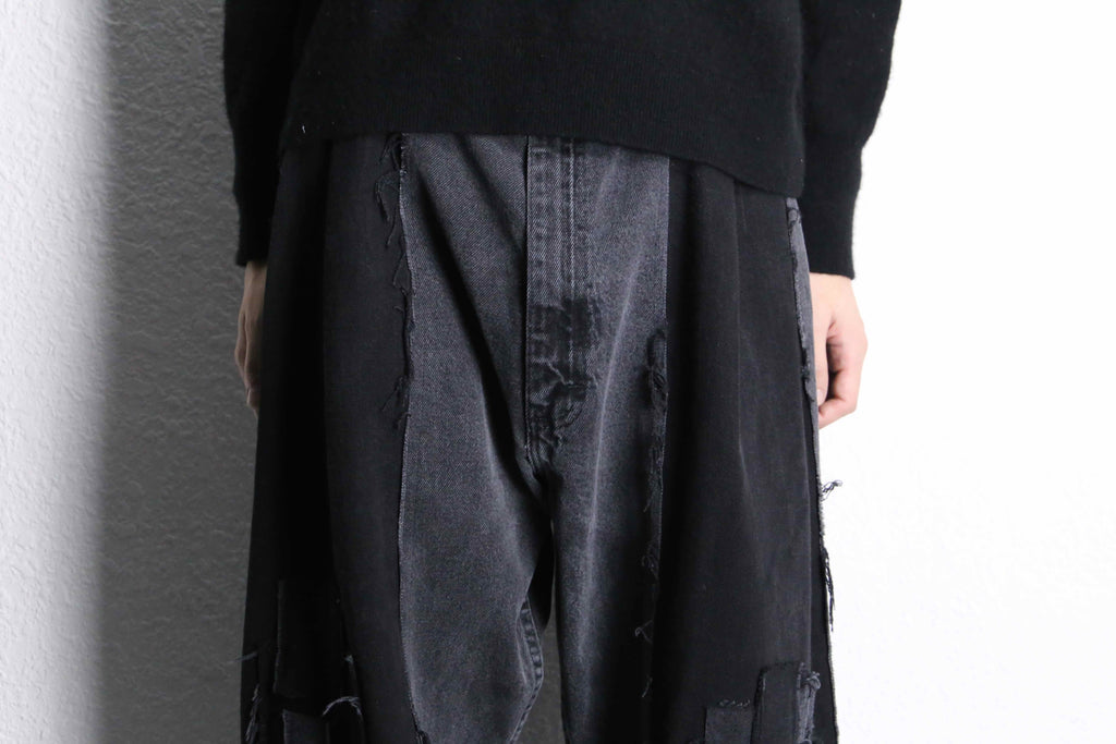黒デニムを軸に、別布をゆったり重ねて再構築したボトムス。