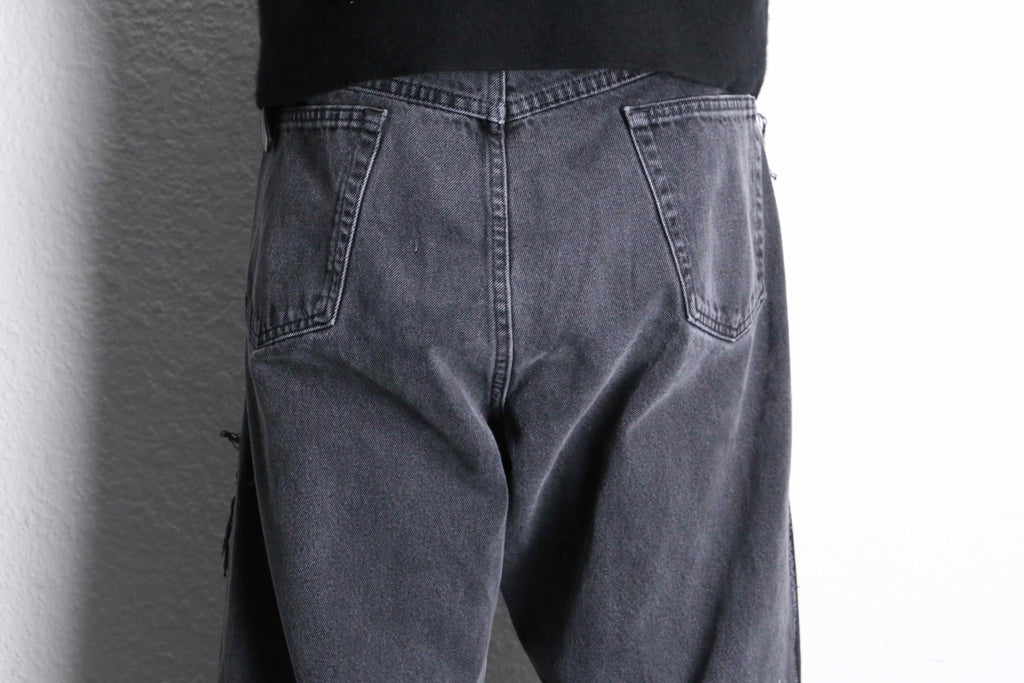 無造作に貼られたパッチの陰影と、センターを走る枯れたグレーの色落ち。その二つが重なり合うことで、静かな迫力と、どこか侘びたような深みが生まれています。歩くたびに黒の階調がゆらぎ、古着らしい荒さと、時間の澱のような味わいが同時にのぞきます。
