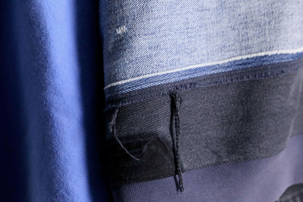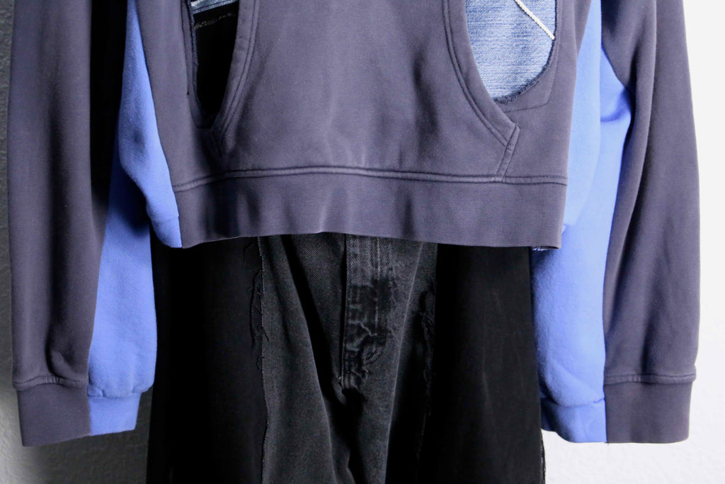 フロントに大胆なデニムパッチワークをあしらった、存在感抜群のリメイクフーディーがオンラインに入荷。