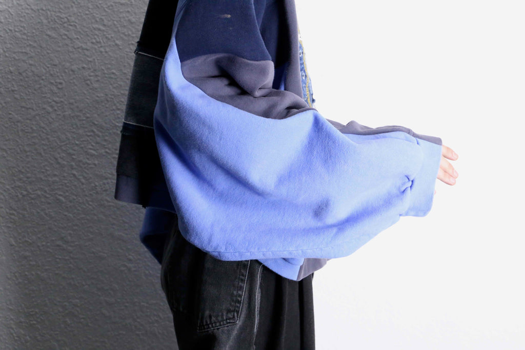 さまざまな色味のデニムや糸をランダムに組み合わせ、立体感のあるデザインに仕上げた一着。ボディは落ち着いたブルーとネイビーをミックスした切り替え仕様で、ユニセックスで着られるゆったりシルエット。コーデの主役になる一枚で、日常使いから個性的なスタイルまで幅広く活躍します。
