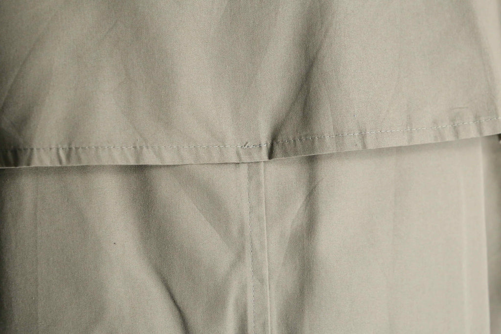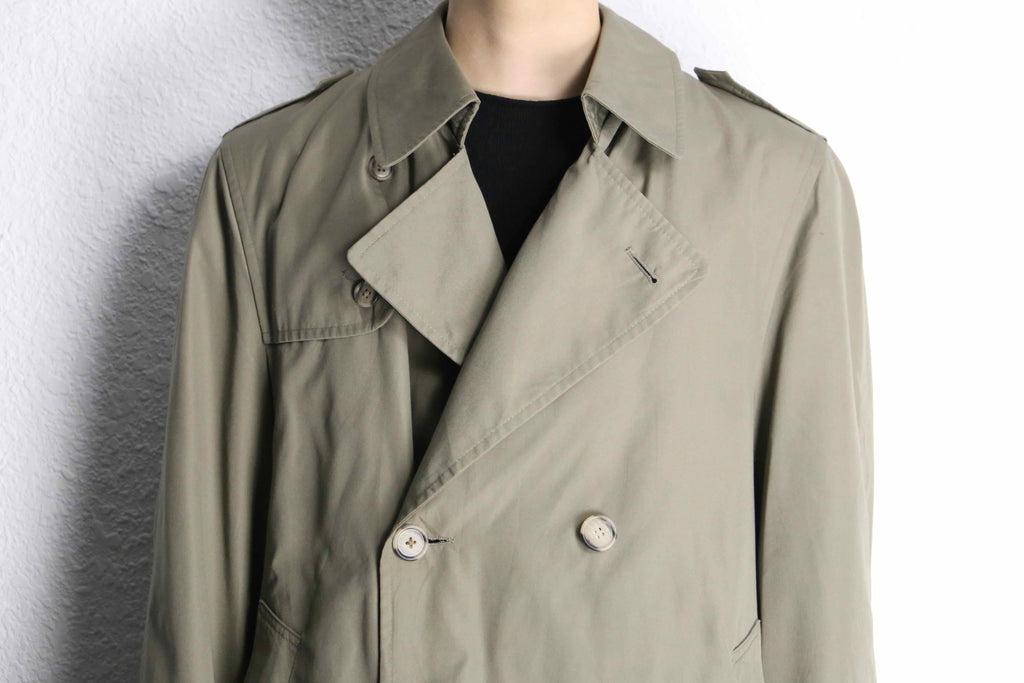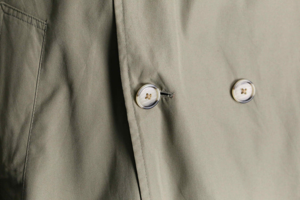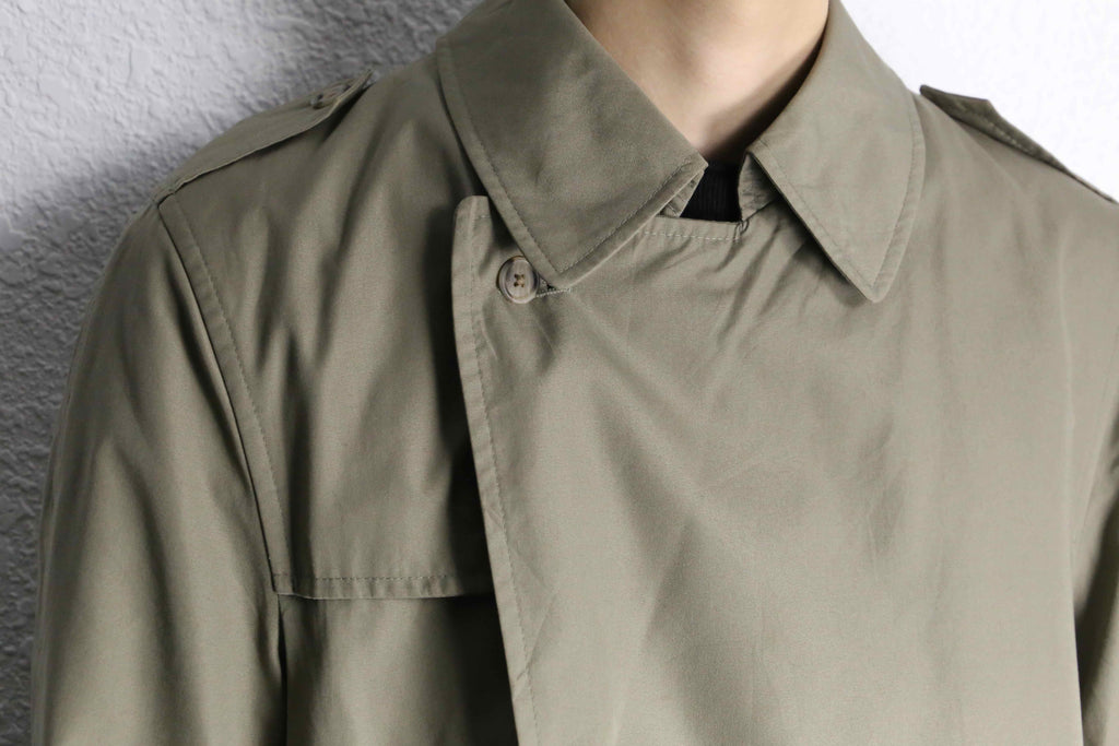 グリーンに映えるボタンの配色はもちろん、トレンチコートらしいエポレットやガンフラップというディテールも詰め込まれている1着。着丈は107cmとミドル丈のサイジング。1枚で主役級とはまさにこのことかと。