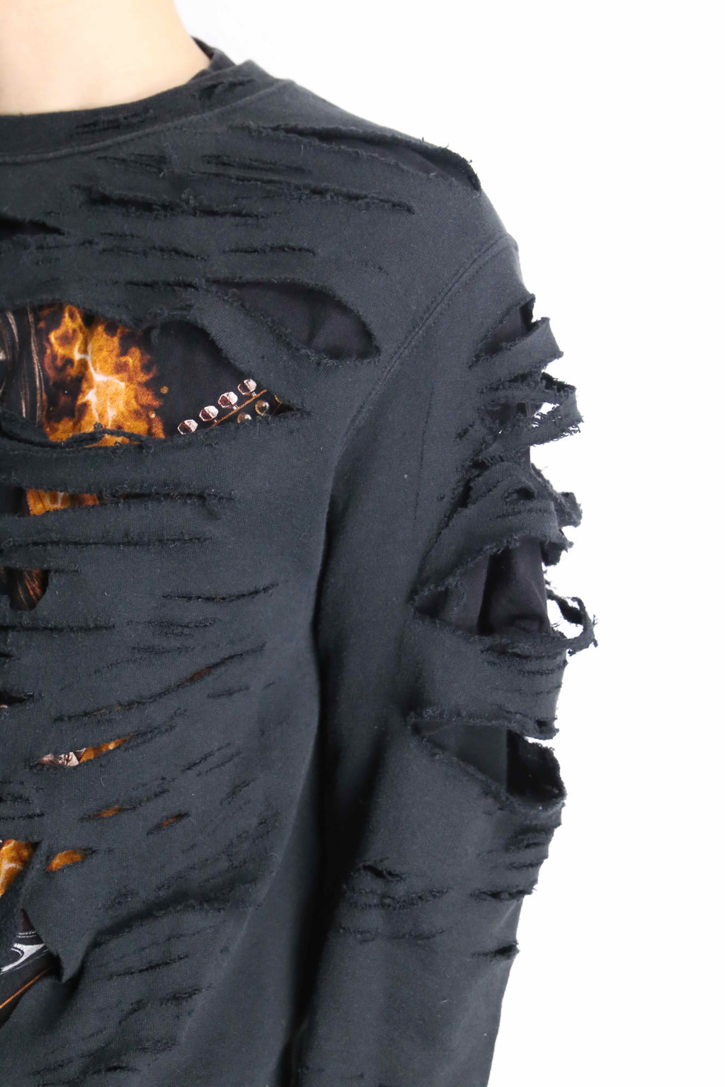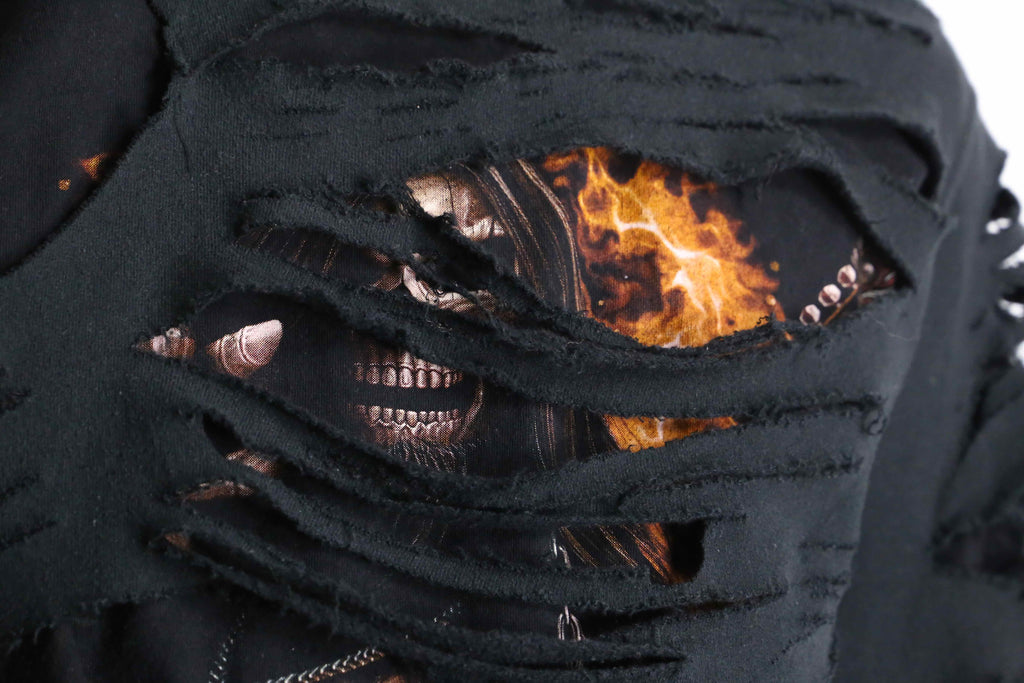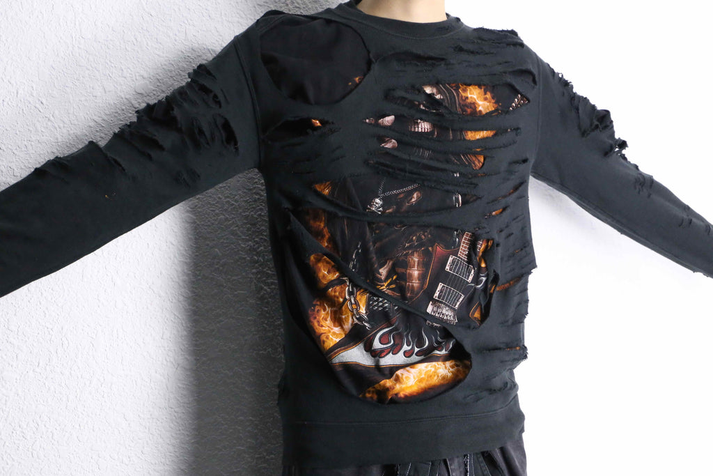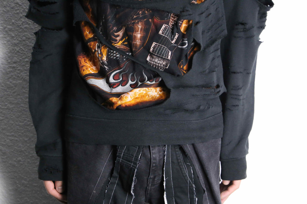 Tシャツの上から、ボロ加工を施した黒スウェットを重ねてドッキングすることで、こちら側を覗くようにして表れるギターを片手にしたスカルデザインとファイヤーパターンがなんとも印象的な1着。