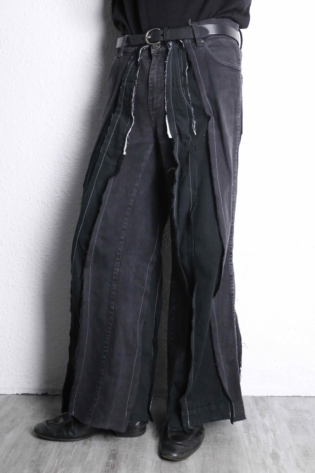 複数枚のデニムを繋ぎ合わせパッチワーク風のデザイン。繋ぎ目を外側に出すことより個性的な一本に。超絶ワイドでありながらもシルエットは崩れず、常に綺麗な状態を保ちます。歩くたびにデニムが揺れ動きを演出。