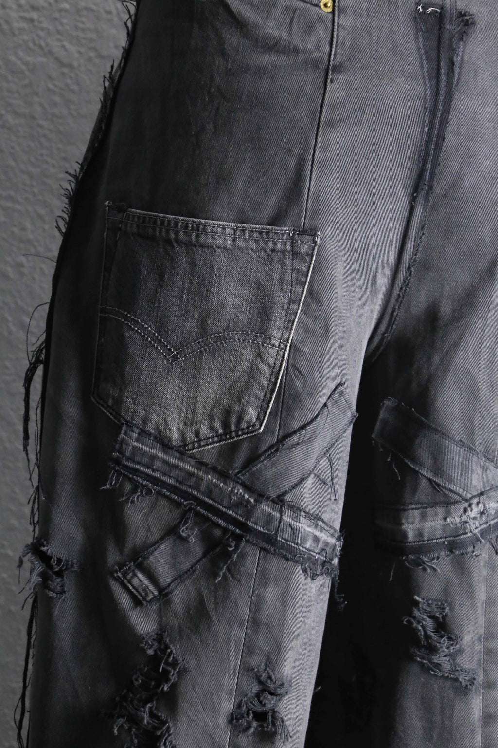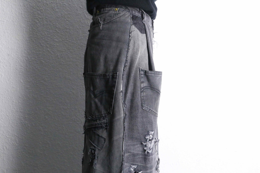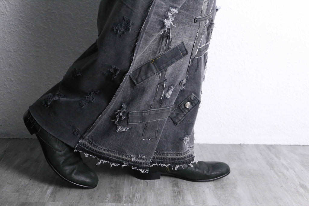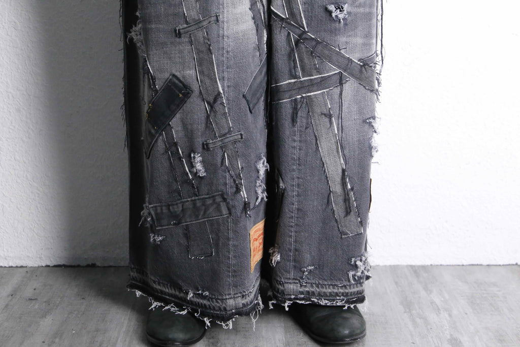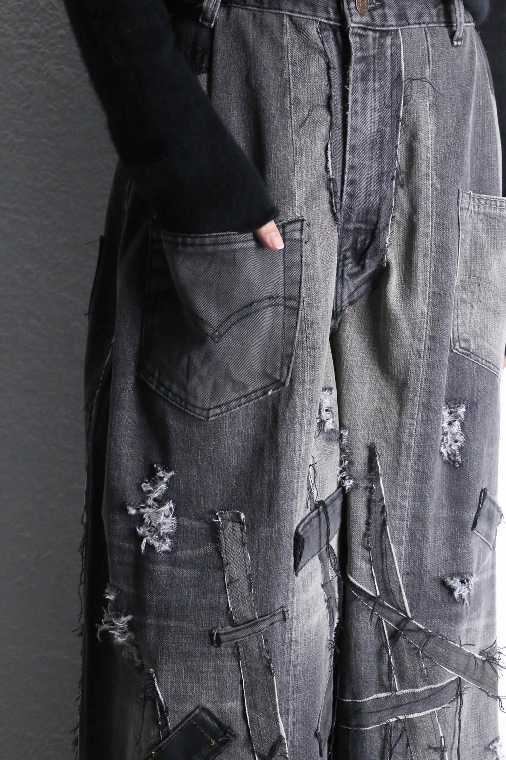 色味の異なるデニムを組み合わせることで、一本の中に自然な濃淡が生まれ、パッチワークやダメージ加工も含めて全体に表情のある仕上がりです。リメイク特有のラフさを残しつつ、過度に作り込みすぎないバランスにまとめられています。