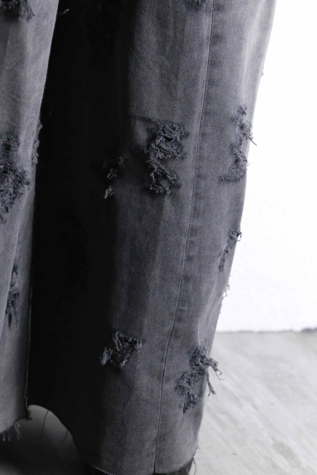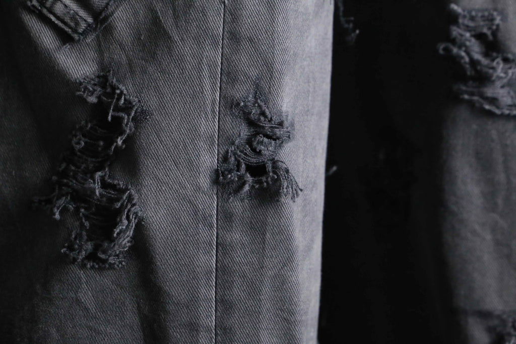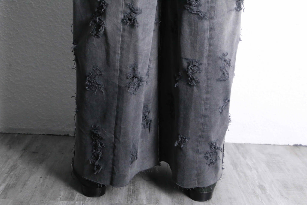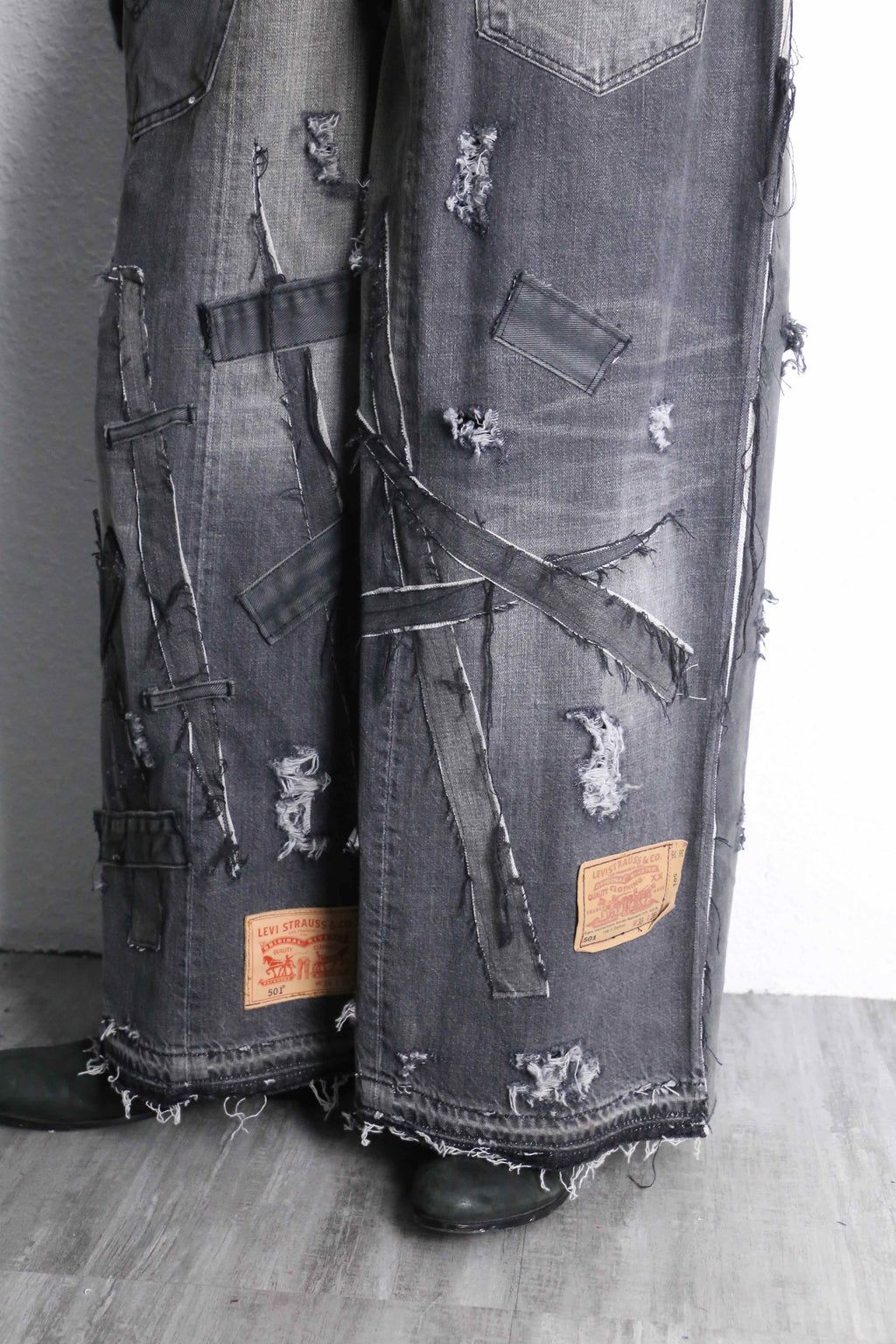 色味の異なるデニムを組み合わせることで、一本の中に自然な濃淡が生まれ、パッチワークやダメージ加工も含めて全体に表情のある仕上がりです。リメイク特有のラフさを残しつつ、過度に作り込みすぎないバランスにまとめられています。