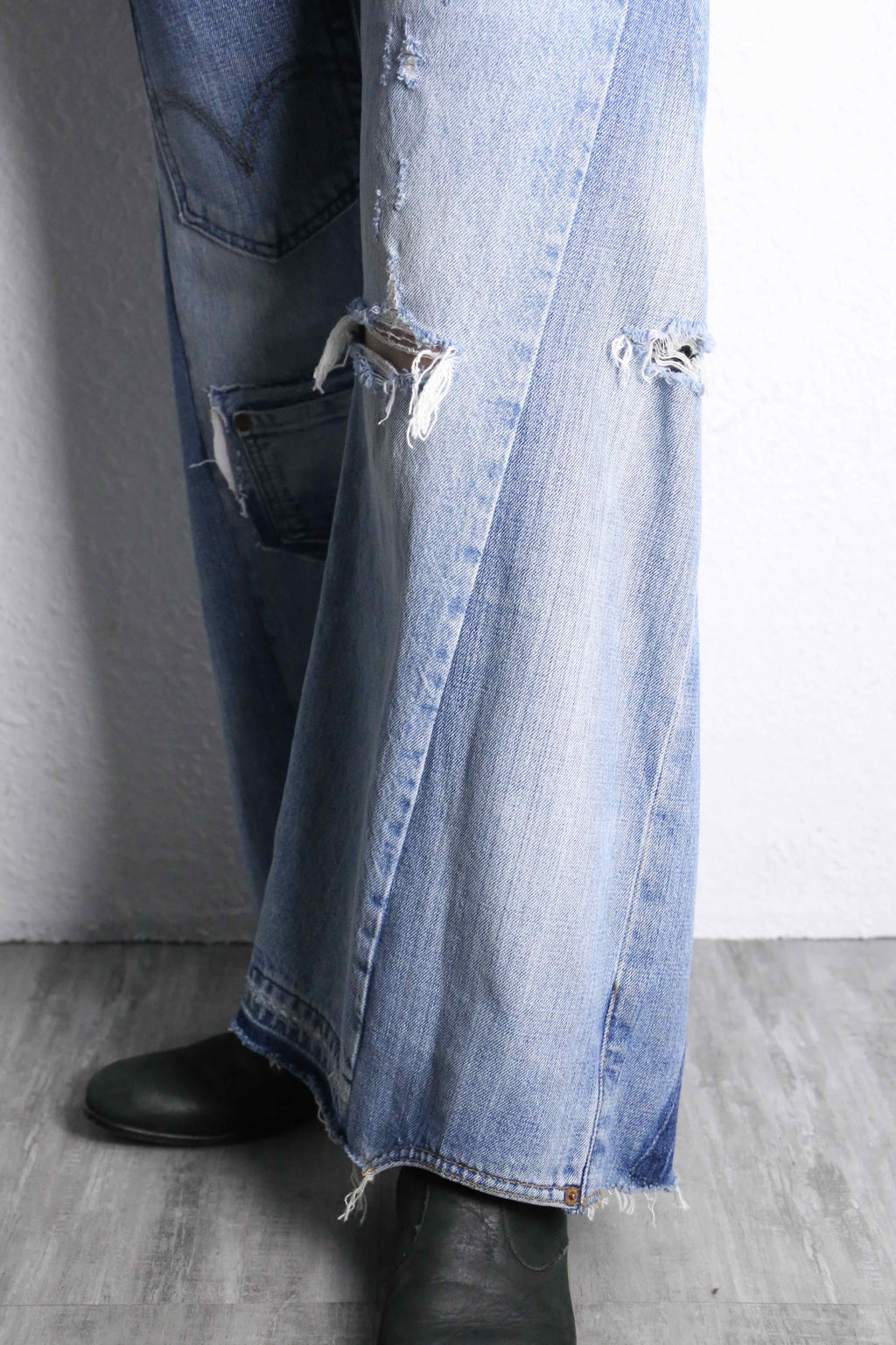 ワイドなストレートシルエットは、ルーズでありながらも縦のラインを強調し、スタイリングに自然な存在感をプラスされており、随所に施されたダメージ加工や断ち切りの裾がラフな雰囲気を演出しています。