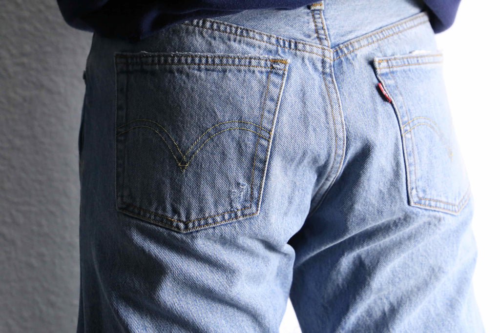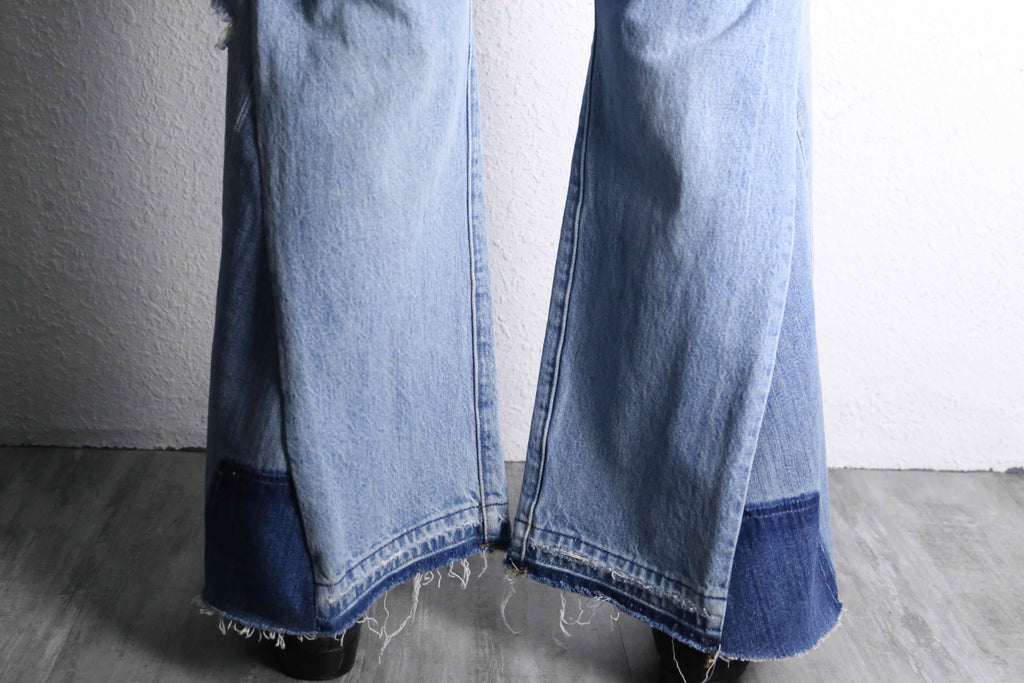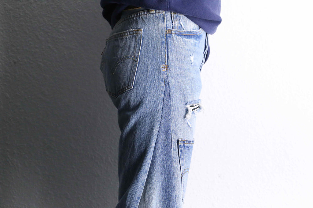 当店人気のリメイクアイテムよりヴィンテージデニムをベースに、複数のポケットやダメージを再構築したリメイクデニムパンツが入荷しました。