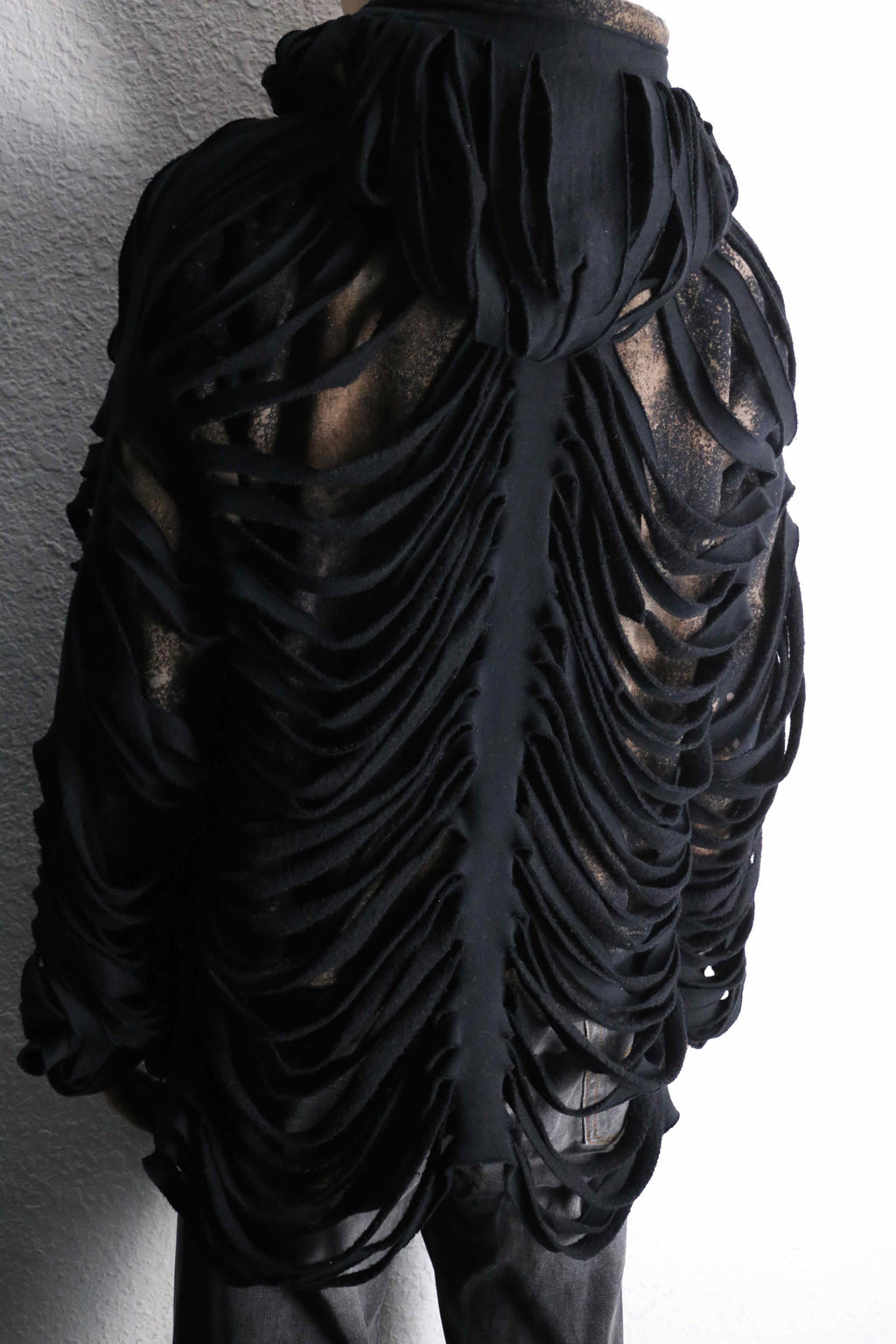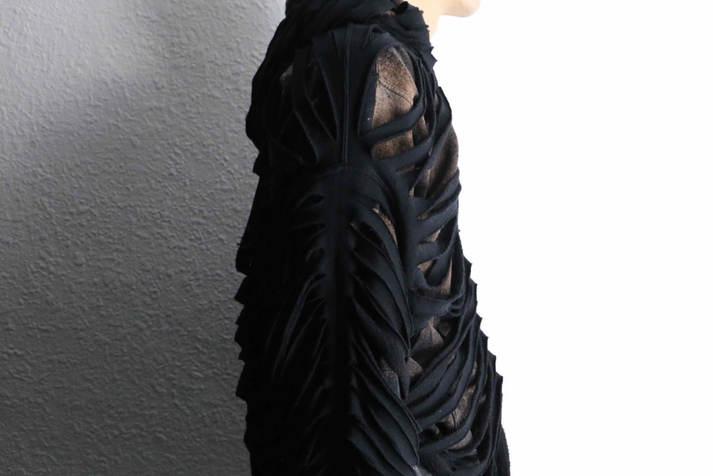 フロントから背面にかけて流れるように配置されたスリット状のディテールは、まるで骨格や筋のラインを演出させる一着です。是非。