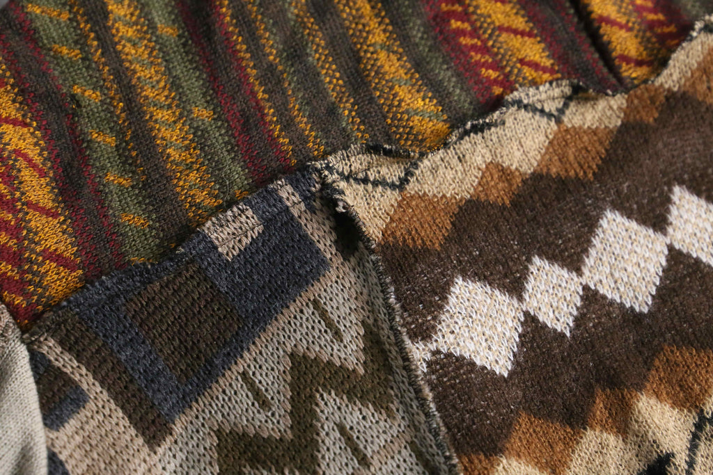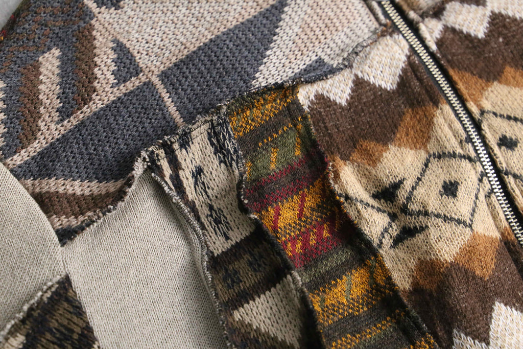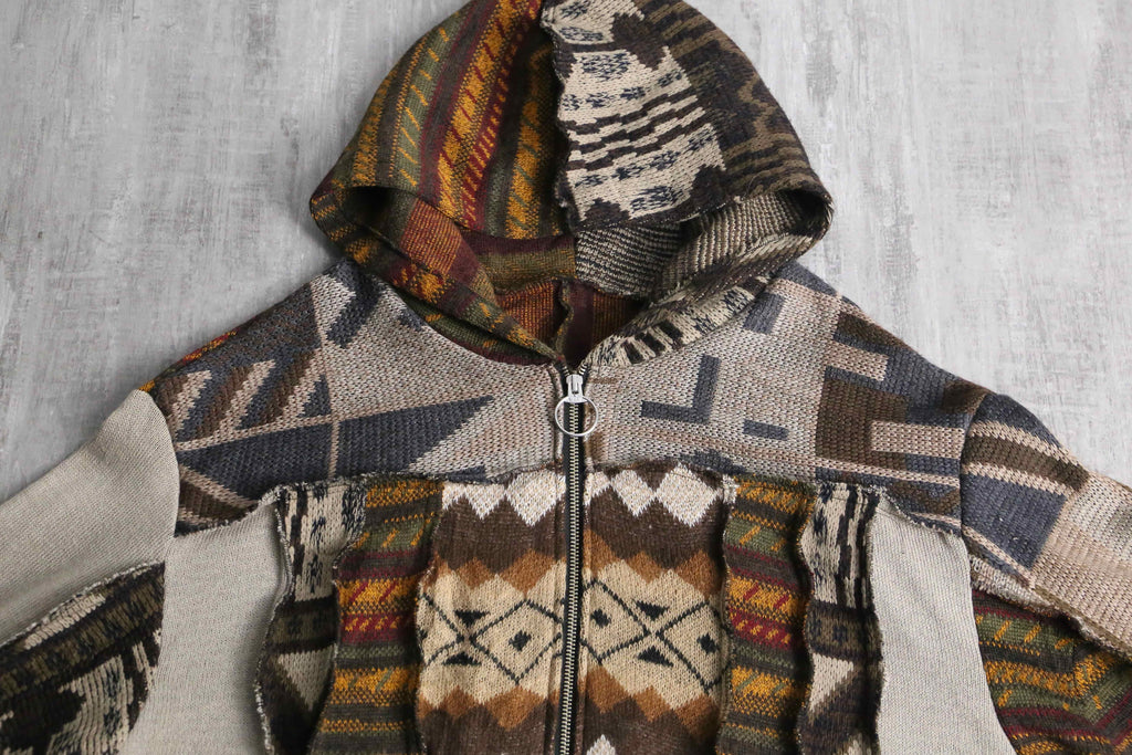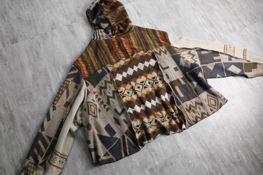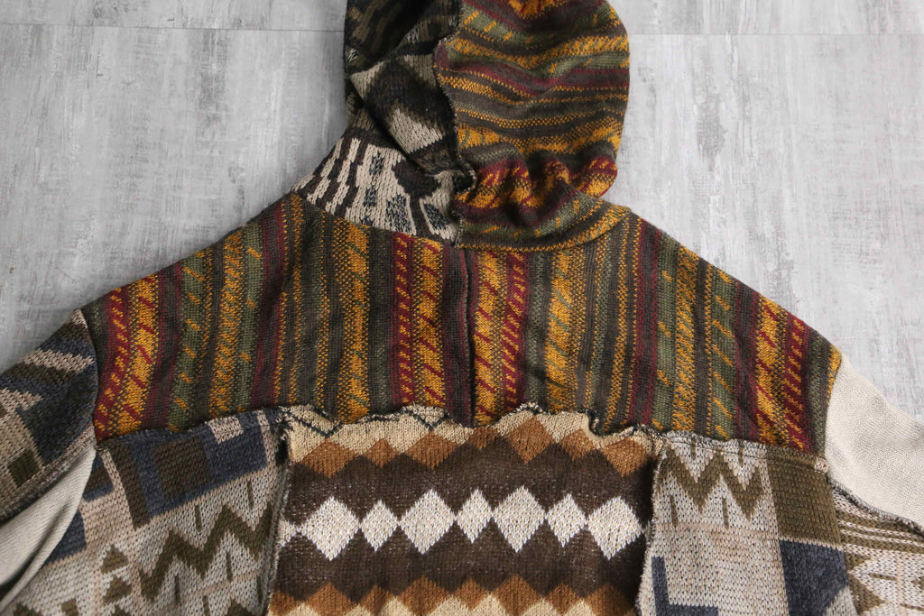 エスニック調や幾何学柄、落ち着いた配色のニットをパッチワーク状に組み合わせることで、奥行きのある表情と温かみのある雰囲気を持つ一着に仕上げています。フードからボディ、袖にかけて異なる柄や編み地を使用しており、見る角度によって印象が変わるのも魅力。フロントはジップ仕様で着脱しやすく、軽めのアウターとしてはもちろん、インナーとのレイヤードスタイルにも取り入れやすいデザインです。