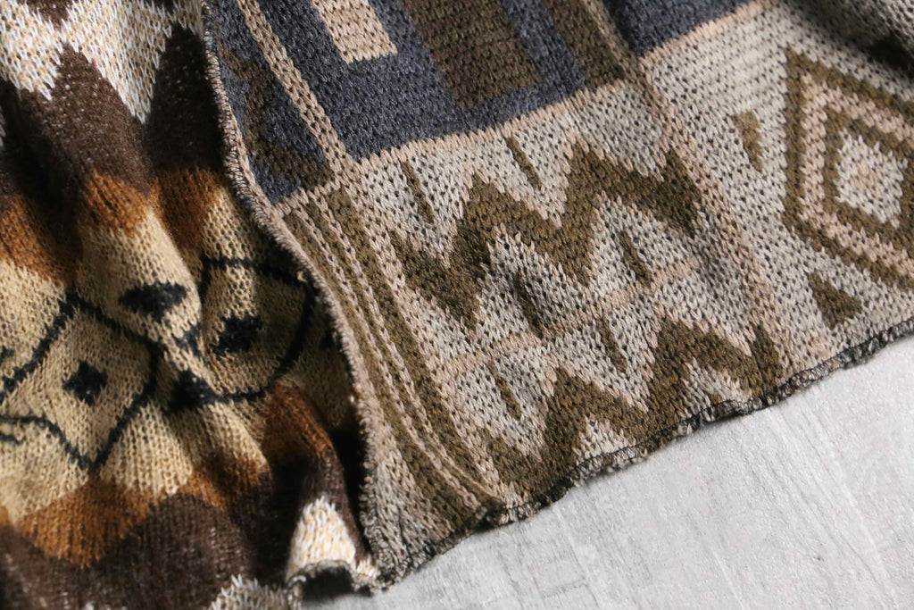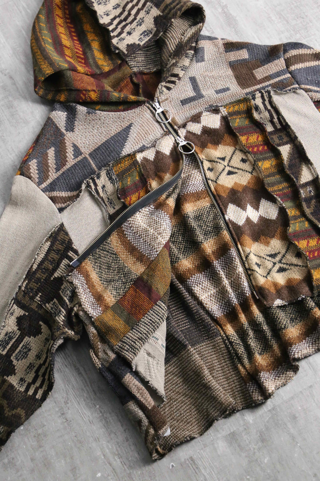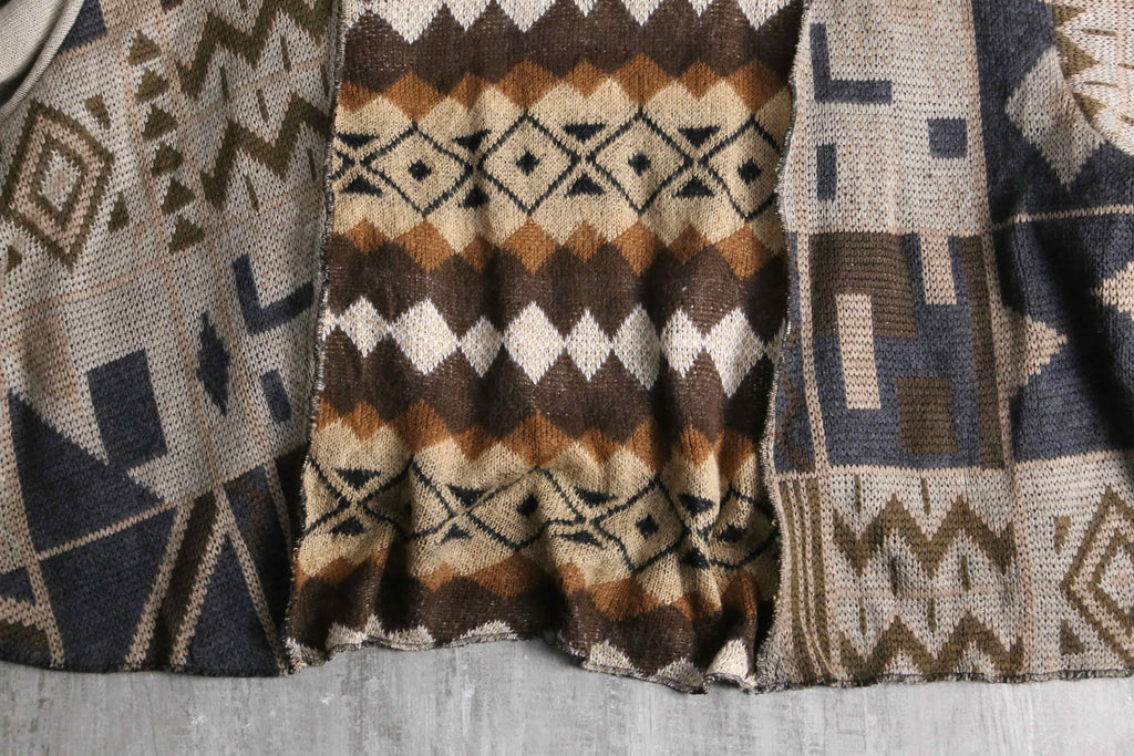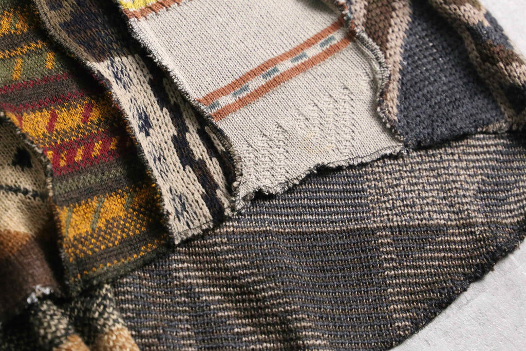エスニック調や幾何学柄、落ち着いた配色のニットをパッチワーク状に組み合わせることで、奥行きのある表情と温かみのある雰囲気を持つ一着に仕上げています。フードからボディ、袖にかけて異なる柄や編み地を使用しており、見る角度によって印象が変わるのも魅力。フロントはジップ仕様で着脱しやすく、軽めのアウターとしてはもちろん、インナーとのレイヤードスタイルにも取り入れやすいデザインです。
