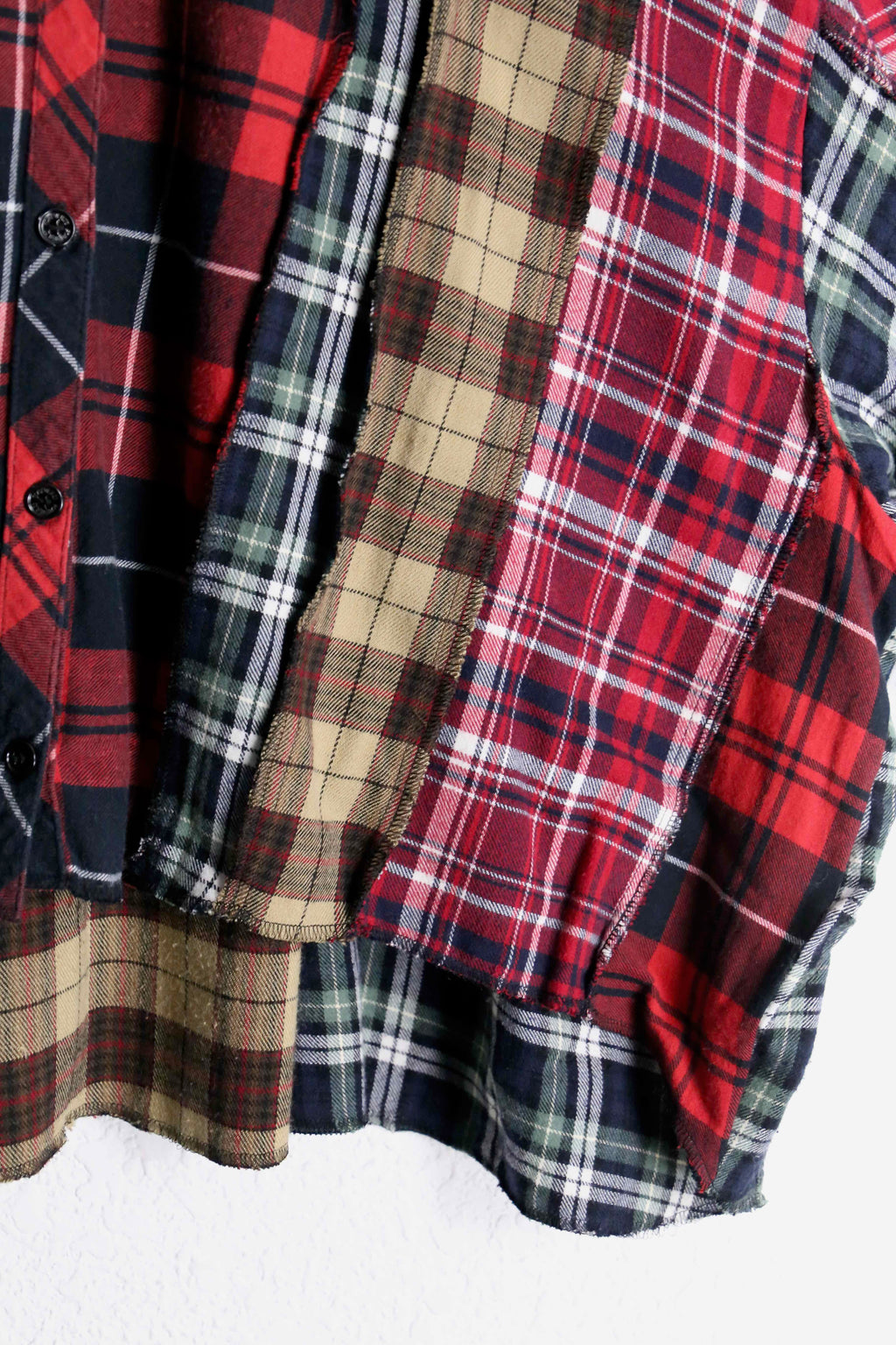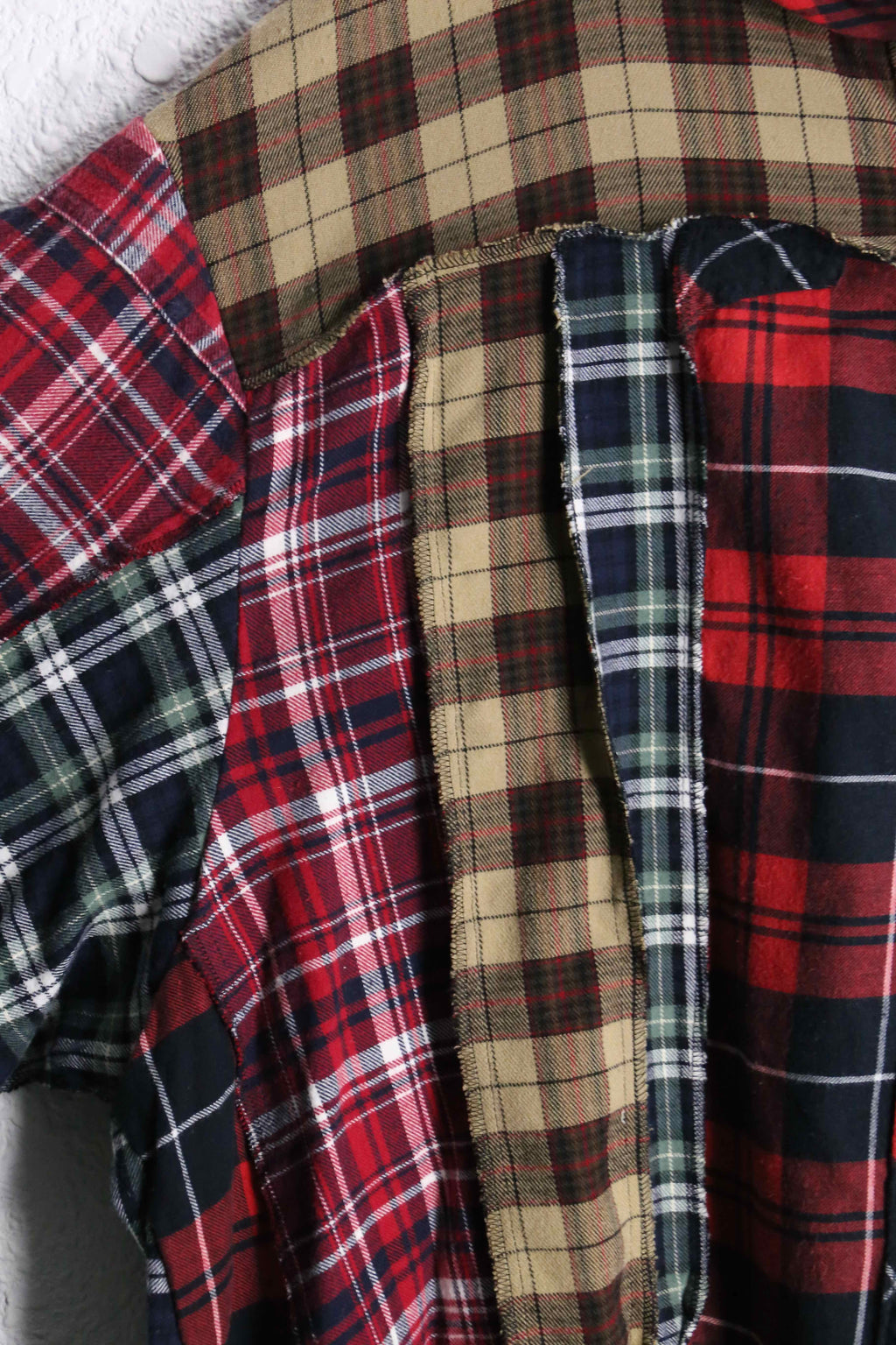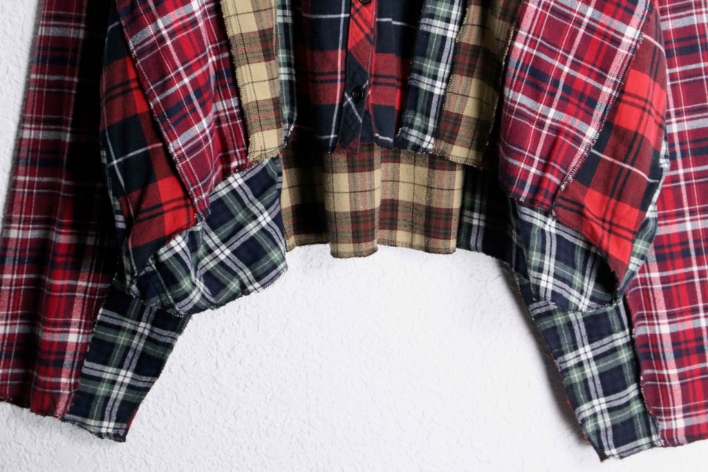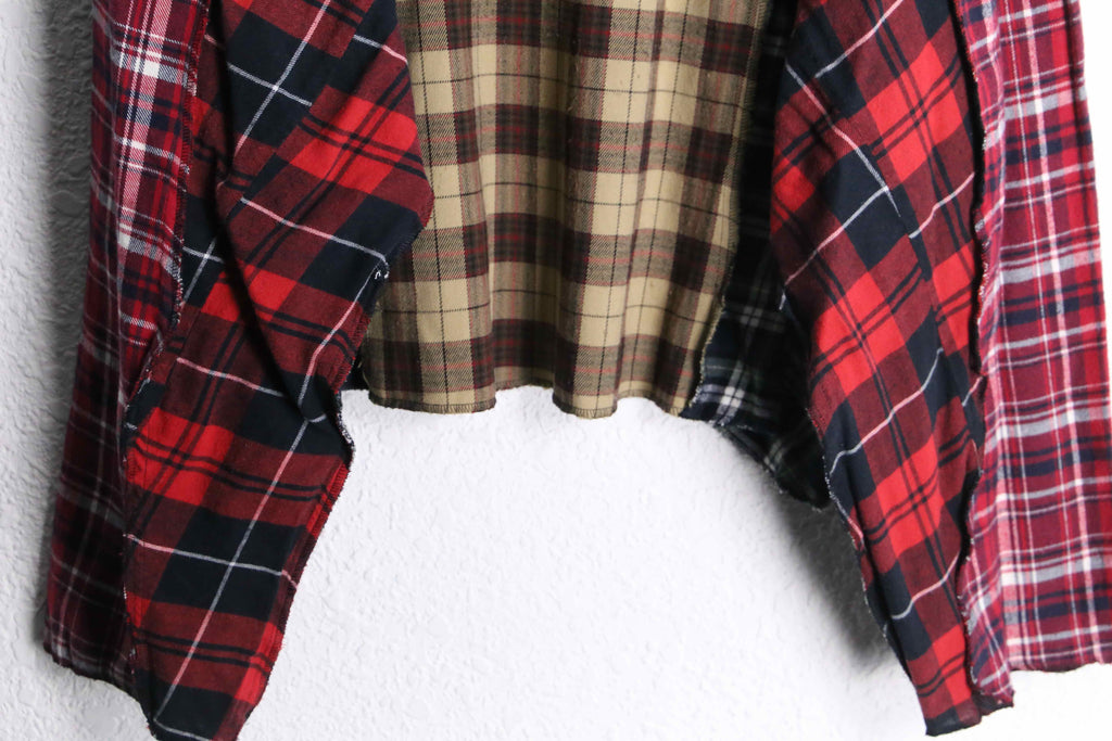 異なるチェック柄を組み合わせたデザインで、見る角度によって雰囲気が変わるのがポイント。ゆったりめのオーバーサイズシルエットで、羽織るだけで今っぽい着こなしになります。裾は少しラフなカットで、こなれた印象に。ボタンで開け閉めできるので羽織としても使えます。
