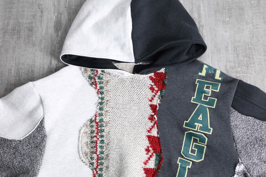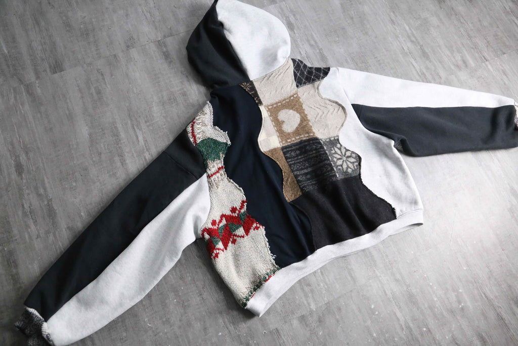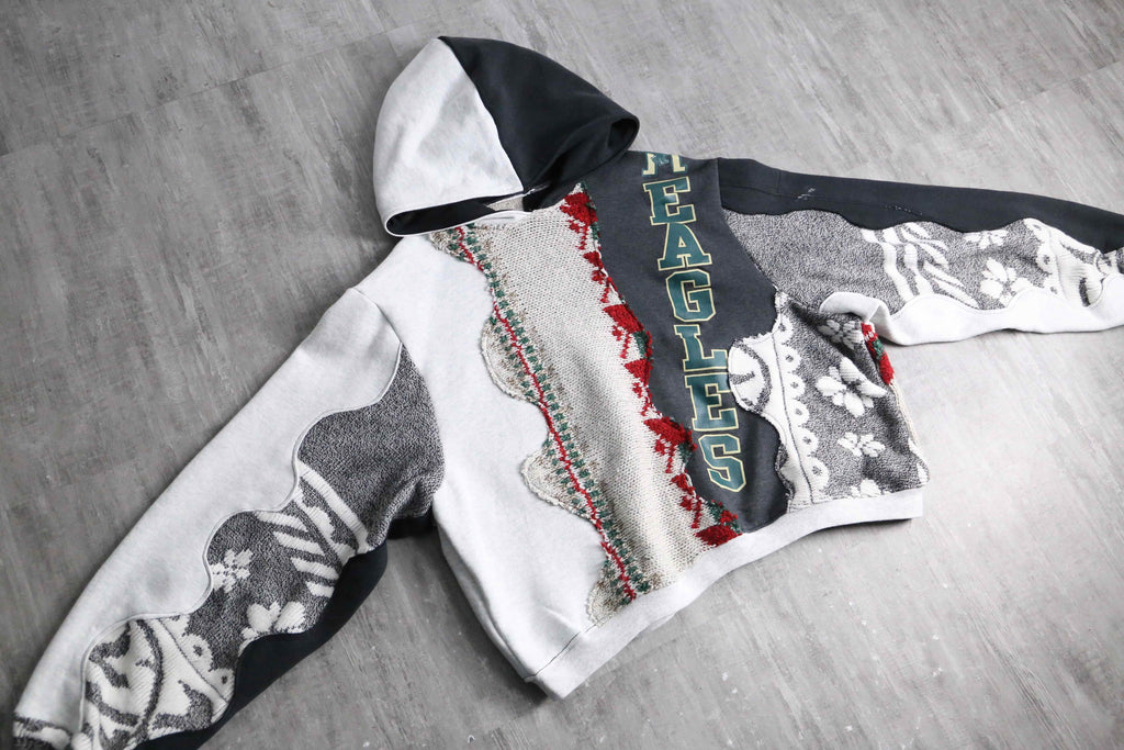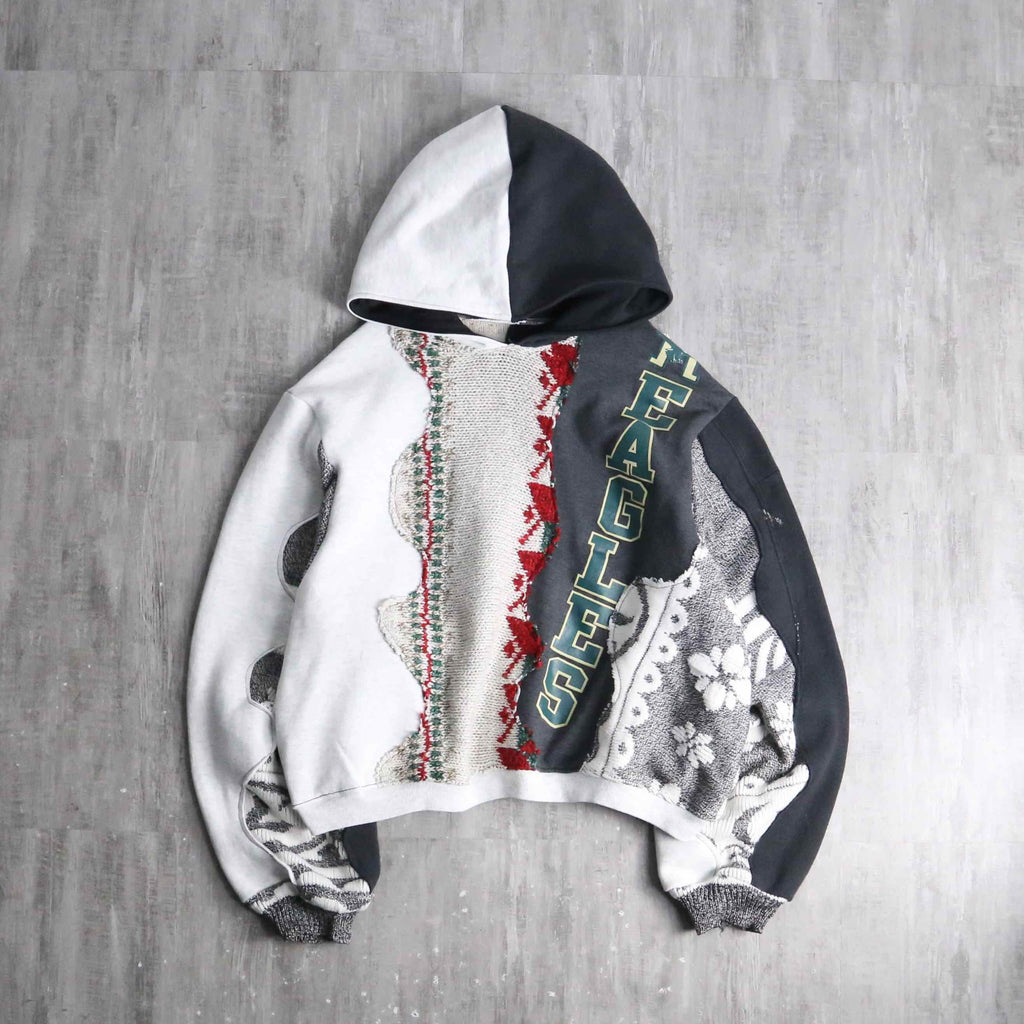 異なる素材を用いて、波打つようにデザインしたショート丈のリメイクフーディーが入荷しました。
