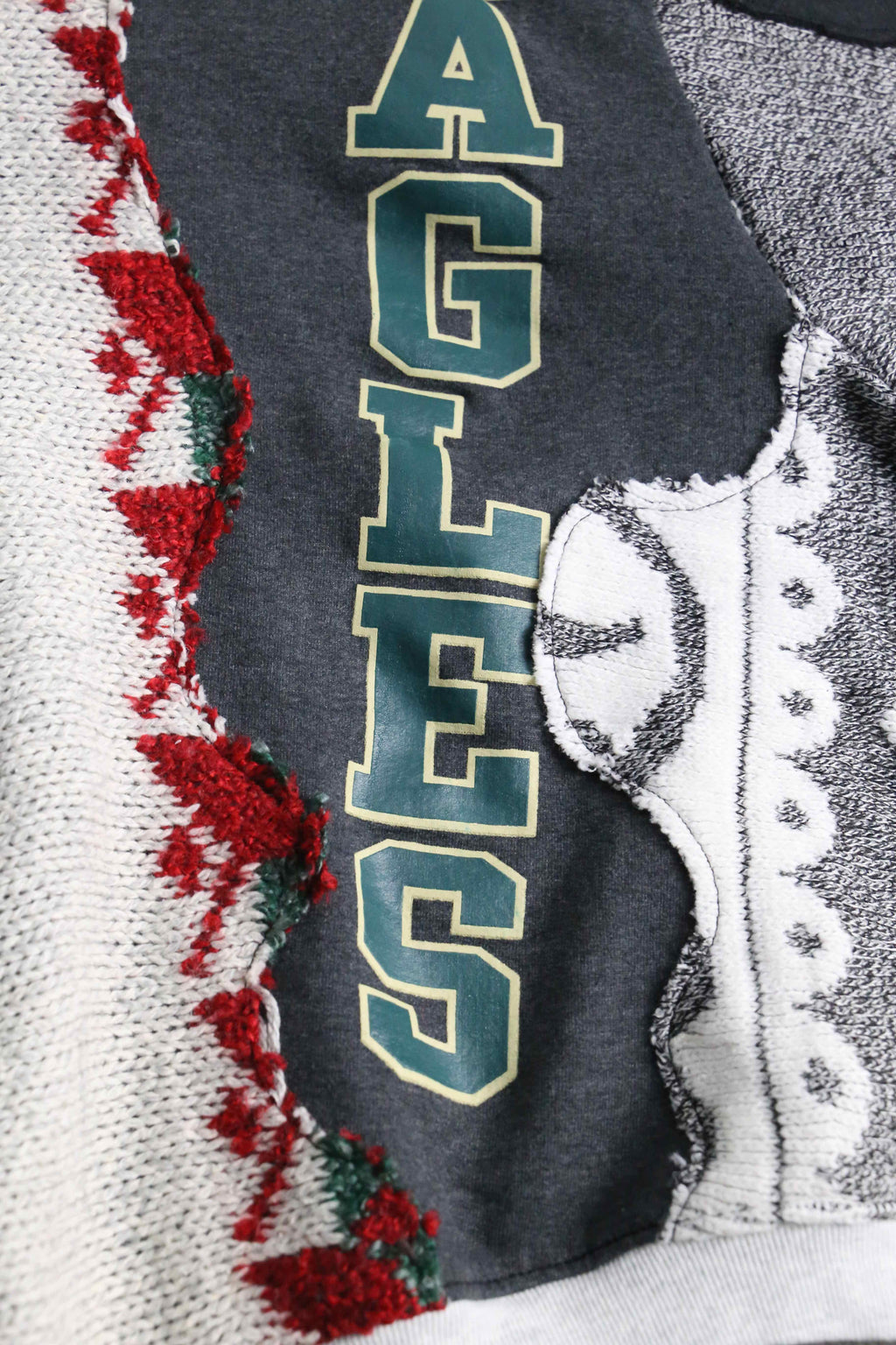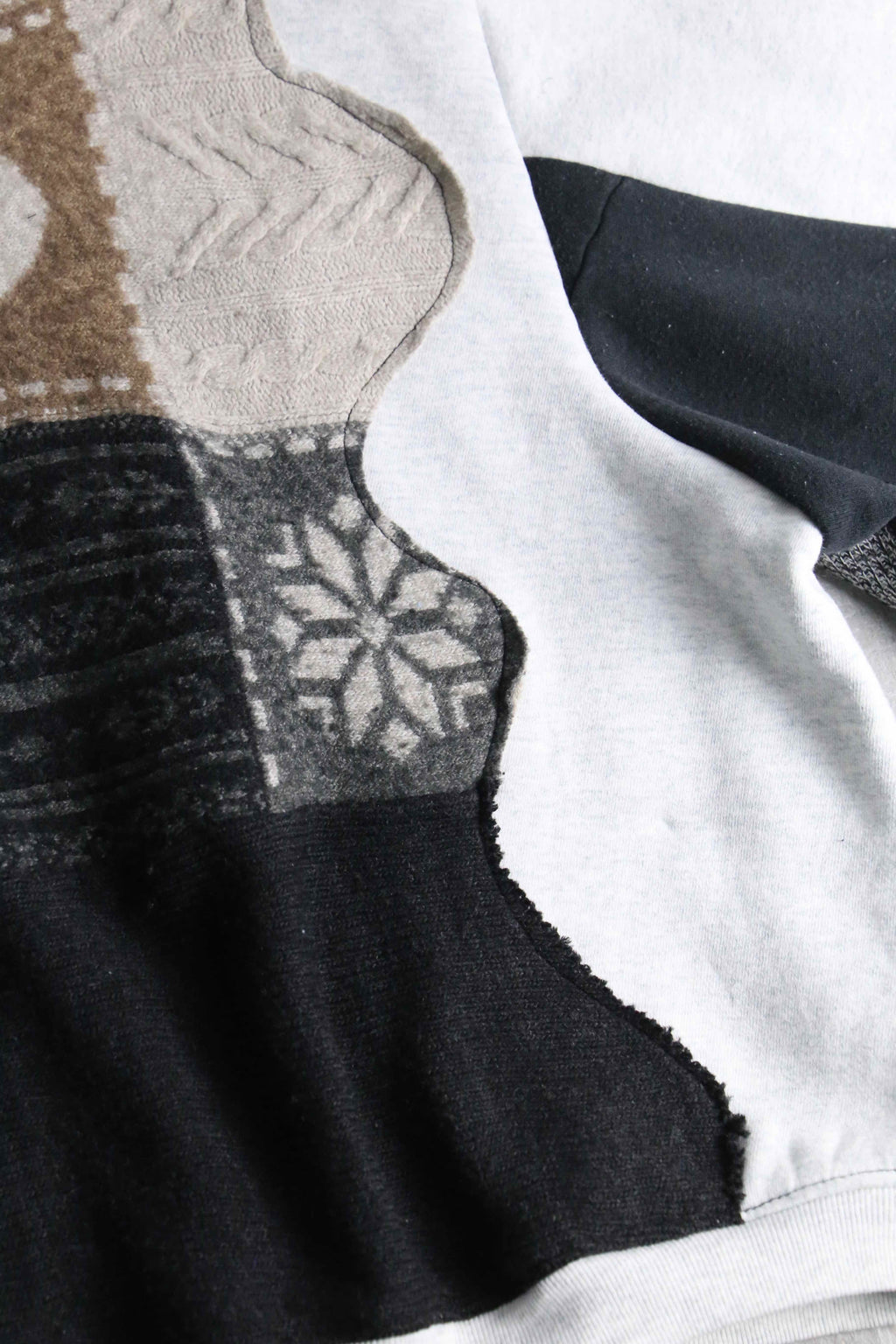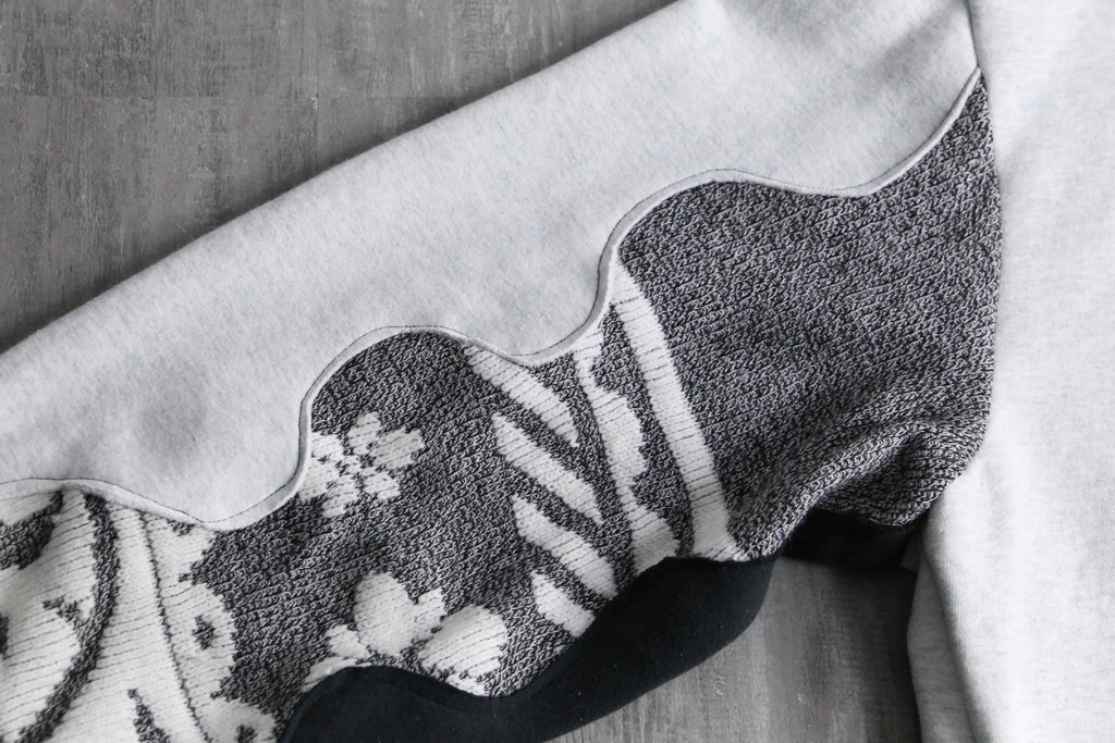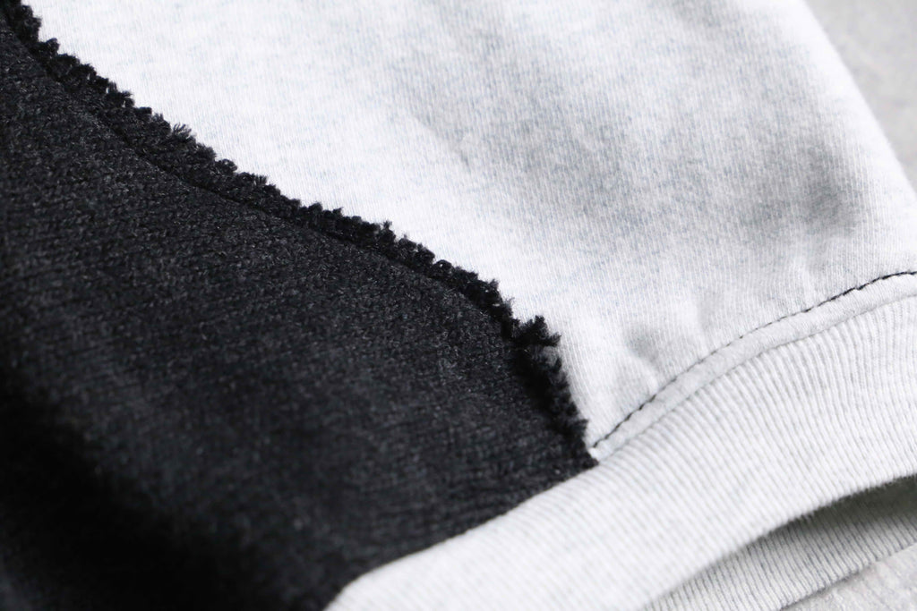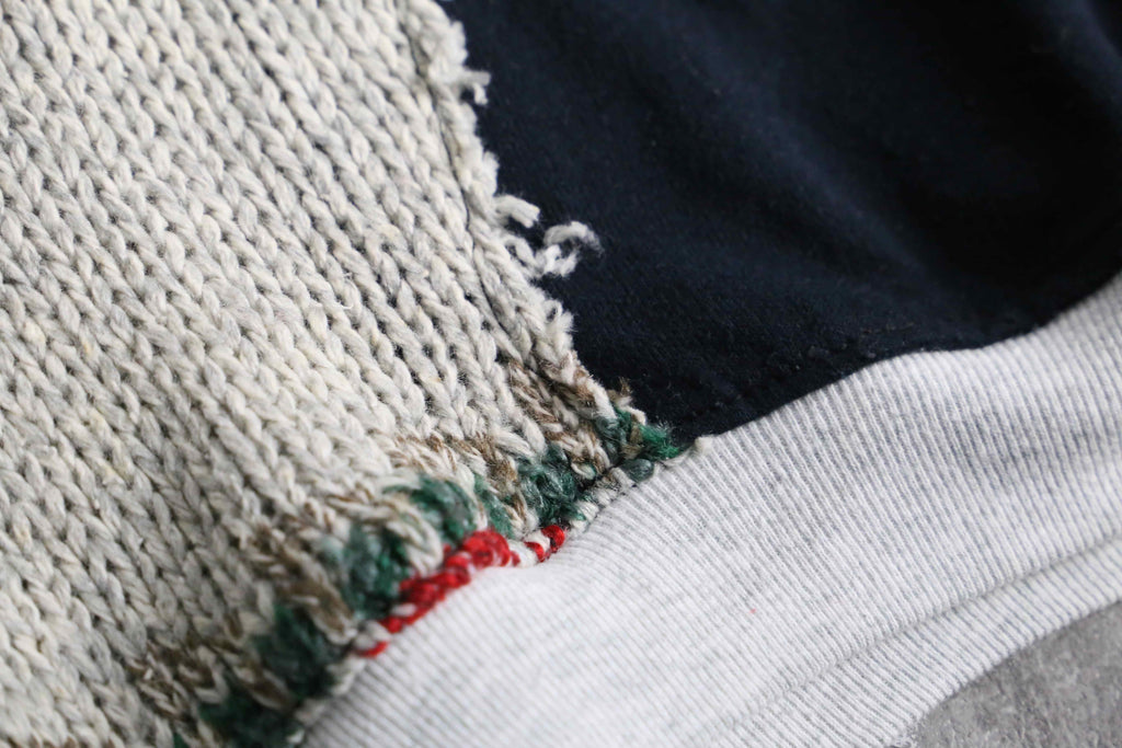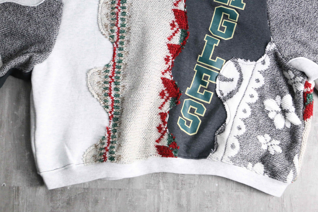 3種のスウェットと3種のニットを贅沢に使用しました。モノトーンを基調として、アクセントとして赤や緑が入る汎用性とデザイン性の高さが共存する唯一無二の1着です。