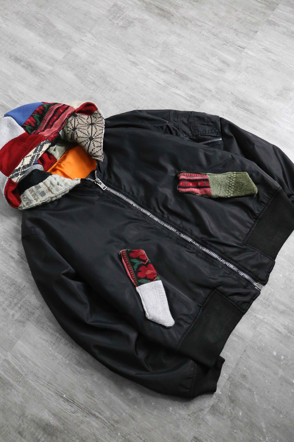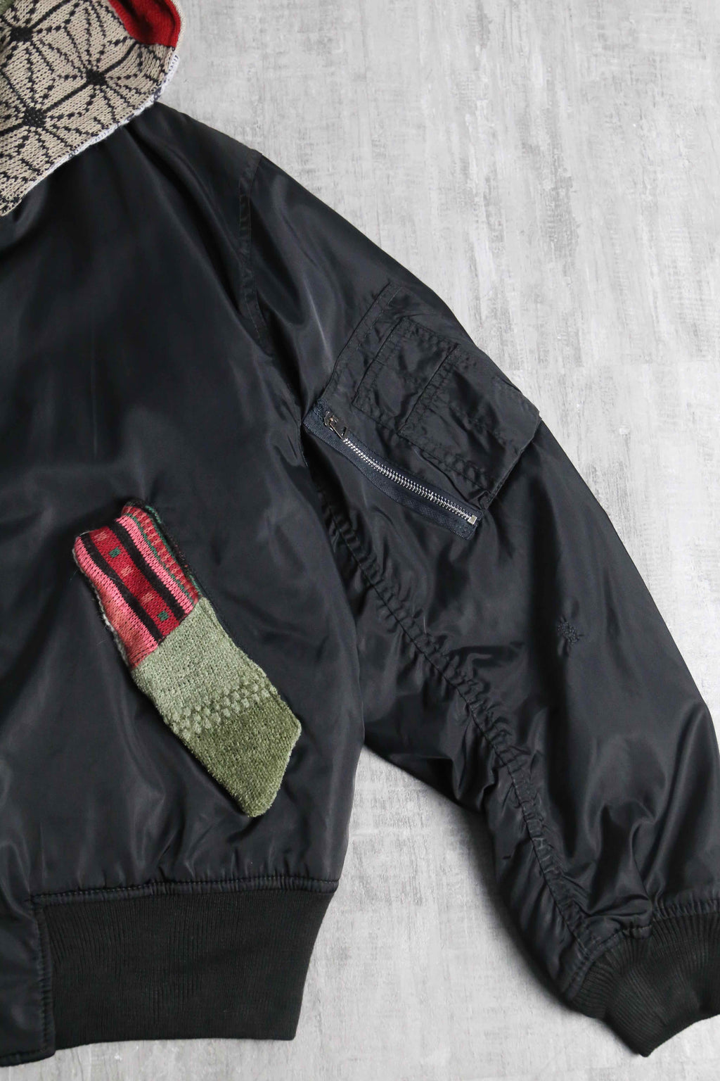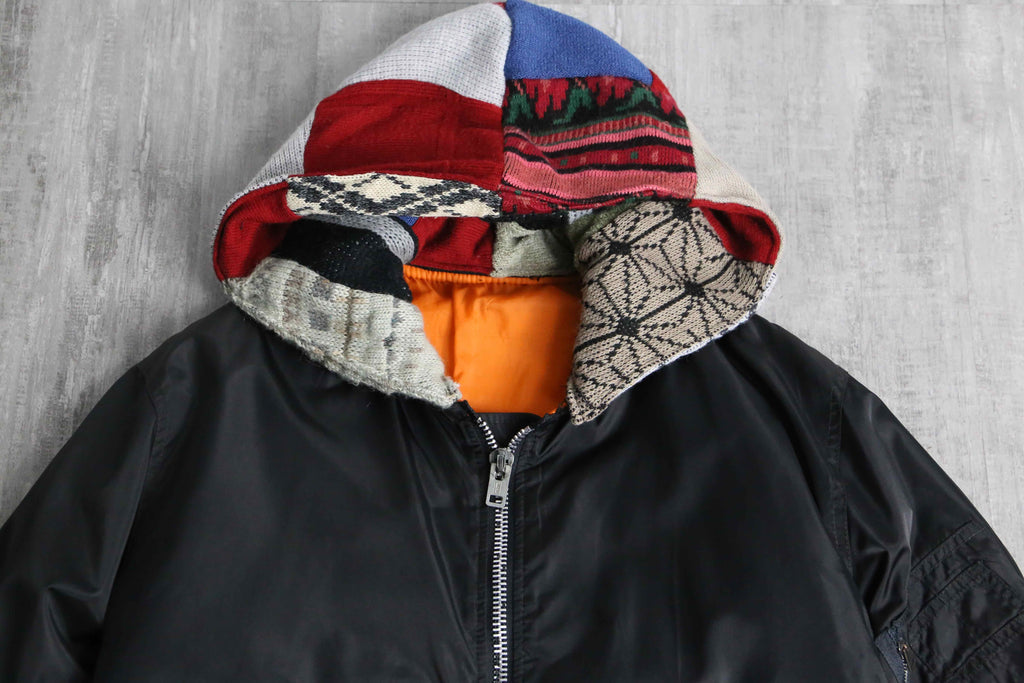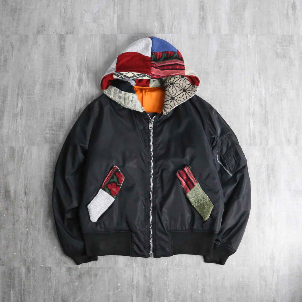 ヴィンテージMA-1に柄ニットから制作したフードとポケットマフラップを加え、アクセントの効いた可愛らしいジャケットがオンラインに入荷。