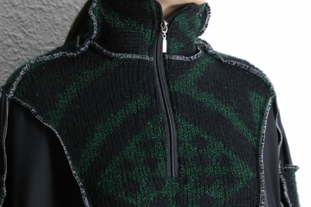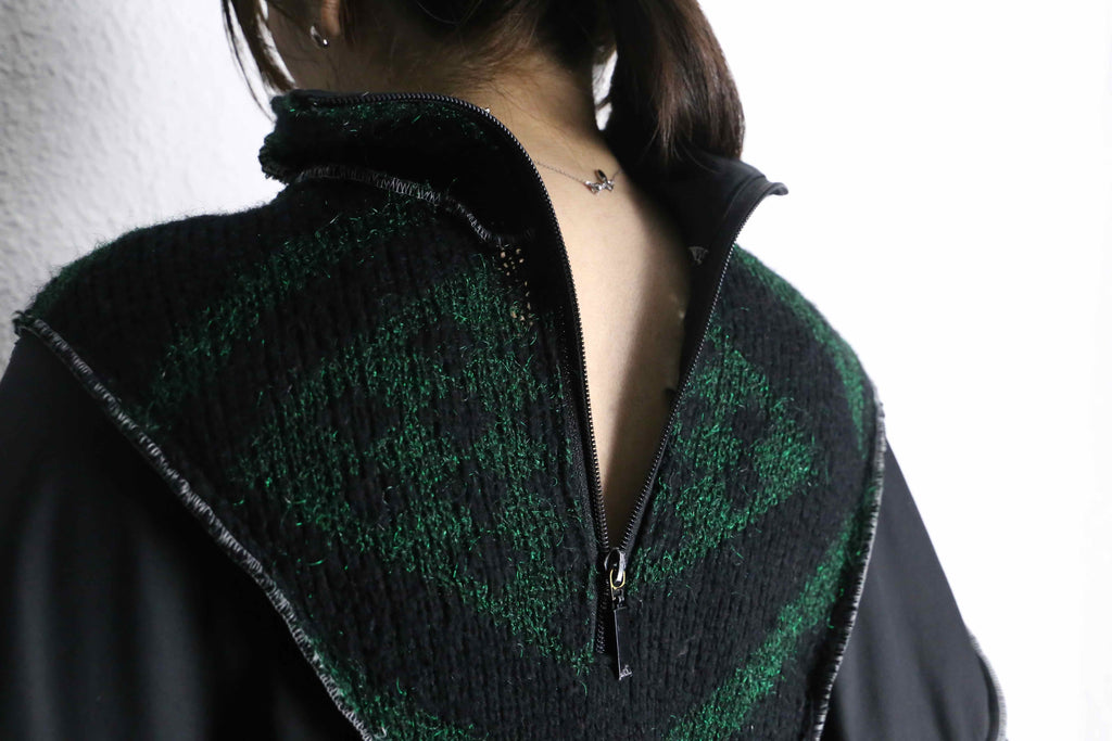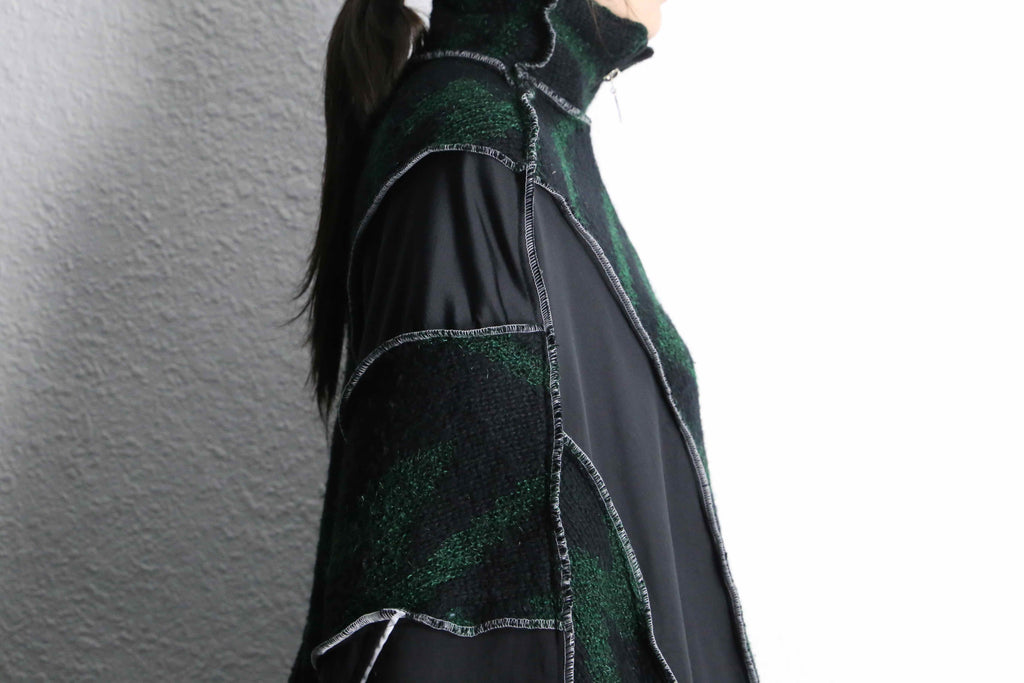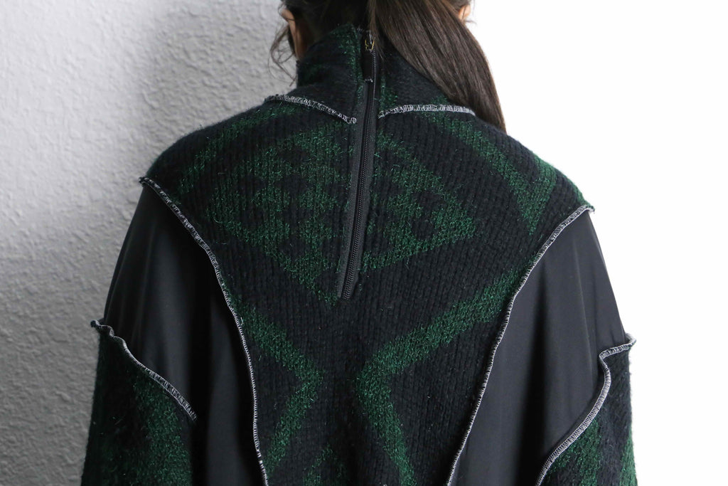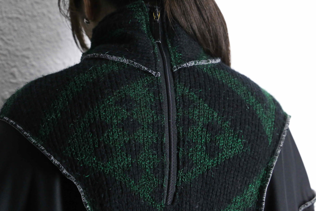 ベースは落ち着いたブラックカラーで、グリーンの柄ニットを組み合わせることで、シンプルながらも存在感のあるデザインに仕上がっています。切り替えやあえて見せたステッチ、断ち切りのディテールがアクセントになり、ラフさのバランス良いアイテム。