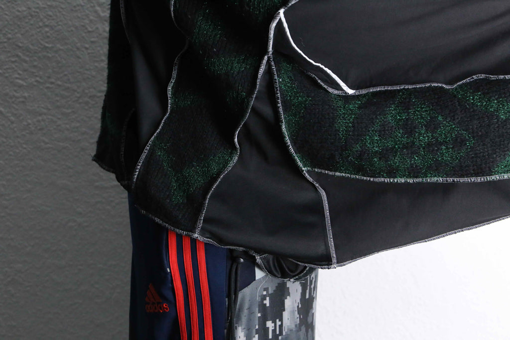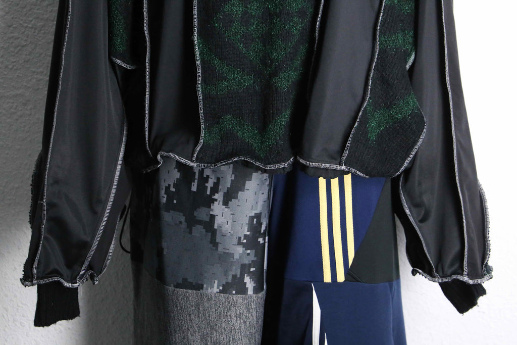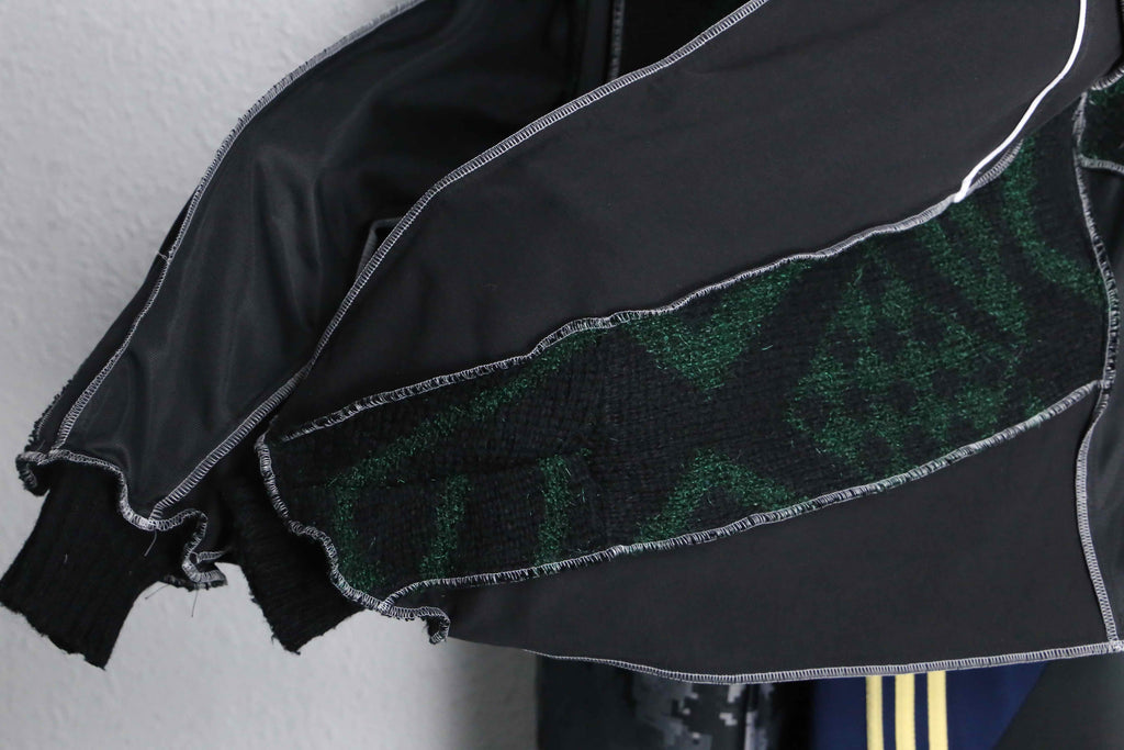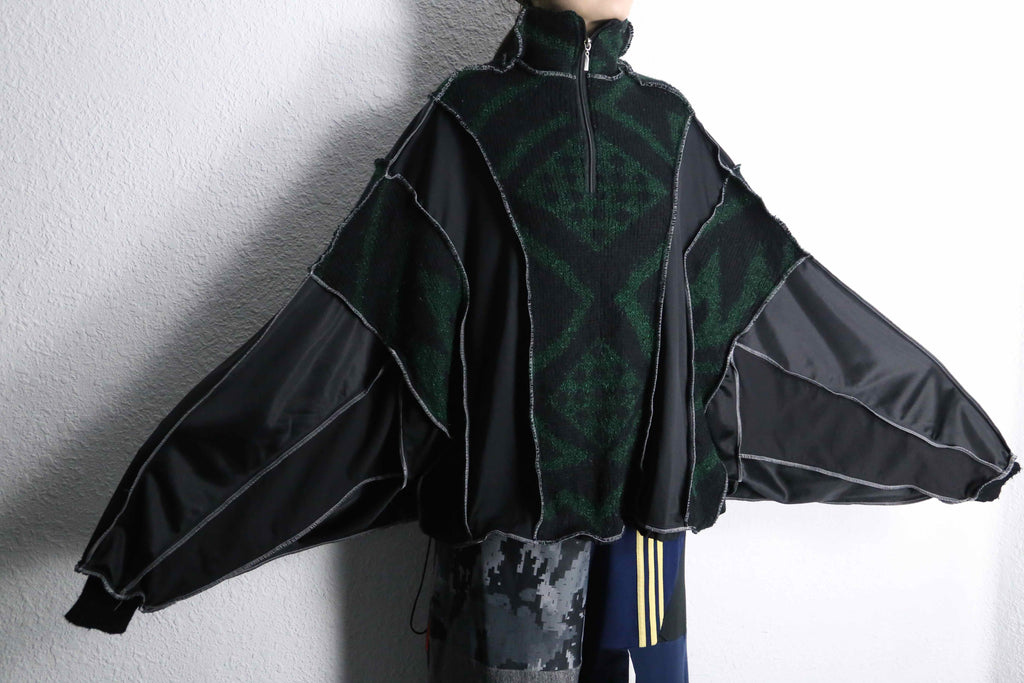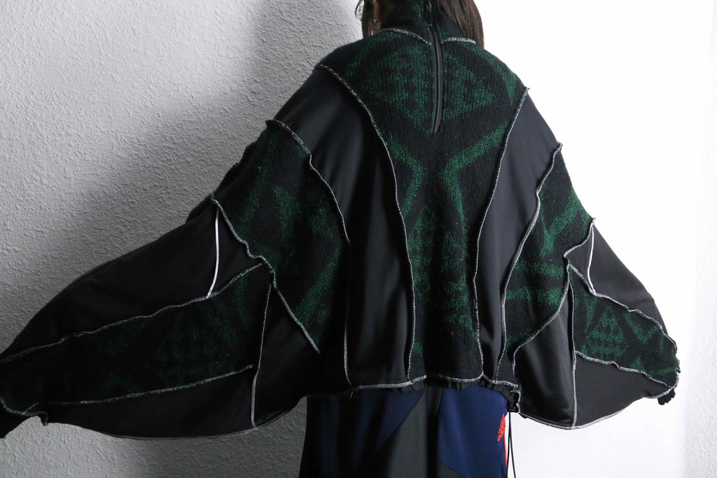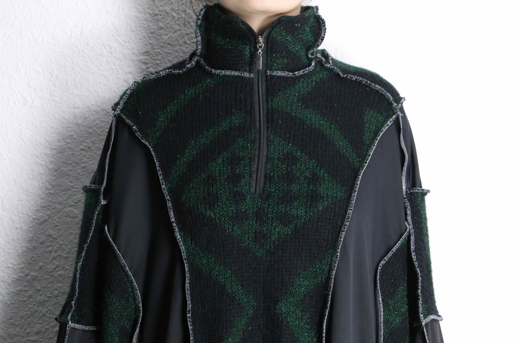 ベースは落ち着いたブラックカラーで、グリーンの柄ニットを組み合わせることで、シンプルながらも存在感のあるデザインに仕上がっています。切り替えやあえて見せたステッチ、断ち切りのディテールがアクセントになり、ラフさのバランス良いアイテム。