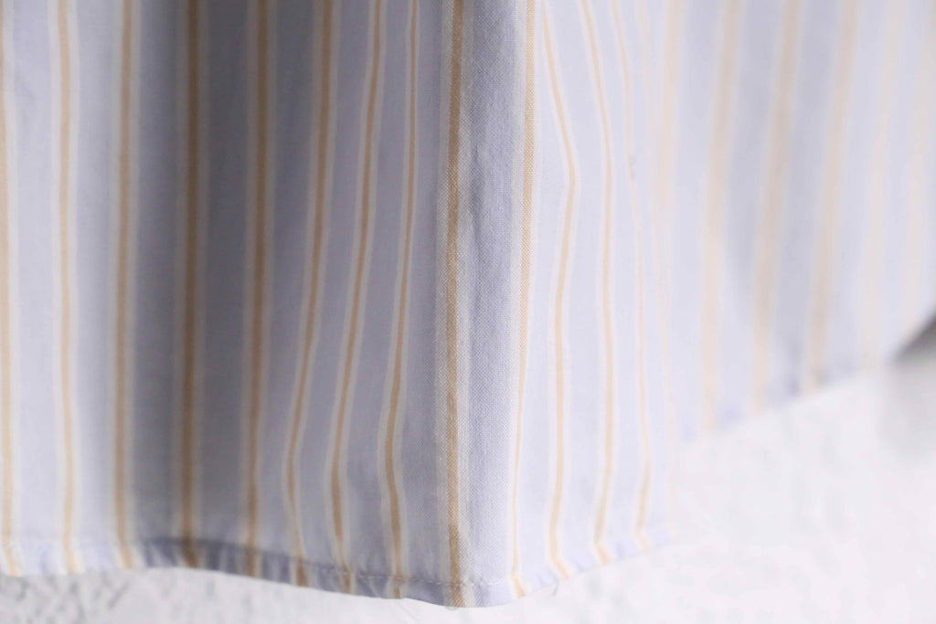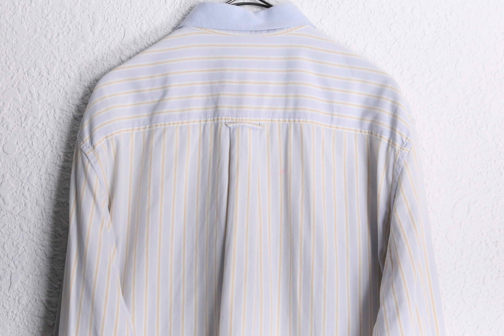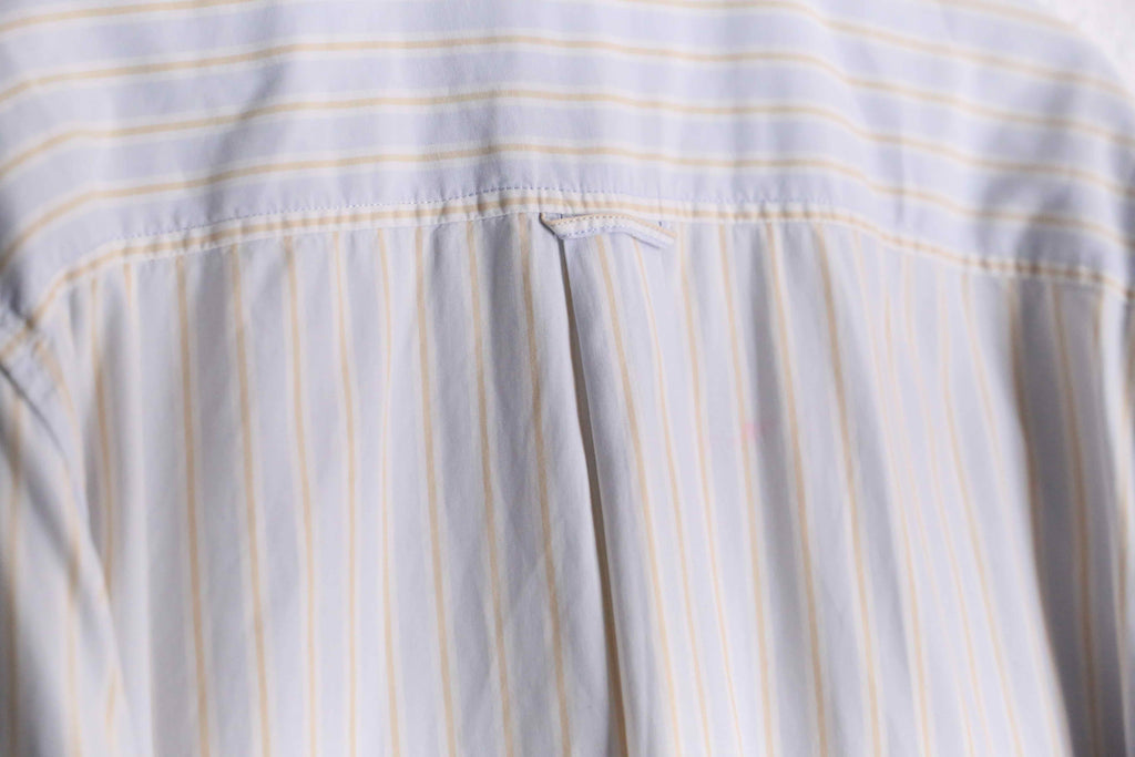 今回のシャツは、淡いブルーとオレンジの配色があどけなく、ドレスシャツの中でも可愛らしさを持った1着。襟はカラーが切り替えられ、ボタンダウン。カジュアルな印象は強いですが、着用感やシルエットはドレスシャツそのもの。ボディラインに沿った美しいシルエットに、コットンの張りのある質感。お好きな人は多いと思います。