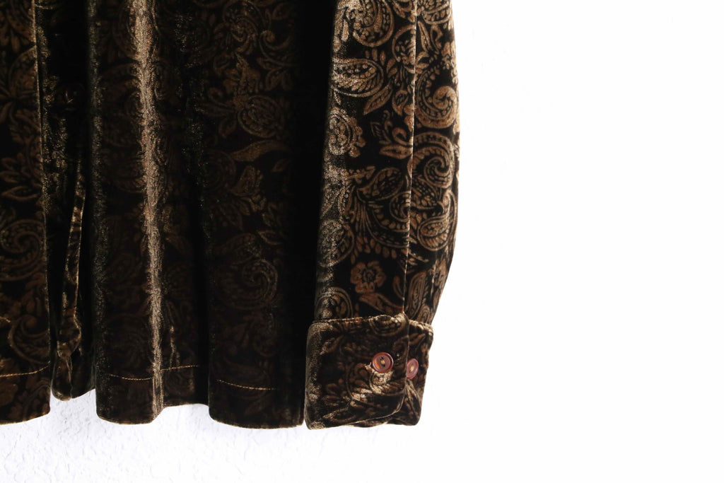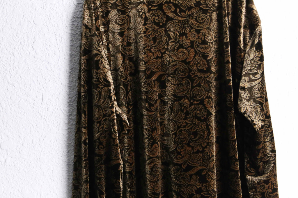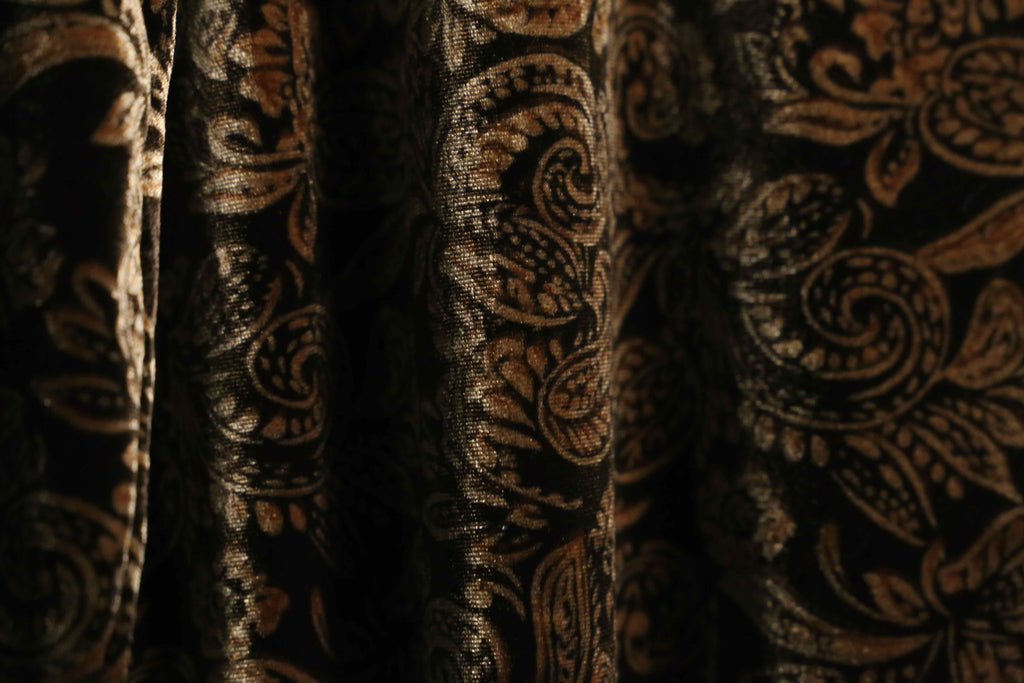 深みのあるダークブラウンを基盤に施されたペイズリー調のジャカード模様が、クラシカルでありながら艶やかな存在感を放ちます。触り心地は非常に柔らかく、滑らかであり、動きを成した際の表情が極めて美しいです。
