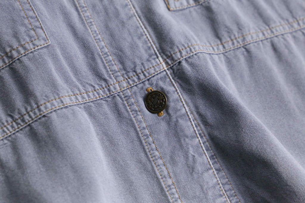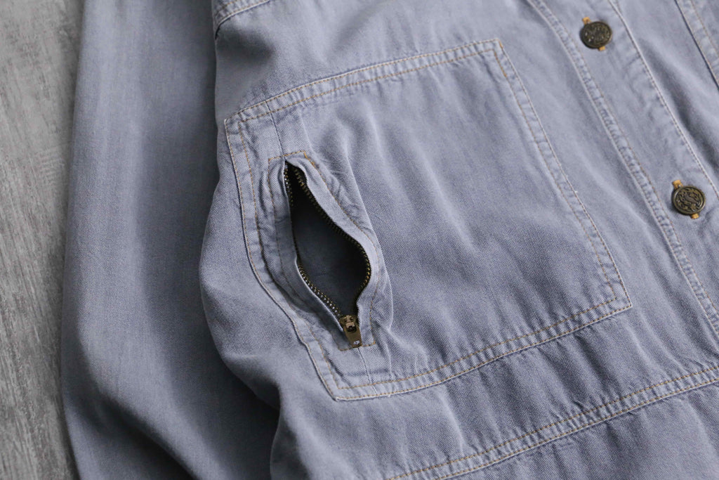解禁、ステッチ、両胸ジップポケット等、各部分少し独特なデザインがなされ、シャツともジャケットとも取れる中間的アイテムです。