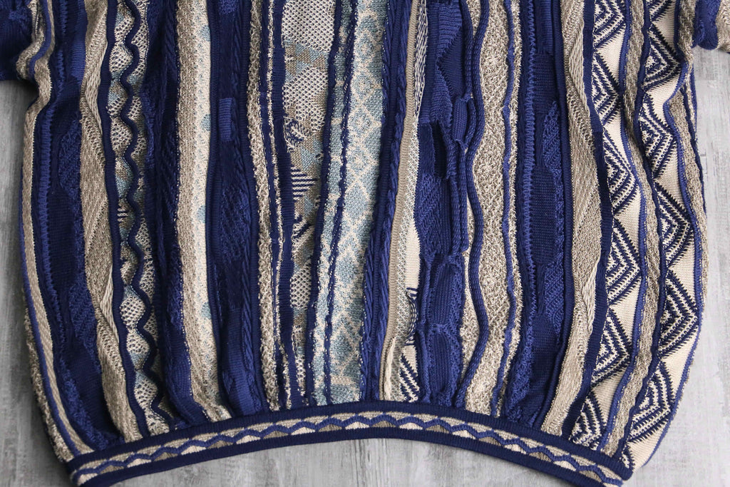 マーセライズ加工されたボディはシルクのような光沢感。コットンで軽く、肌触りの良い質感。まさにクオリティの高い逸品。ブルーとベージュが織り交ぜられたグッドな配色もポイント。