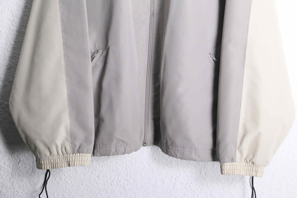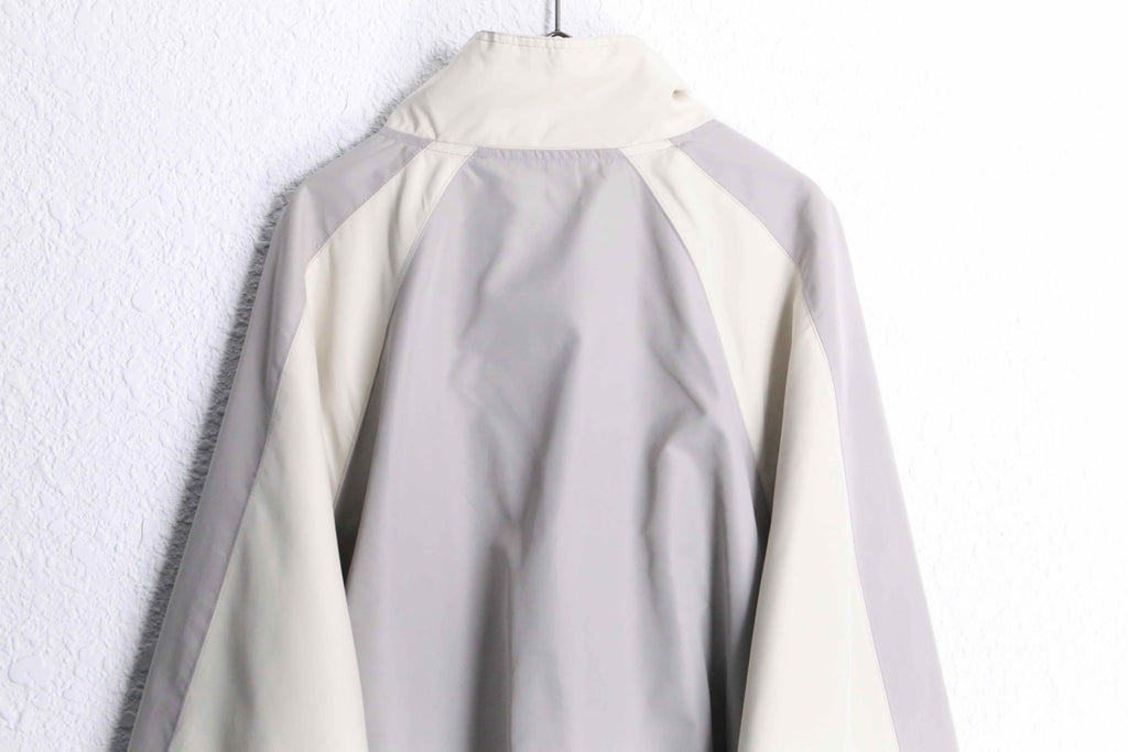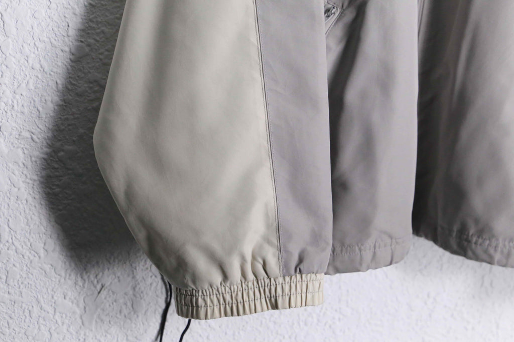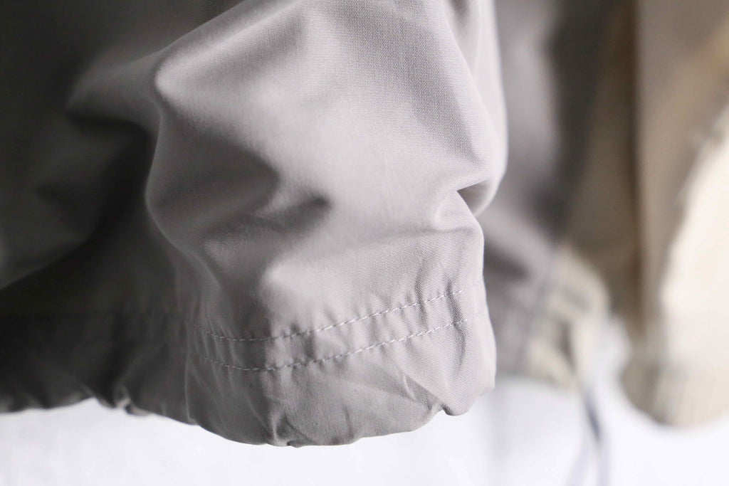 アイボリーカラーをベースとした柔らかい印象。ナイロンの様なテックのノリを感じつつ、シンプルで落ち着きのある1着です。ドローコードで絞って短丈にするのも良し、サイジングを活かしてオーバーに着こなすにも良いジャケットだと思います。