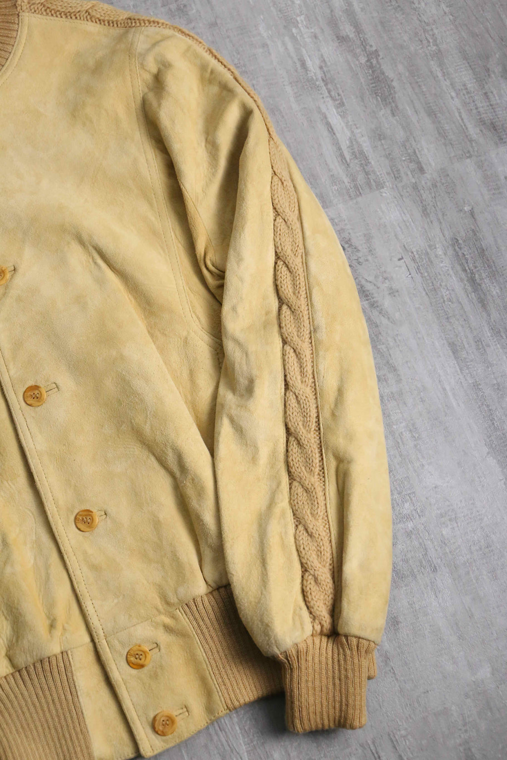上質なスウェードレザーをベースに、襟や袖口、そしてアームに編み込まれたケーブルニットを大胆に切り替えた、異素材コンビネーションが魅力のジャケット。