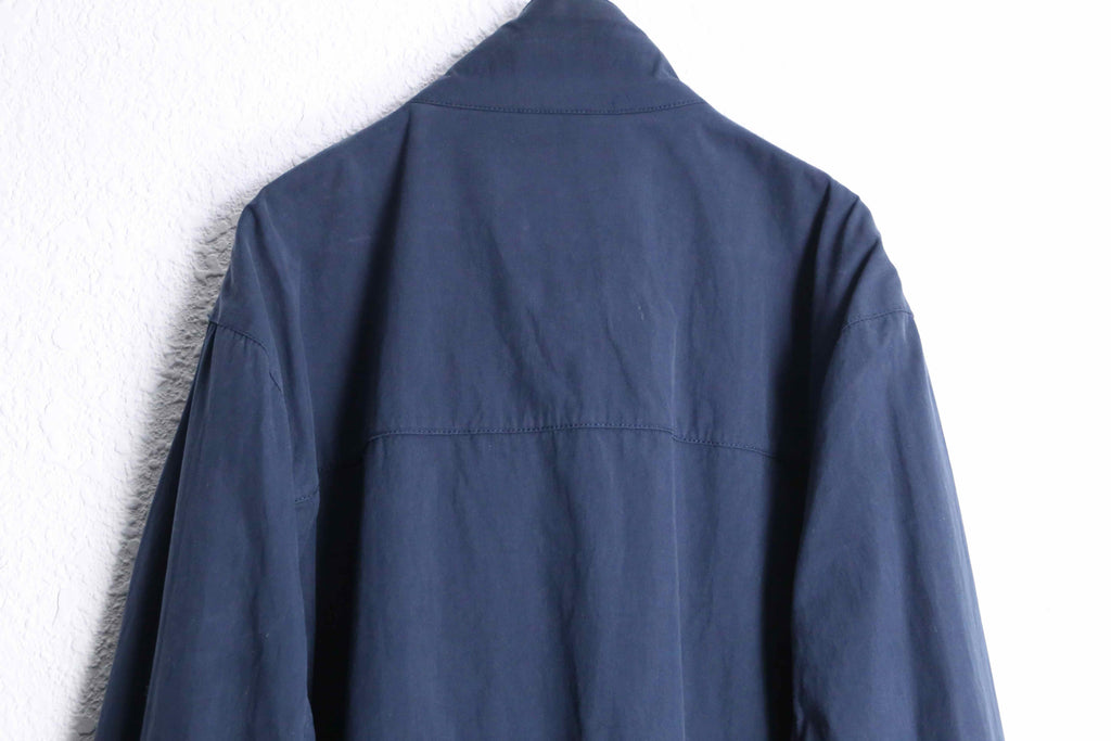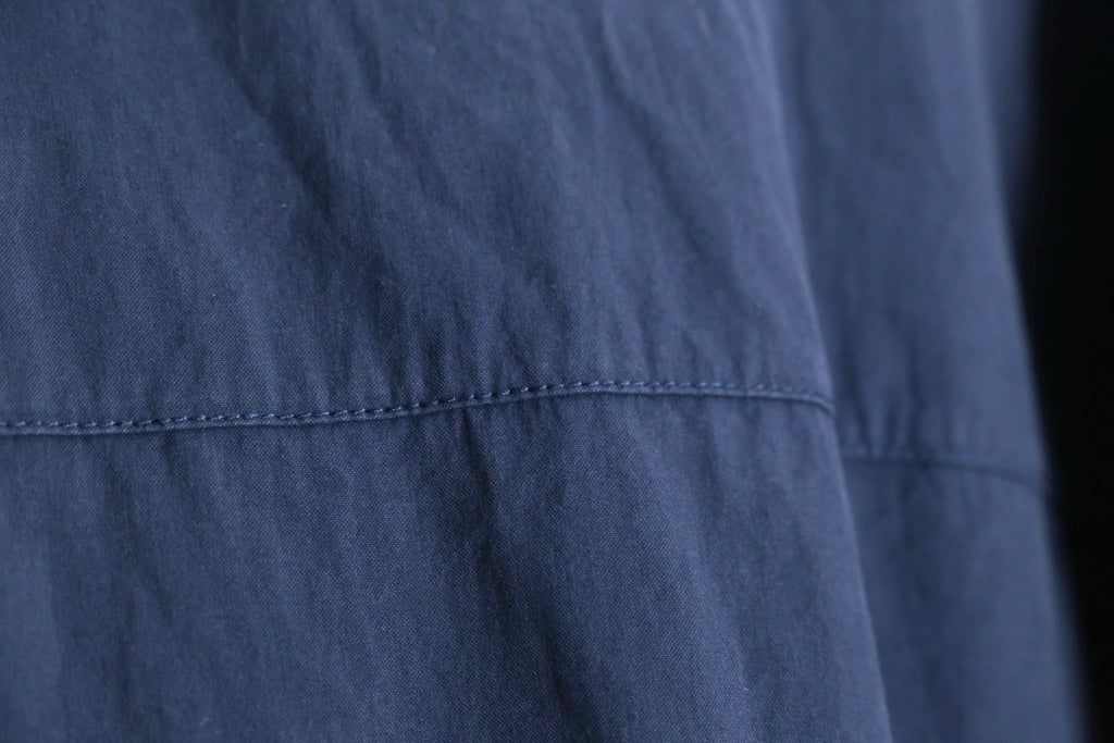 ネイビーで一面覆われた落ち着いた雰囲気。クリームの色味が良いボタンでアクセントを加えたルックスもポイントが高いです。秋にサラッと羽織りたいライトジャケットだと思います。