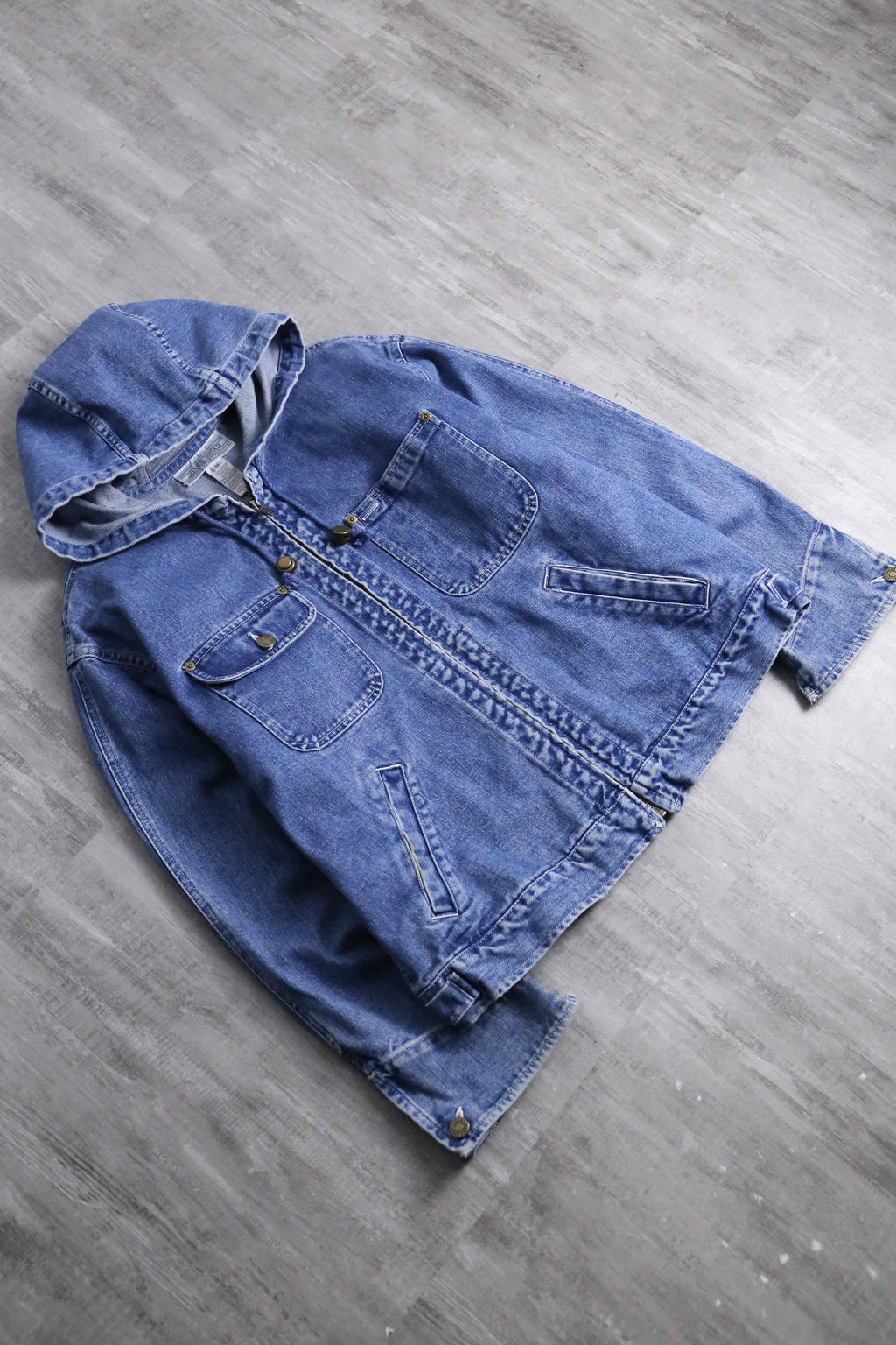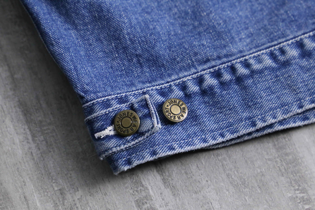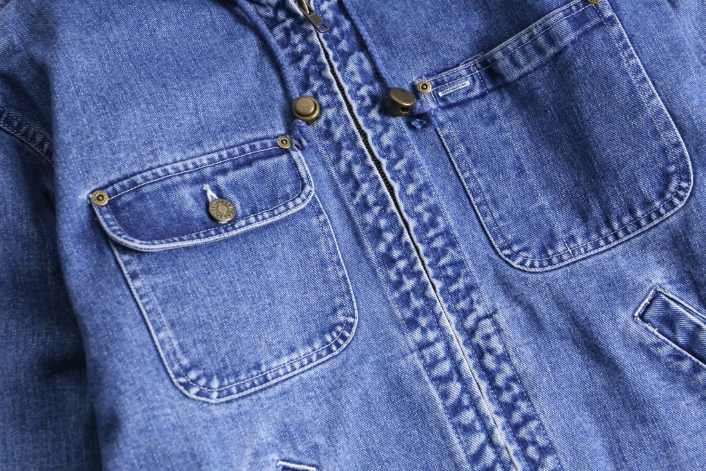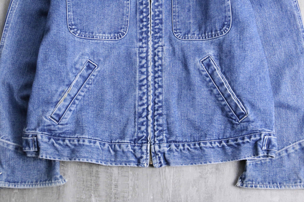 淡いブルーが古着らしい表情を演出。フロントの大きめポケットとスナップボタンの各ディテールが魅力的です。身幅の太いシルエットも短丈と相まって格好良いシルエットになっています。