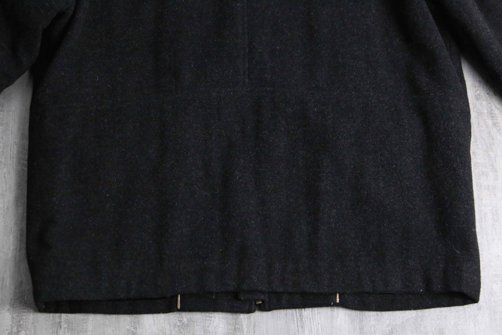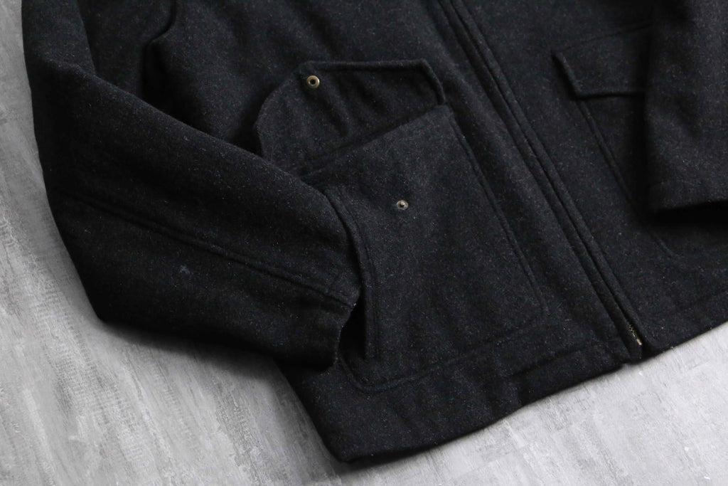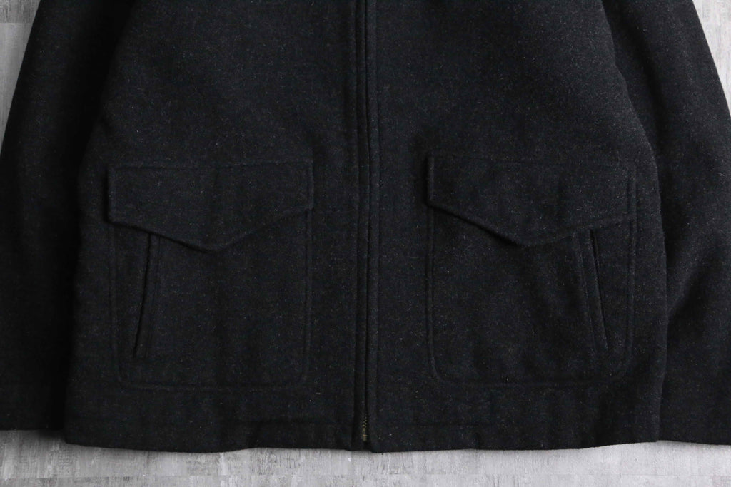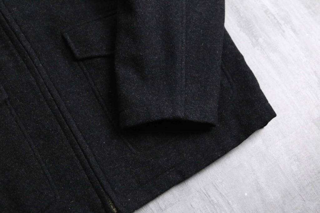 肉厚で密度の高いウール生地は、保温性に優れるだけでなく、上品な光沢をまといながらも無骨な存在感を放ちます。フロントはクラシカルなジップアップ仕様、フラップポケットに加えて、スラッシュポケットが付いているのはポイント高めです。