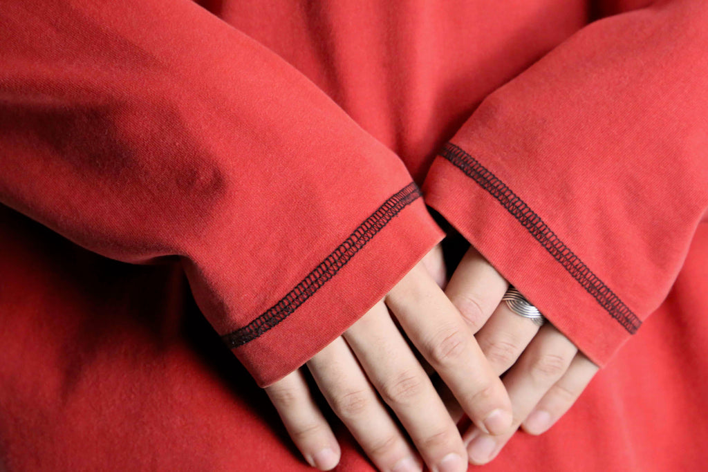 褪せた赤と灰色のシンプルな配色。