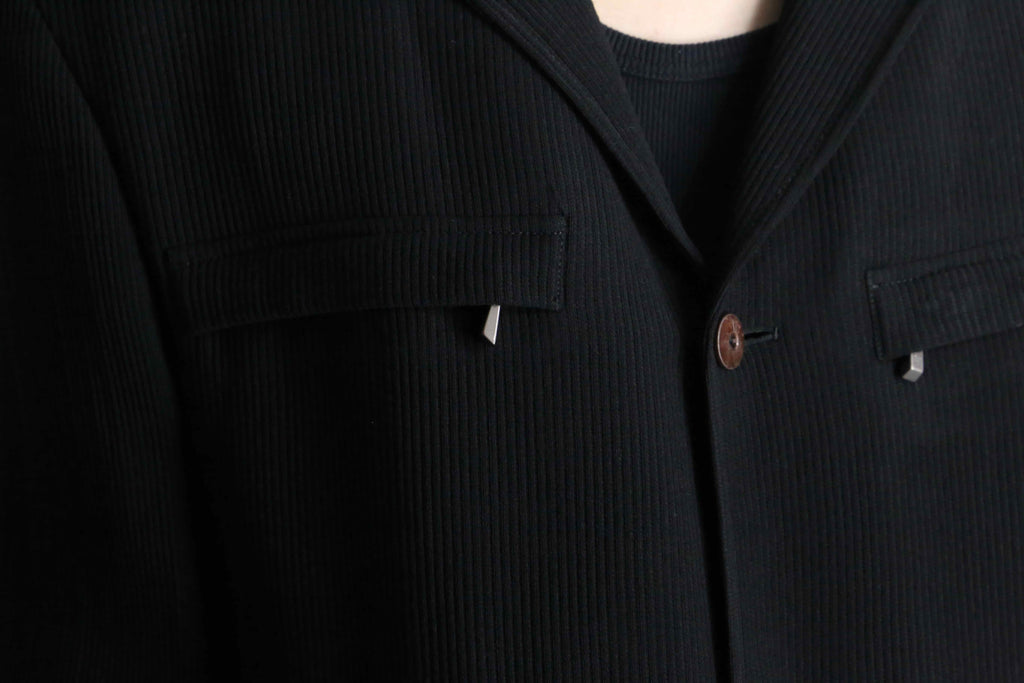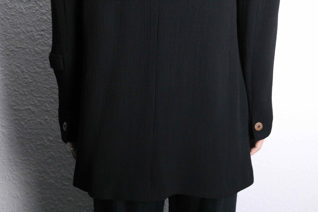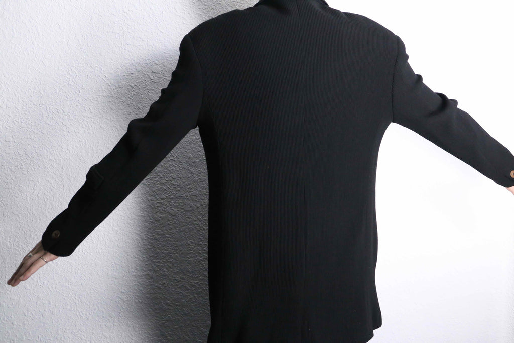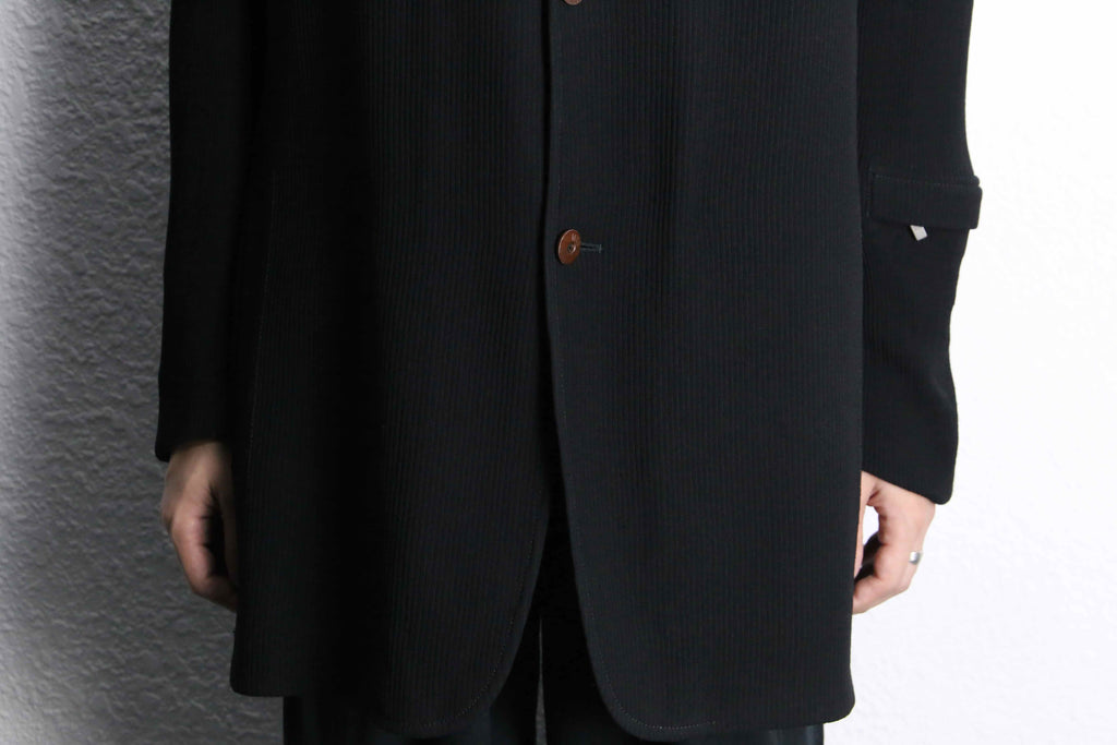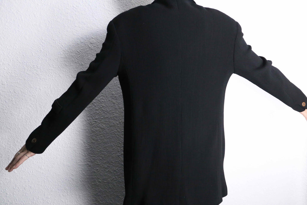 袖のギミック感のあるジップのディテール、茶ボタンのコントラストなどの細部の変わったデザインに心を打たれます。着丈は長めの3つボタンタイプで現代のアイテムとミックスさせやすいテーラードだと思います。プリーツパンツなんかと合わせて、全身プリーツなどのスタイリングも面白いかもしれません。