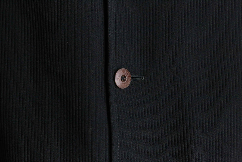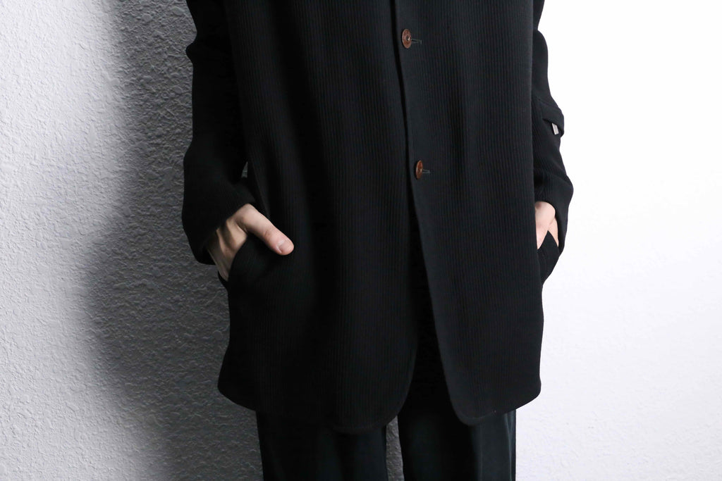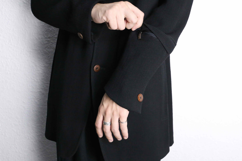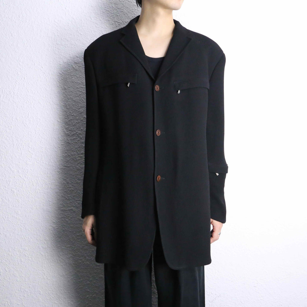 袖のギミック感のあるジップのディテール、茶ボタンのコントラストなどの細部の変わったデザインに心を打たれます。着丈は長めの3つボタンタイプで現代のアイテムとミックスさせやすいテーラードだと思います。プリーツパンツなんかと合わせて、全身プリーツなどのスタイリングも面白いかもしれません。