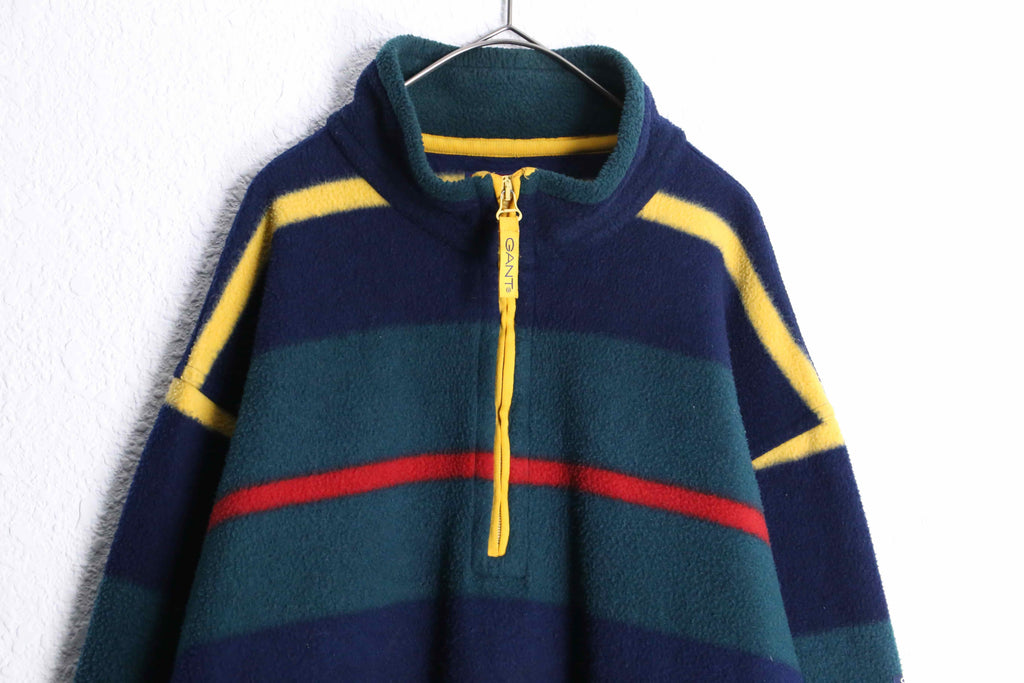 ネイビー×グリーンをベースに、赤と黄のラインが効いたフリースプルオーバー。