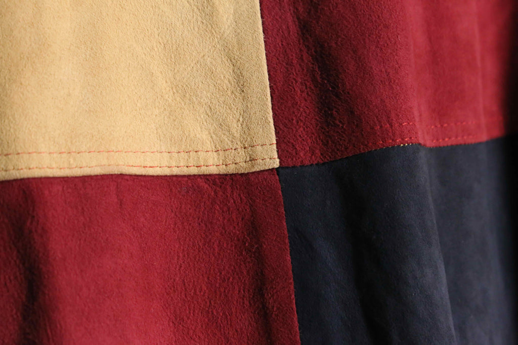 しっとりとしたタッチのスウェード素材を、深みのあるバーガンディ、キャメルベージュ、ネイビーの3色で大胆に切り替えたパッチワークデザイン。フロントは3連のメタルホック仕様で、クラシカルなアクセントと実用性を兼ね備えたディテールに。たっぷりとしたシルエットと独特のドレープ感は、動くたびにエレガントな印象を演出します。