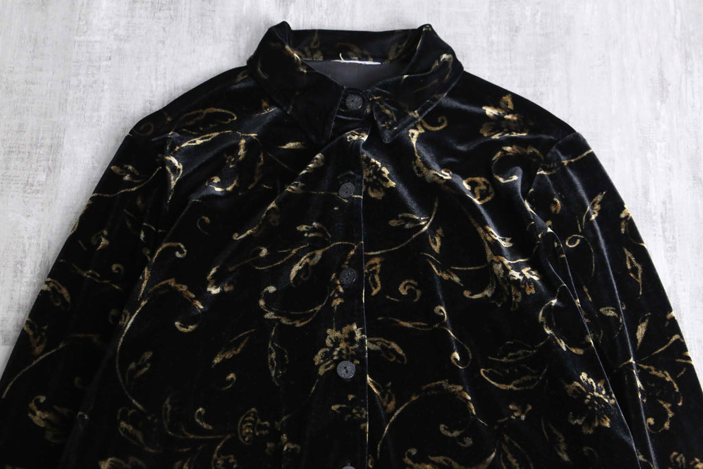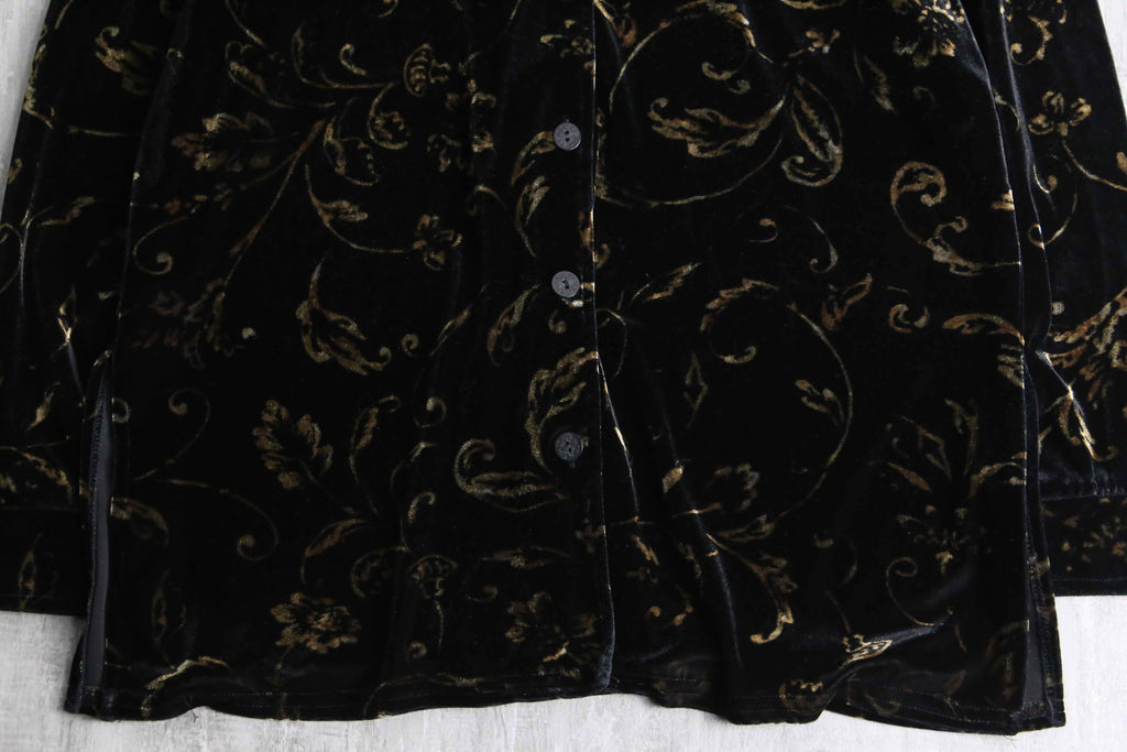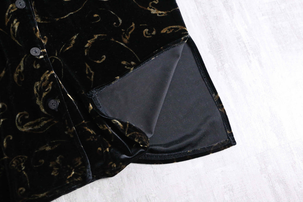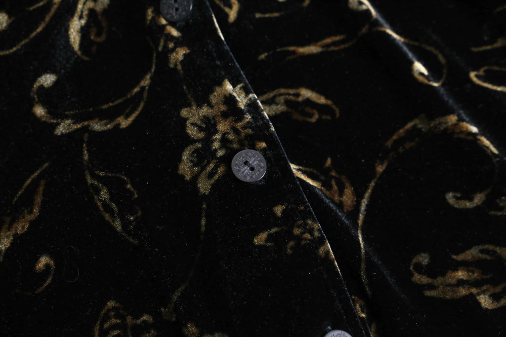 ブラックボディに映えるゴールドに、パープルの様な艶美なカラーが混じって見える良配色。長めの着丈に対して、細めの身幅がボディラインを強調してスタイリッシュに着こなせるサイジングです。プリーツパンツなどでエレガントに着飾るのもモダン的で良いかと思います。