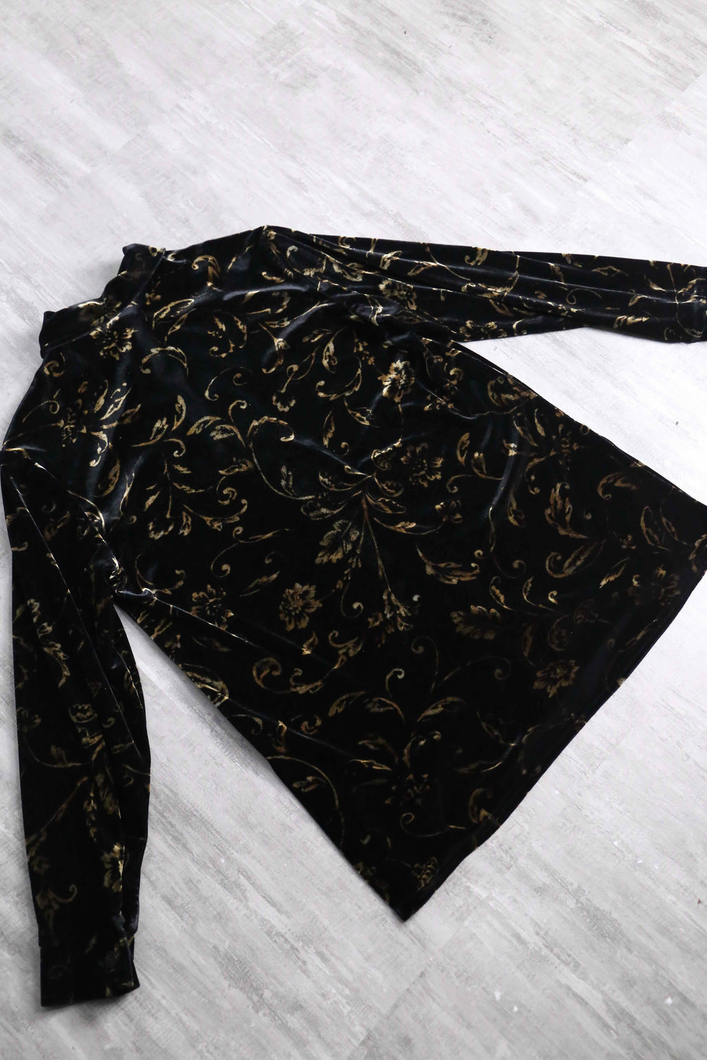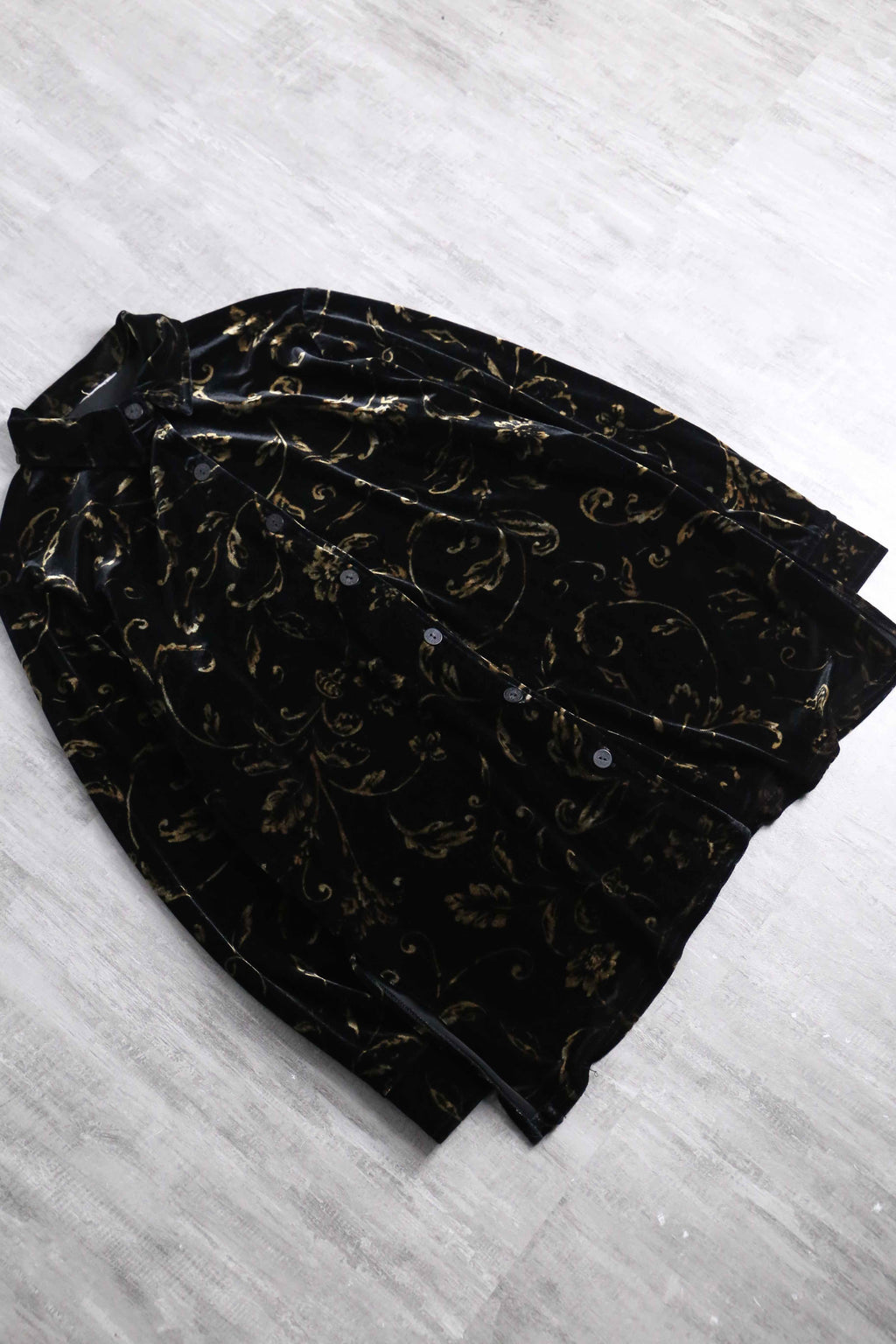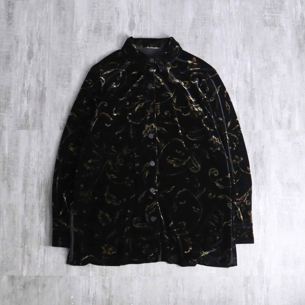 ブラックボディに映えるゴールドに、パープルの様な艶美なカラーが混じって見える良配色。長めの着丈に対して、細めの身幅がボディラインを強調してスタイリッシュに着こなせるサイジングです。プリーツパンツなどでエレガントに着飾るのもモダン的で良いかと思います。