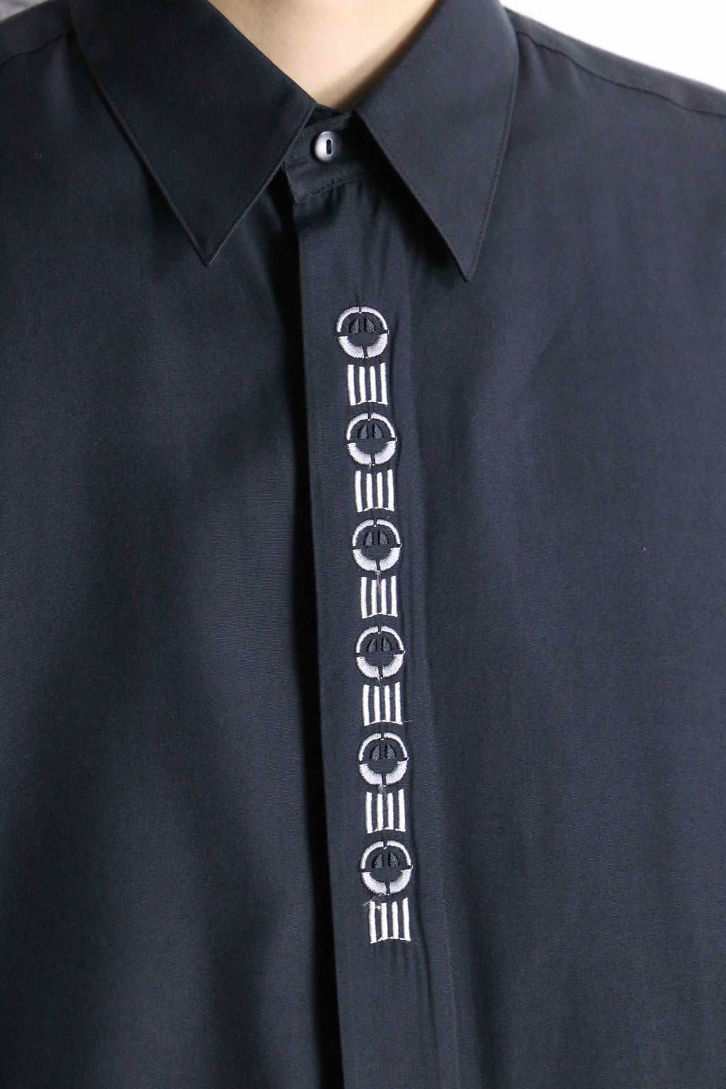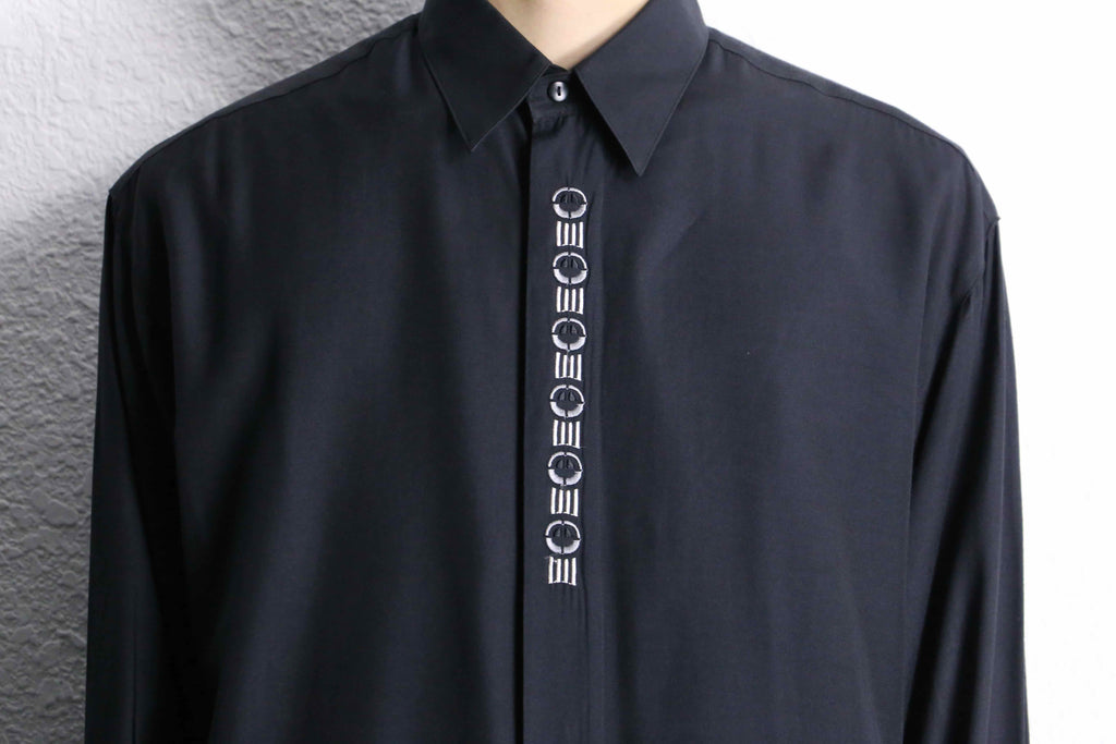 比翼というボタンの見えないスッキリとした印象の中に、細やかな刺繍のデザインが映えた1着。素材はレーヨン。光沢があり、とろんとした質感が高級感を与えています。普段使いがしやすいシャツなので、インナーとしてヘヴィユースできるかと思います。