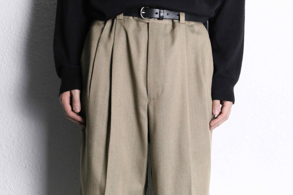 深く取られたタックが腰回りに優雅なボリュームを生み、裾にかけて流れるように落ちるラインはリラックス感とエレガンスを兼ね備えています。