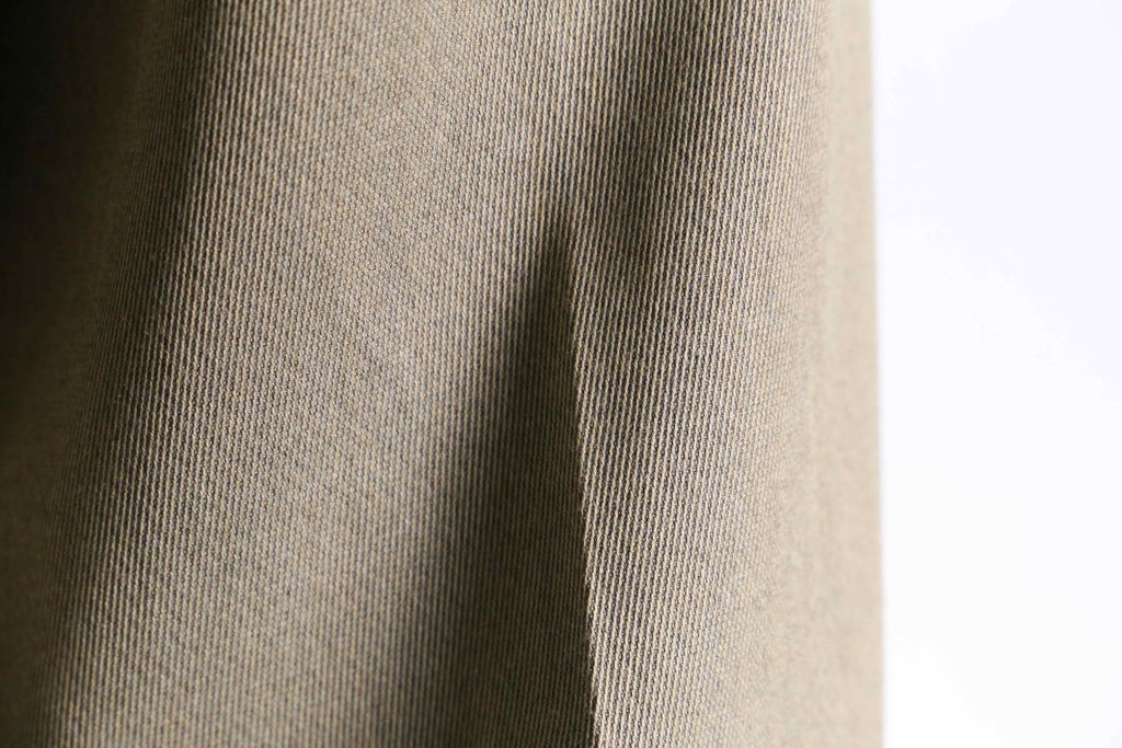 生地はポリエステル65%、レーヨン35%で、とろみのある柔らかな質感と上品な光沢が魅力です。レーヨン混ならではの落ち感と、ポリエステルの耐久性が絶妙なバランスで共存しており、ストレスのない穿き心地を実現。