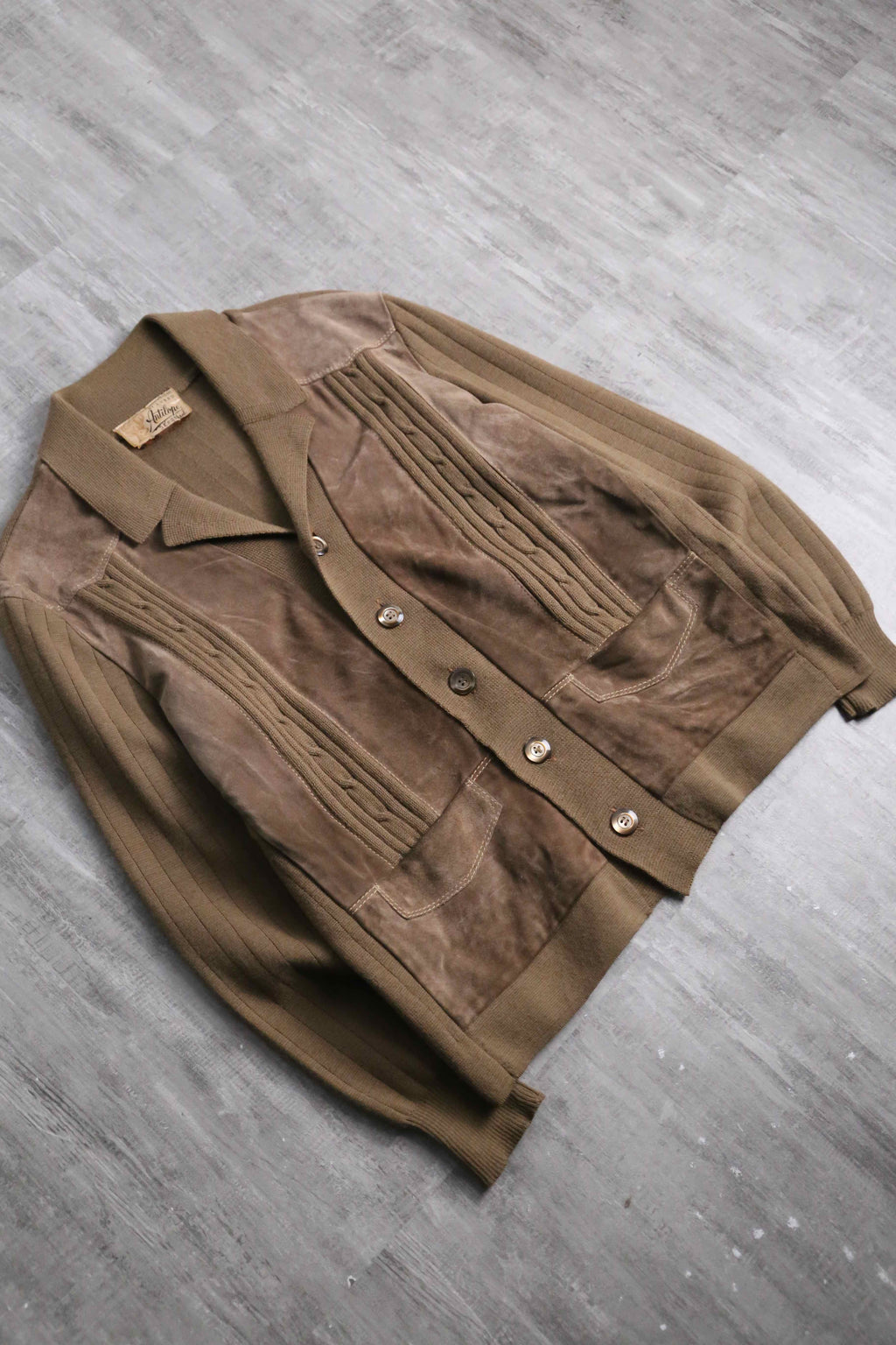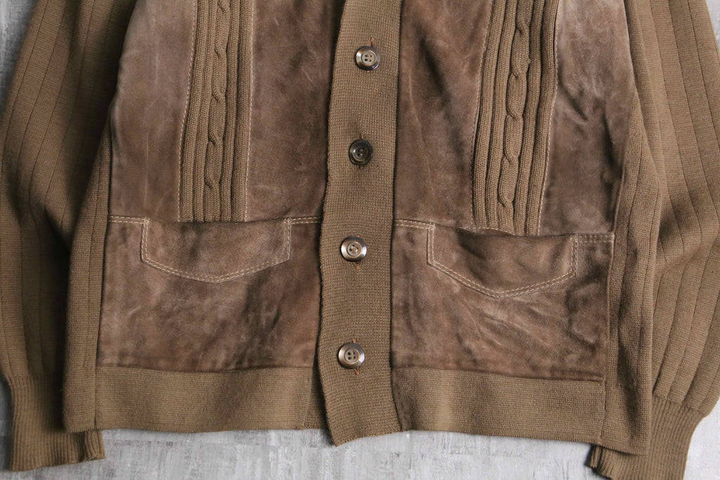 温かみのあるブラウンを基調に、スウェードとニットを贅沢に組み合わせた切り替えジャケット。独特の陰影を生むスウェードの表情と、フロントに配されたケーブル調の編み地、そして袖に走るすっきりとしたリブラインが、上品な立体感を描き出しています。