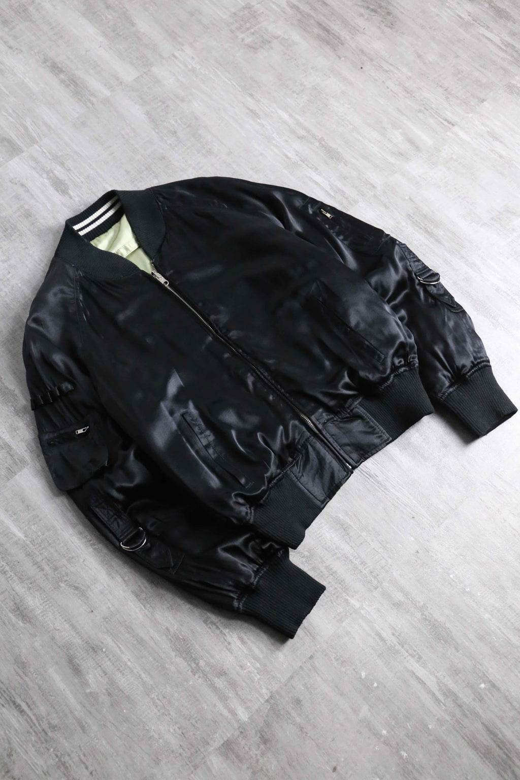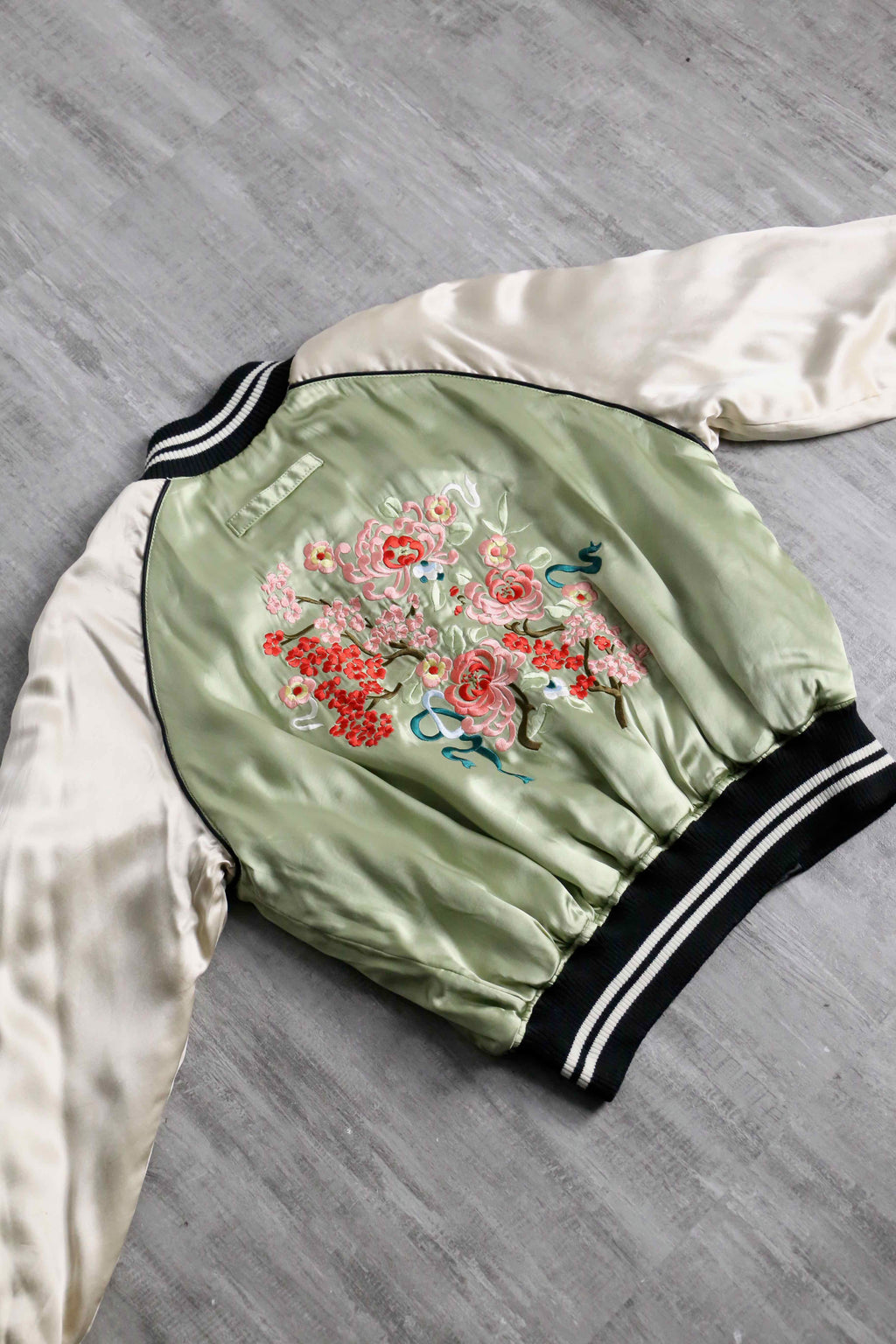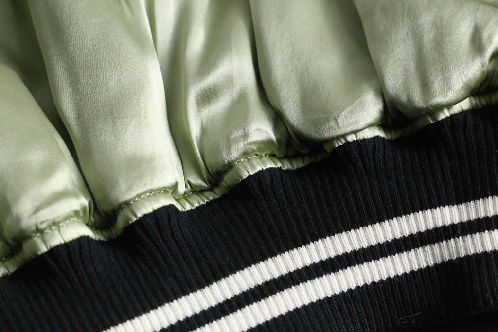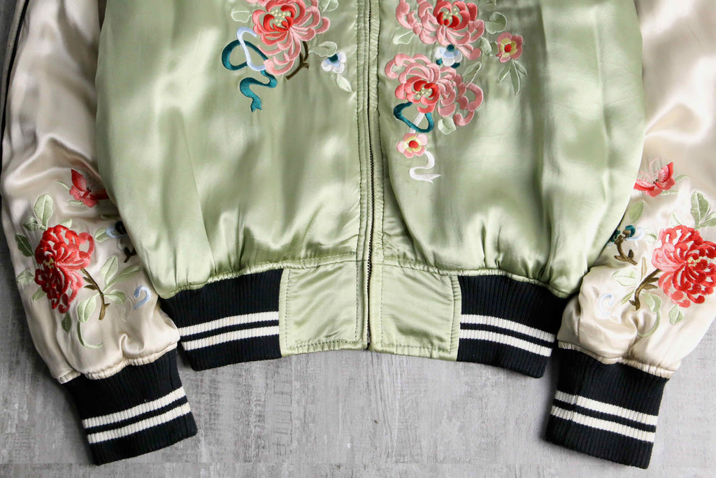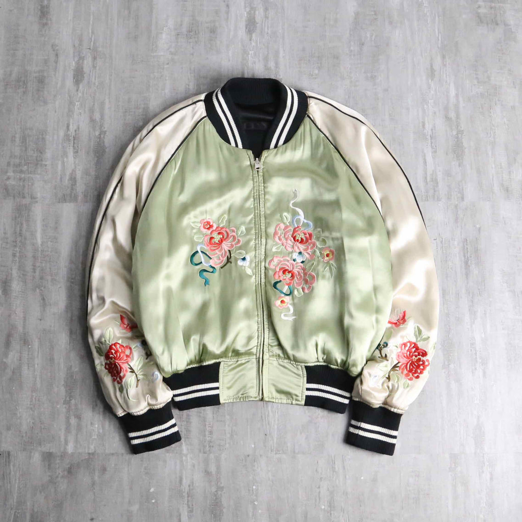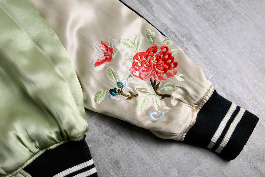 片面は抹茶色のボディにアイボリーのスリーブを組み合わせ、繊細な和花刺繍をあしらった落ち着きあるデザイン。華美になりすぎず、上品な表情です。反対面は無地のブラックでまとめ、ミリタリーライクなディテールがさりげなくアクセントに。表裏でまったく異なる雰囲気を楽しめる完成度の高い一着です。