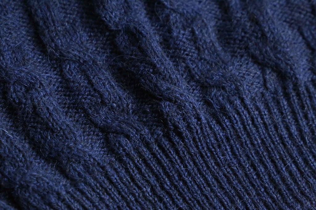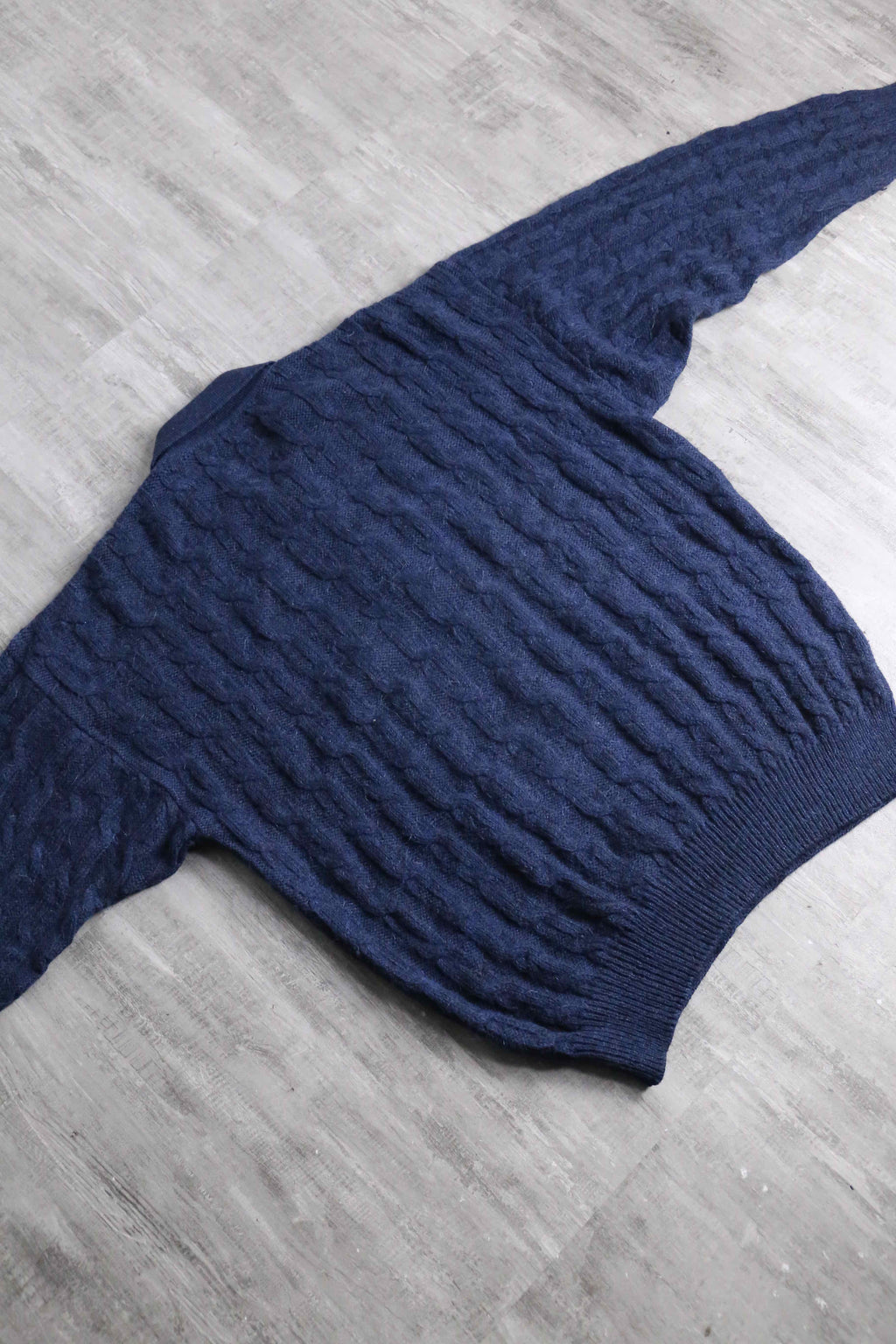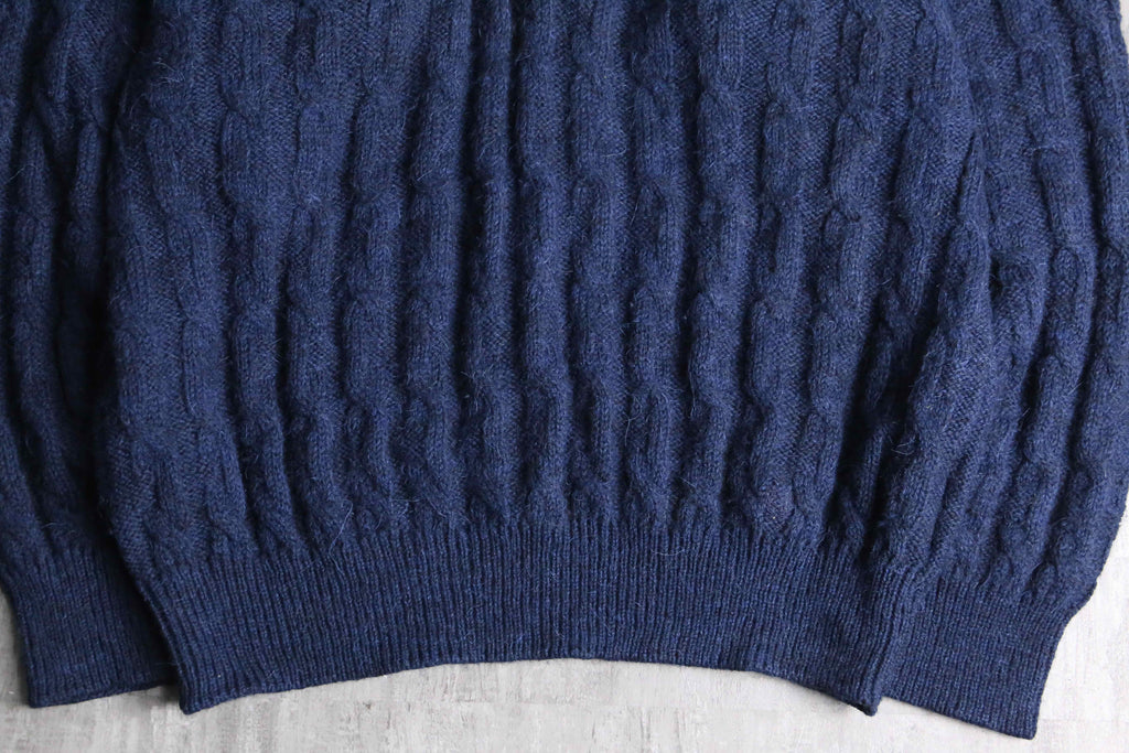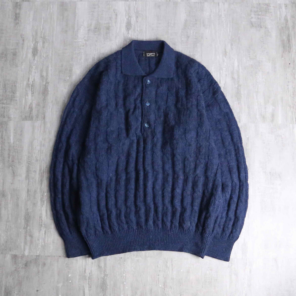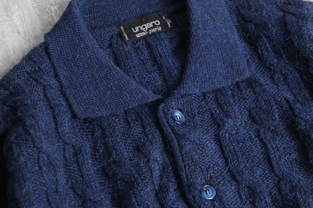 多彩なカラーリングで人気を博した"ungaro"ならではの配色。まだらに映るパーパルはネイビーと相性良く、ボタンもブルーで統一する徹底ぶり。素材はウールにアルパカと防寒面、軽重量という機能性。特にアルパカ毛はラグジュアリーブランド御用達の高級素材です。