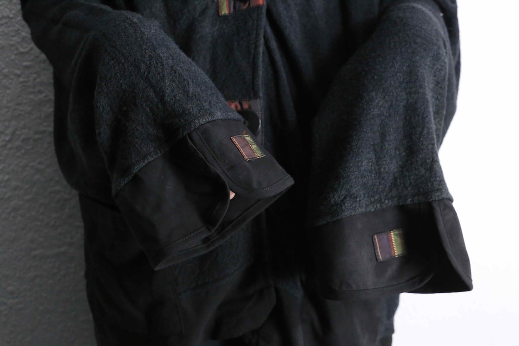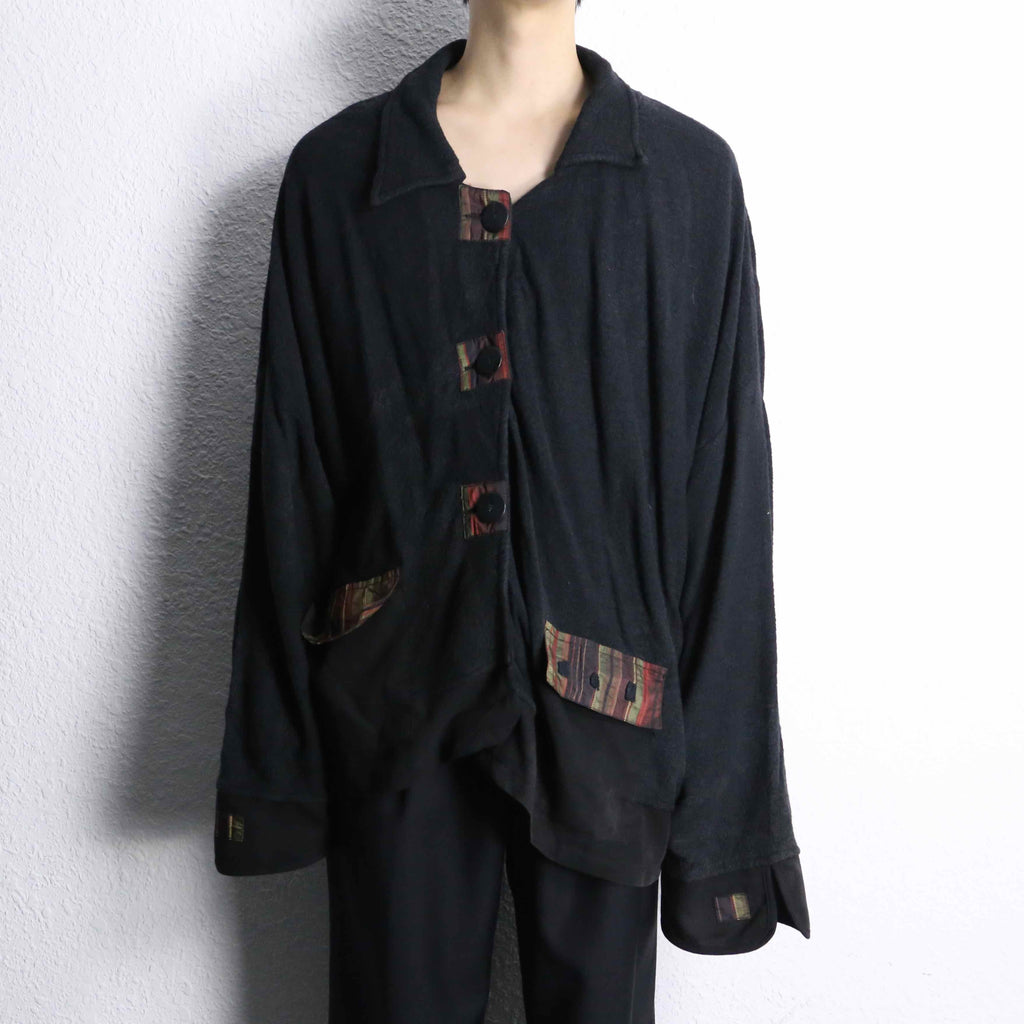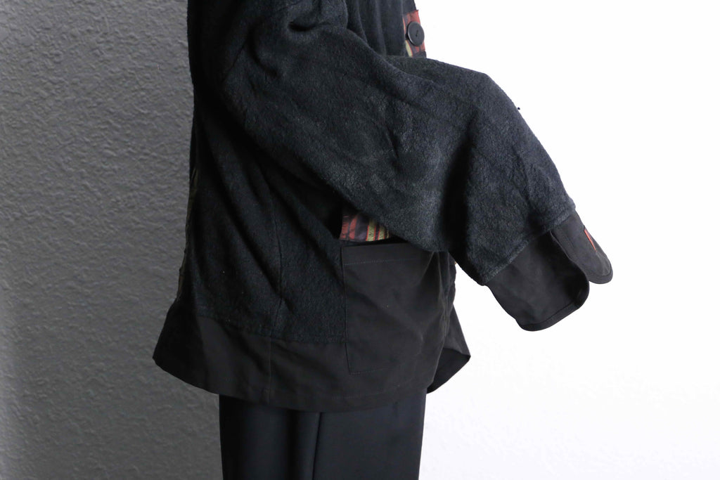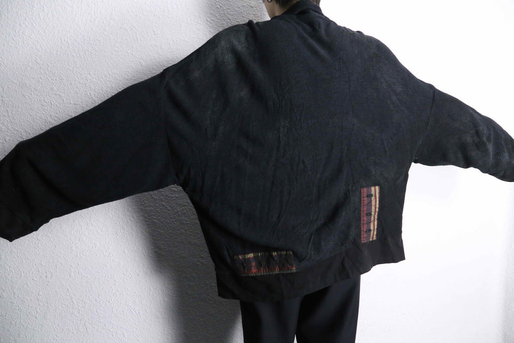 型崩れからか変形されたようなビジュアルになり、より退廃的に古着らしい1着へと昇華されたアイテム。素材はコットン、ウールとは思えないほど薄地。レイヤードのしやすい薄さのため、カーディガンの様な羽織りとしても優秀ですし、そのままシャツとして扱っても面白いかもしれません。