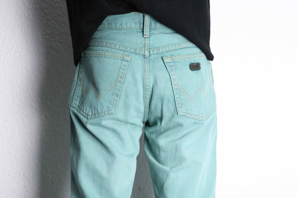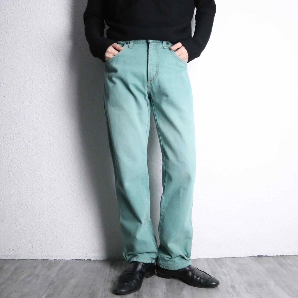 独特なターコイズブルーの色味に惹かれるデニムパンツ。