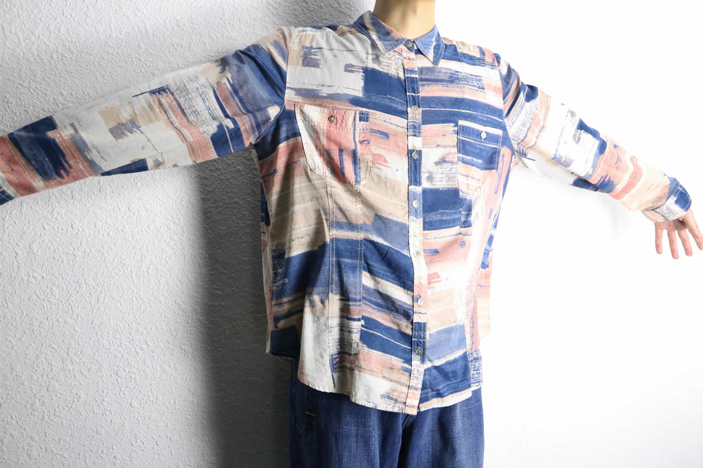 アーティスティックなデザインが施されたシンプルコットンシャツ。柄シャツとなると、シルクやレーヨンを使ったものをよく見かけますが、コットンとなると意外にも古着市場であまり数を見ない稀有な逸品。レディースブランドならではの左前、身幅広めのボックスシルエット。スリッドにはラウンドヘムを採用、パンツのポケットに手を入れた時のシルエットが綺麗に出る優秀なディティール。レディース規格サイズ表記"3"で、メンズでも着用可能なユニセックスアイテム。