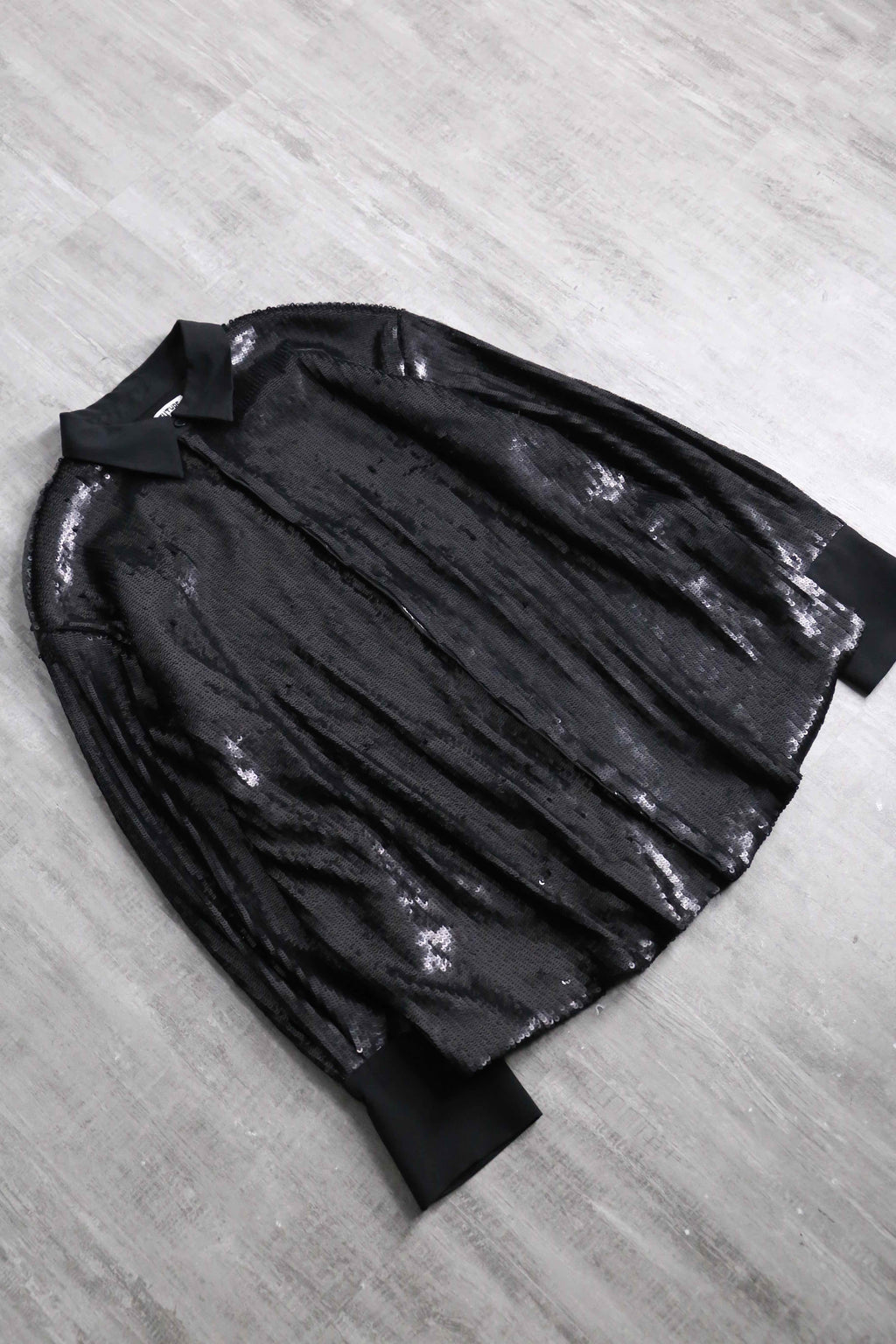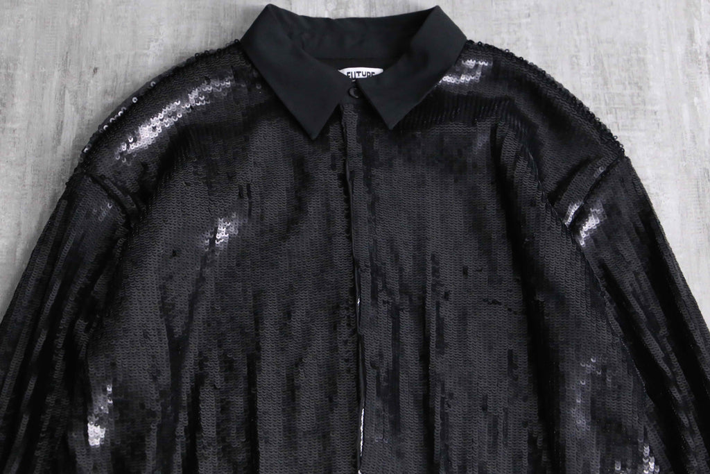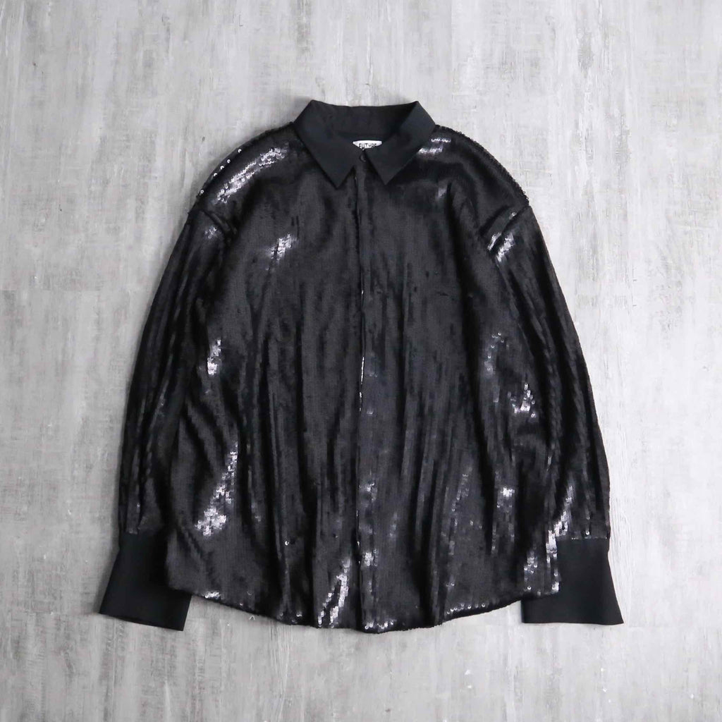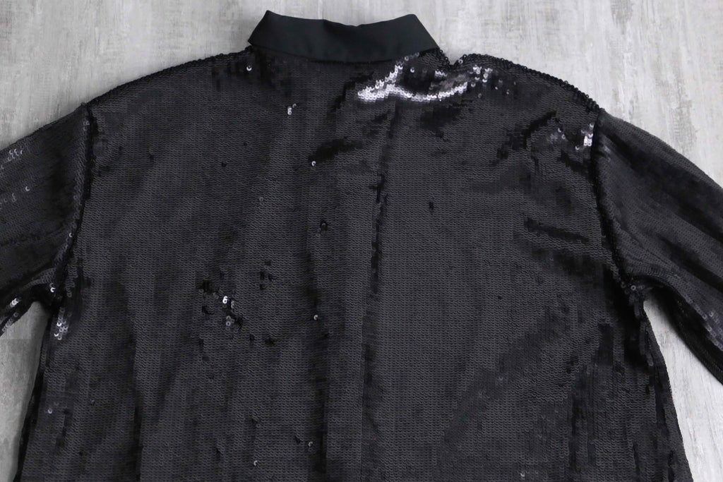 比翼仕立てのスタイリッシュなビジュアルに、重厚感のあるスパンコールがシックな印象。高密度に連なったスパンコールは派手さよりも荘厳な雰囲気が感じられます。一癖あるアイテムなので、スタイリングのアクセントとして優秀なシャツですね。