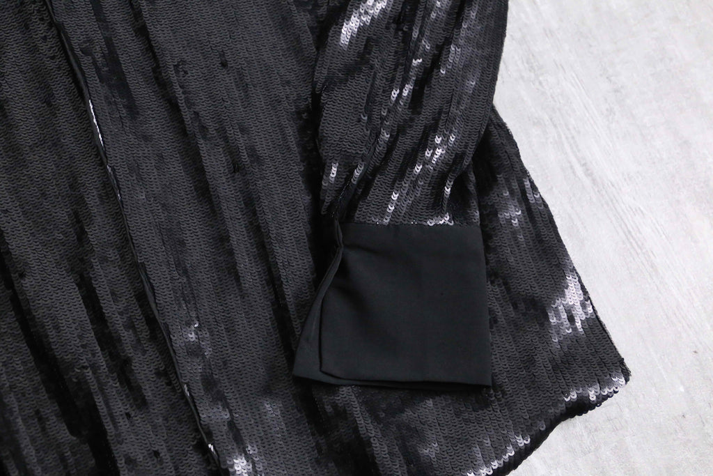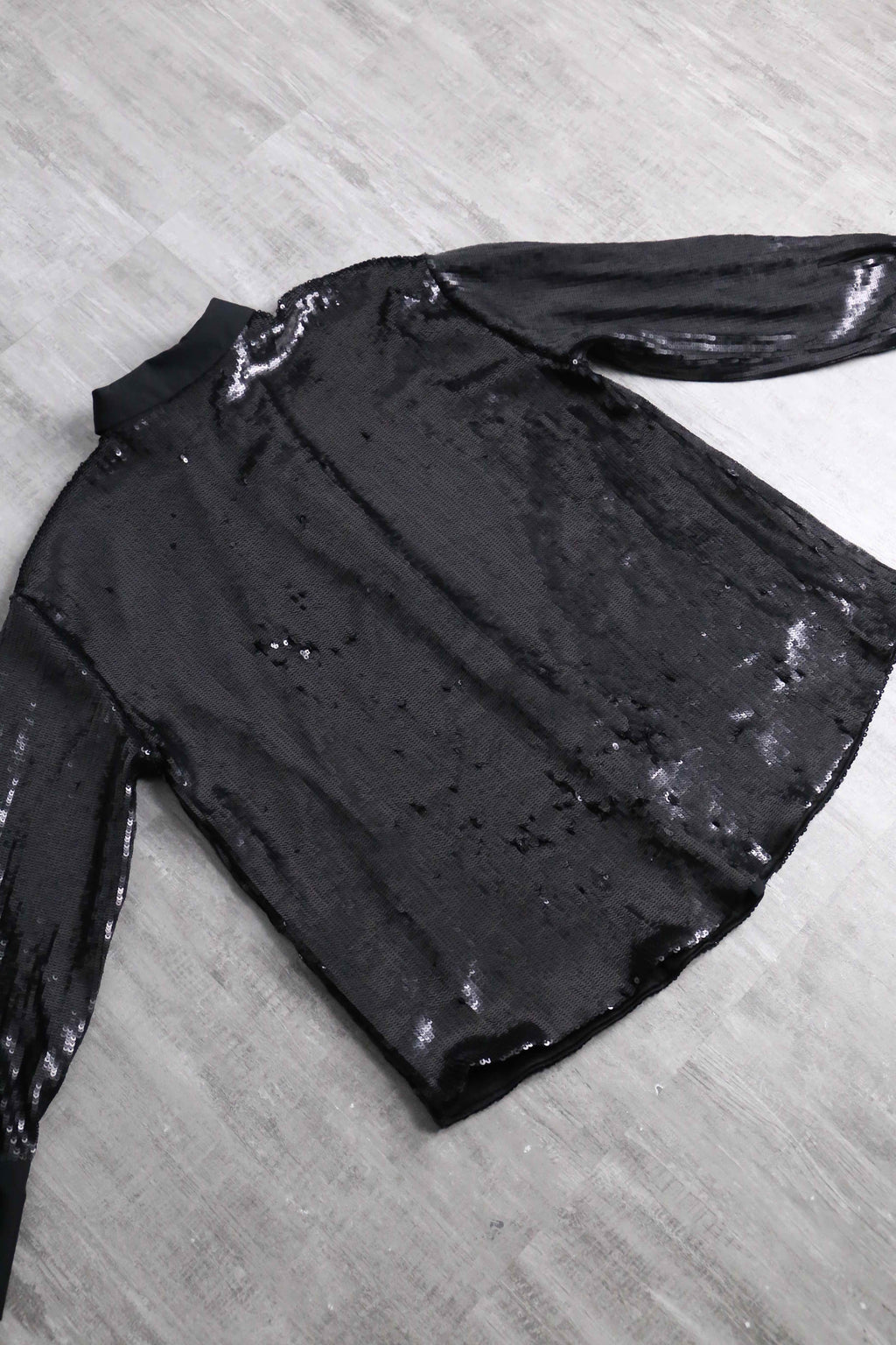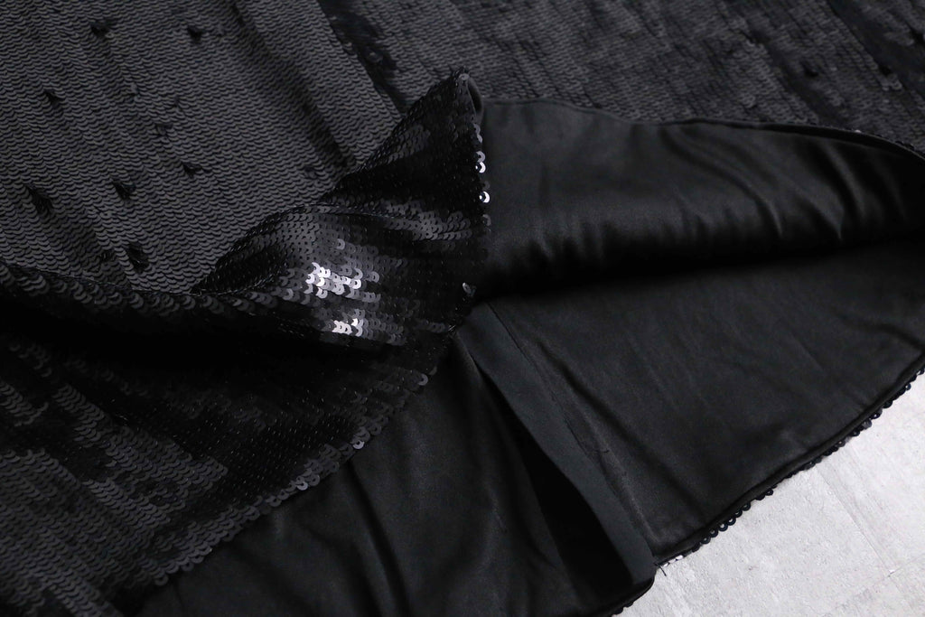 比翼仕立てのスタイリッシュなビジュアルに、重厚感のあるスパンコールがシックな印象。高密度に連なったスパンコールは派手さよりも荘厳な雰囲気が感じられます。一癖あるアイテムなので、スタイリングのアクセントとして優秀なシャツですね。