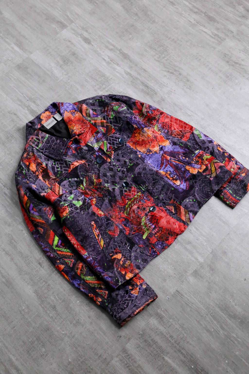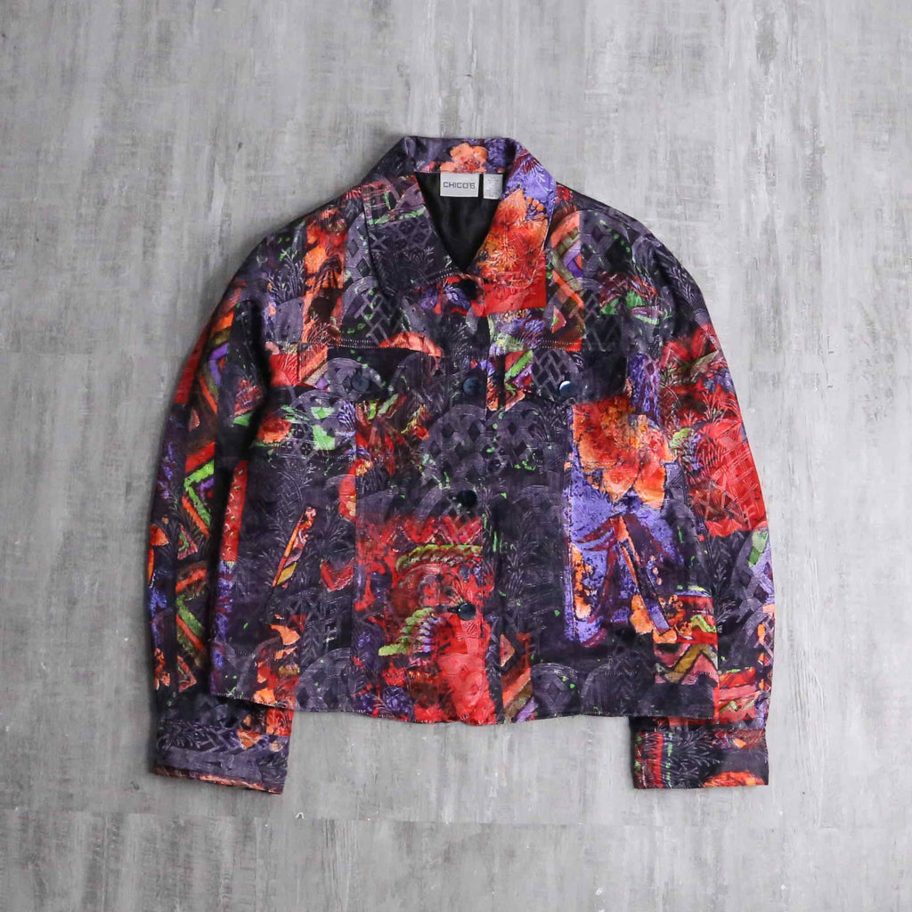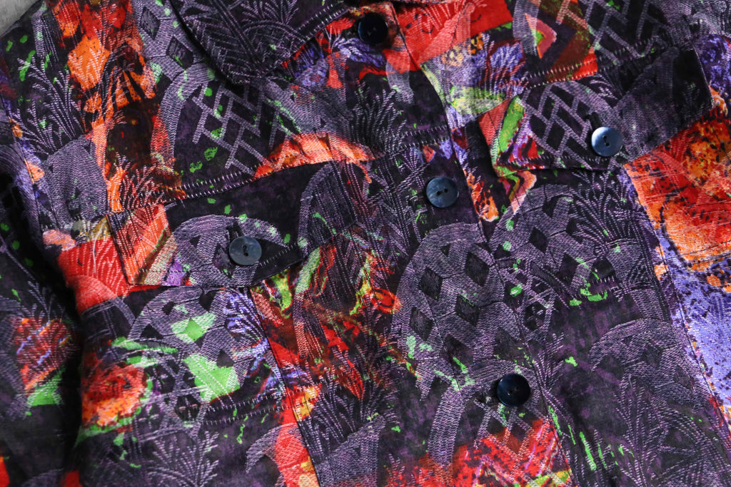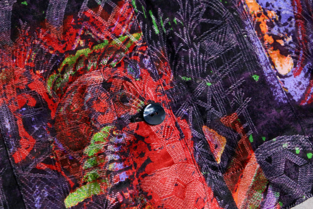 毒毒しいカラーリングと、様々な模様を複雑に組み合わせた総柄がきわ立つデザインジャケット。