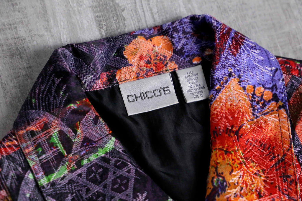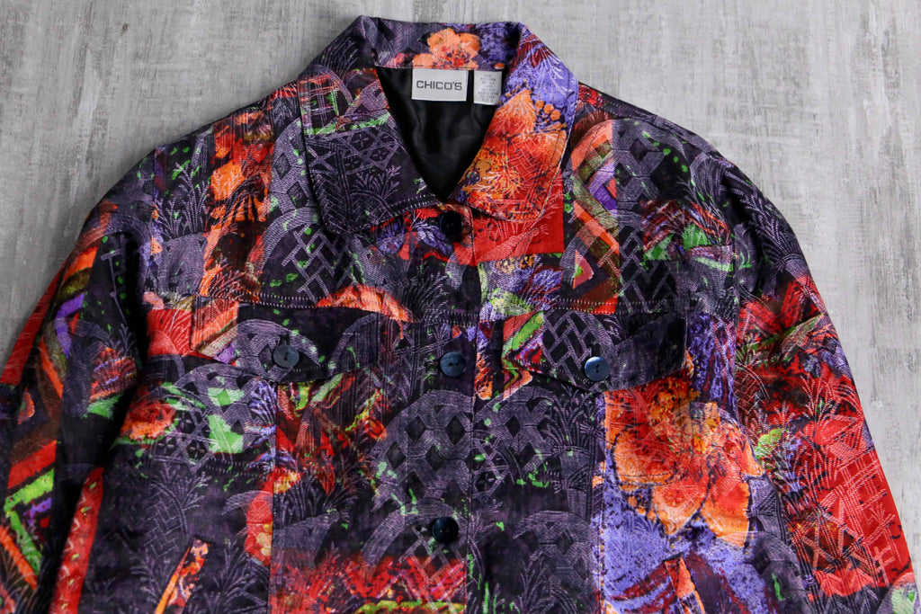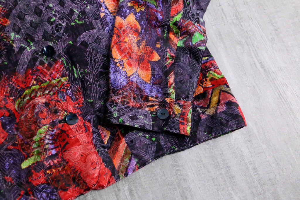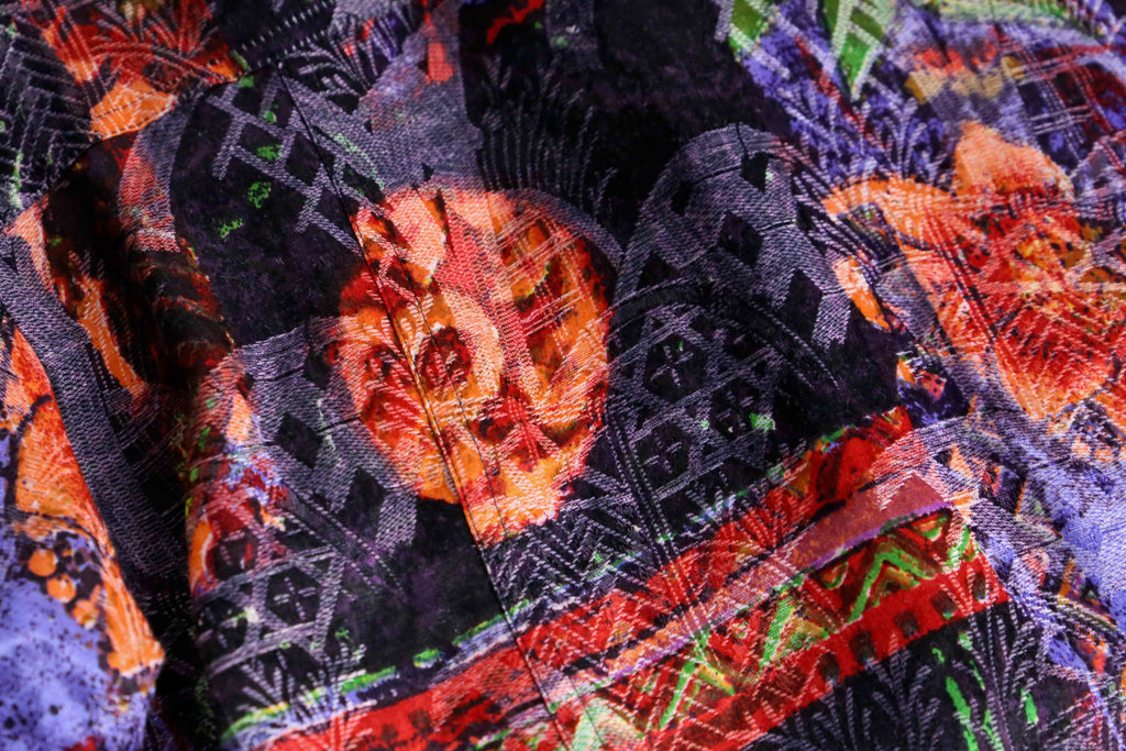 毒毒しいカラーリングと、様々な模様を複雑に組み合わせた総柄がきわ立つデザインジャケット。