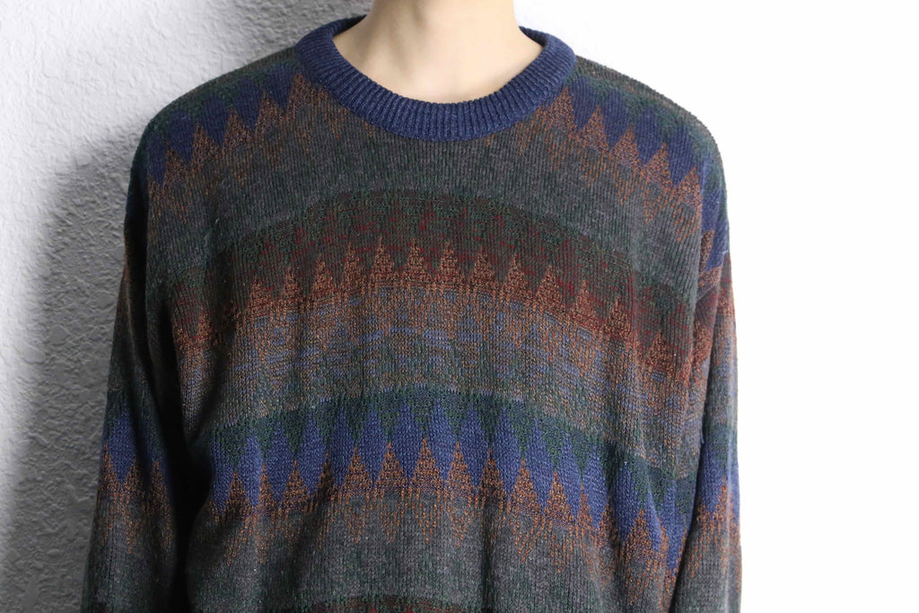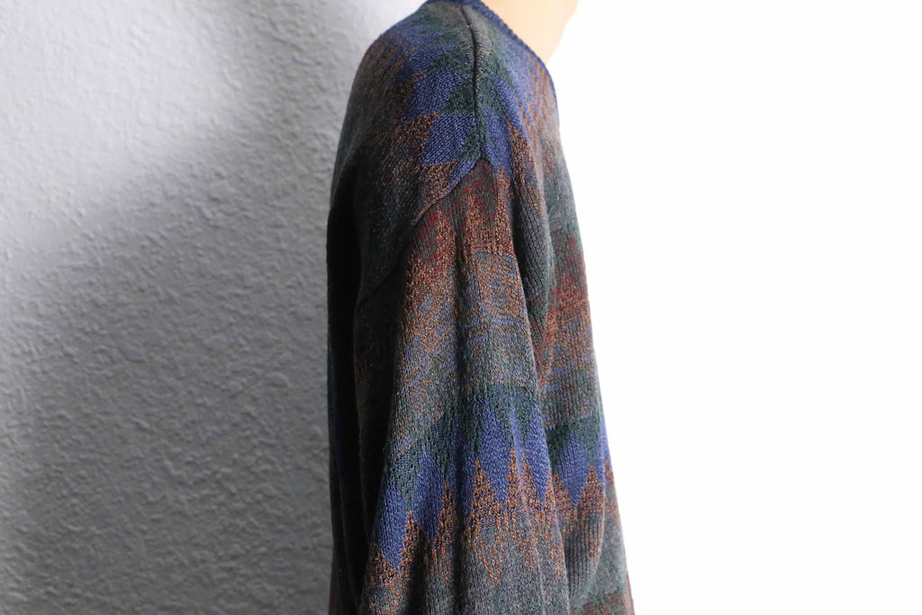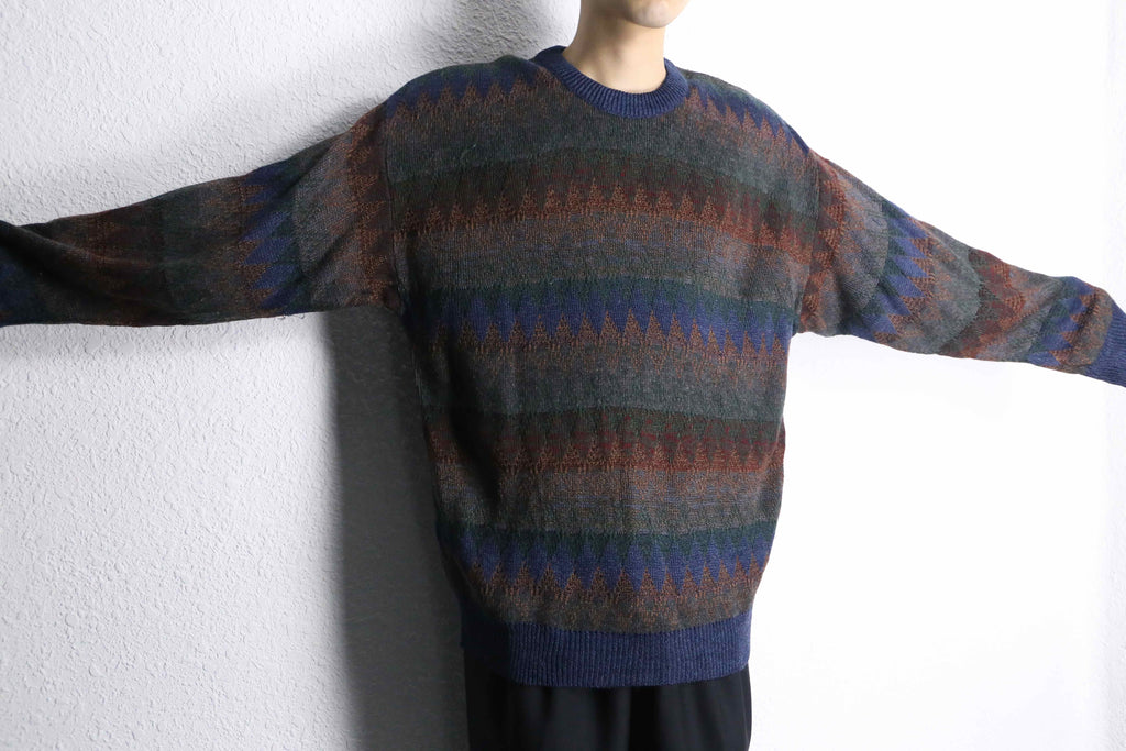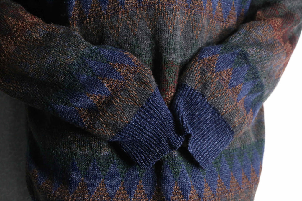 アーガイル柄やジグザグ柄にも見える独特のニュアンスをしており、暖色も混じっていることで古着らしい暖かみのあるビジュアルになっているのかと。着丈は長めかつリブは効いている個体なので、ルーズに着こなしても違和感なく着れるサイズ感です。